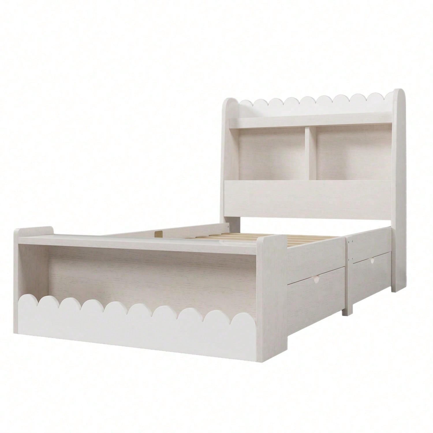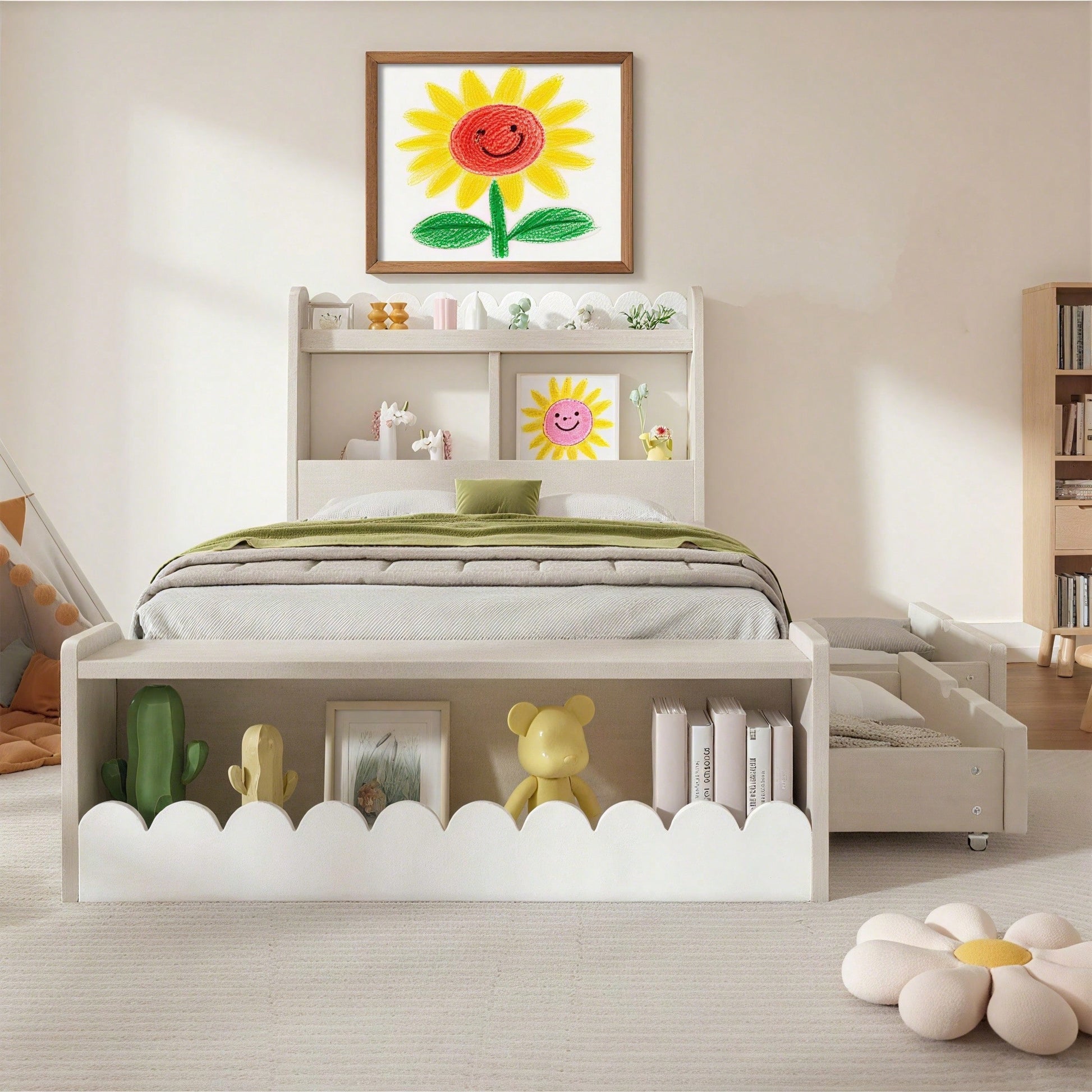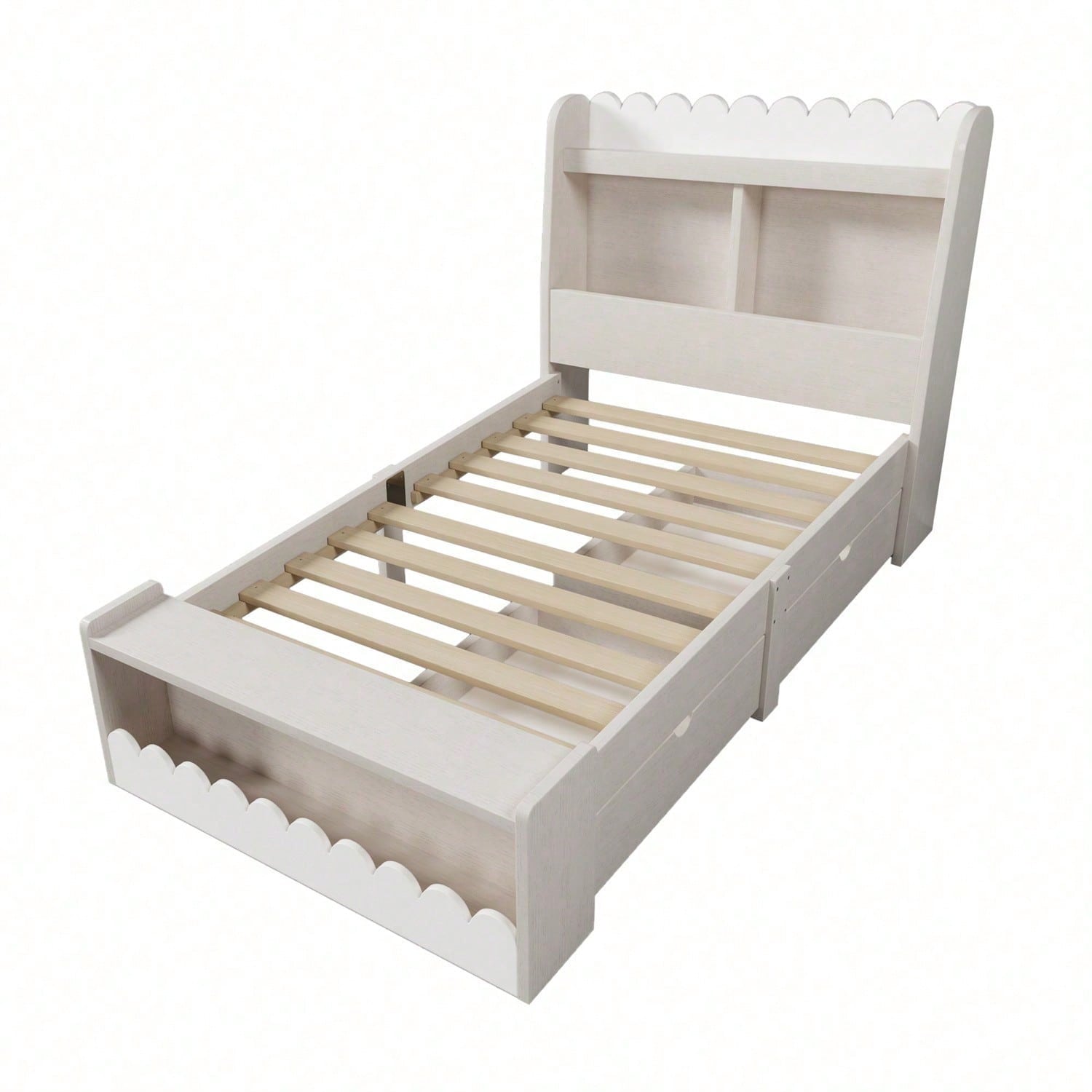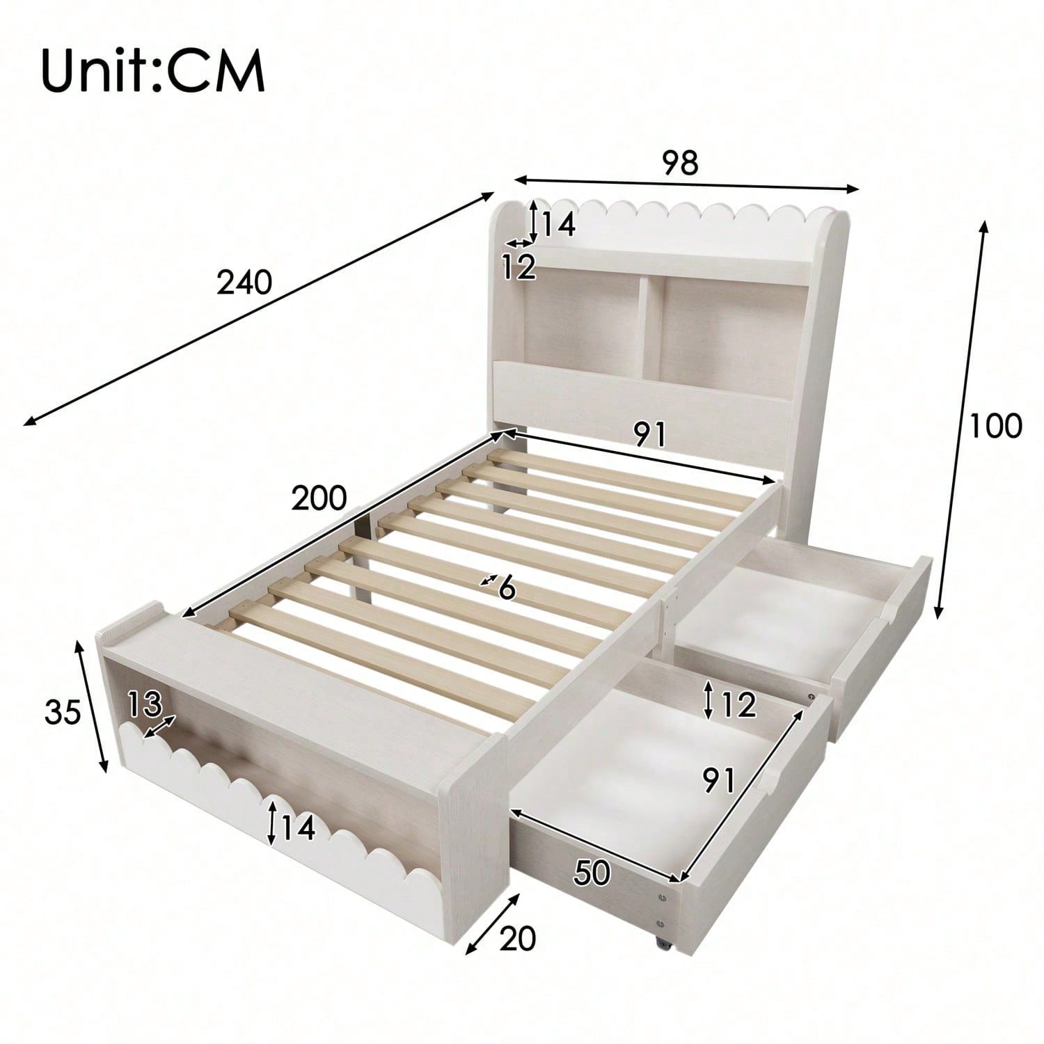 Design exclusif : Le lit arbore des tons blancs et bois, dégageant une beauté fraîche et naturelle sans perdre sa simplicité et son atmosphère. Sa décoration unique en forme de vague confère à la chambre d'enfant une ambiance vivante et pleine de gaieté. Espace de rangement multifonctionnel : Le lit simple est équipé de deux tiroirs de 50 cm de profondeur, qui peuvent être placés à gauche ou à droite selon l'agencement de la pièce. Les tiroirs sont équipés de poignées incurvées et les roulettes inférieures sont conçues pour faciliter le déplacement. Structure stable : Le cadre de lit est en bois massif pour plus de stabilité. La structure encastrée maintient fermement le matelas dans le lit, assurant la de l'enfant pendant son sommeil et améliorant son confort. L'épaisseur de matelas recommandée est de 15 cm. Étagère et banc avec espace de rangement : Des étagères de 13 cm de profondeur sont situées à la tête et au pied du lit, idéales pour ranger livres, réveils, petits bijoux et autres objets, afin de développer l'organisation des enfants. Les étagères sont équipées de bouchons pour éviter les chutes. Une étagère est également présente à la tête du lit pour les objets fréquemment utilisés. Le repose-pieds peut supporter un poids de REMARQUE : Le cadre de lit est livré sans matelas et avec les outils et instructions de base pour un montage rapide. Afin de minimiser les risques de dommages, le cadre de lit sera expédié en deux colis, dont la livraison peut être différente. Si des pièces manquent dans les deux colis, veuillez contacter le service client. Remarque : Le produit n'est pas blanc uni, mais une combinaison de beige-gris avec du grain de bois et du blanc pur. L'image sur la page est la couleur affichée à la lumière du jour. Le grain du bois peut paraître plus gris en basse lumière. Description AB20301314W 90*200 N616P193013W/N616P193014W Dimensions hors tout : 240*98*100 cm (L*l*H) Matériau du panneau : Bois massif + MDF Couleur : Blanc + Votan couleur chêne Matelas compatible (matelas non inclus) : 90*200 cm Épaisseur de matelas recommandée : 15 cm Poids maximal de l'utilisateur : 120 kg Assemblage requis : Oui Contenu du colis : Cadre de lit + sommier à lattes + tiroirs Quantité : 2 Poids brut/net : 53,8 kg/48,8 kg Dimensions intérieures des tiroirs : 91*50*12 cm Design unique : Design ondulé + rangements en tête et en pied de lit