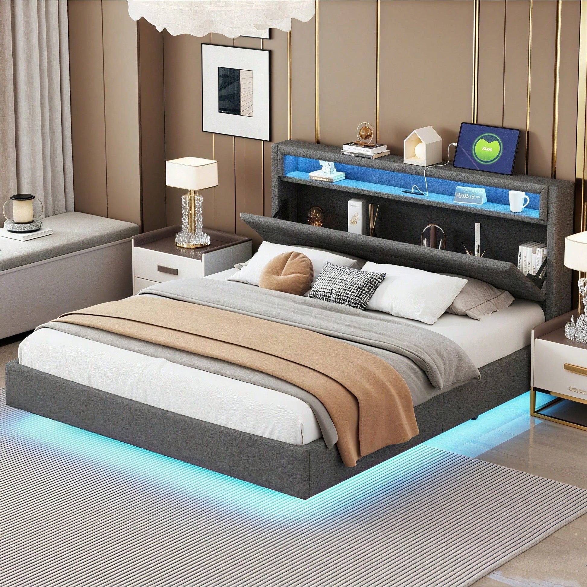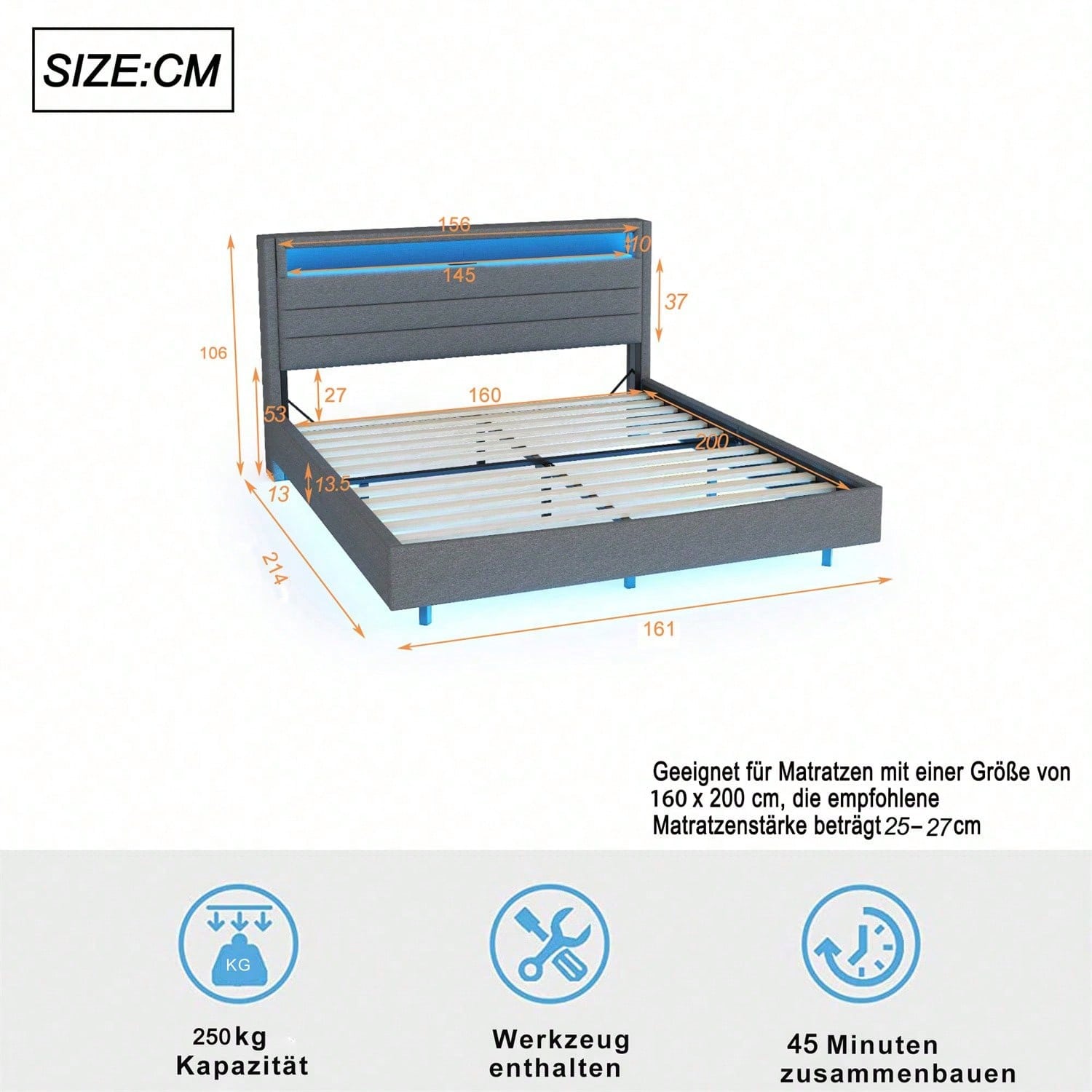 Informations produit Code article : LDU00137AAE Type de produit : Article combiné Nom du produit : Lit rembourré 160 x 200 cm avec port USB et éclairage LED, tête de lit réversible, pied de lit dissimulé, lit double, lit enfant, lit adulte, tissu en lin gris Origine : Chine Couleur principale : Gris Matériau principal : Rembourré Dimensions du lit : 160 cm x 200 cm Utilisation : Chambre Personnalisation : Oui * Un service de personnalisation est disponible pour ce produit. Veuillez contacter le vendeur pour plus de détails. Dimensions du produit Longueur une fois assemblé (cm) : 201,00 Largeur une fois assemblé (cm) : 161,00 Hauteur une fois assemblé (cm) : 108,00 Poids du produit (kg) : 40,00 Dimensions du colis Sous-article 1 : WF321640AAE Quantité : 1 107,5 x 31,5 x 18 cm, 20,44 kg Sous-article 2 : WF321639AAE Quantité : 1 164 x 39,5 x 14,5 cm, 25,34 kg Caractéristiques du produit Table de chevet multifonctionnelle : ce lit rembourré est équipé d'un port USB et de lumières LED pour une recharge facile et un éclairage nocturne. La tête de lit pivotante offre un espace de rangement optimal. Optimisez l'aménagement de votre chambre. Avec des lumières LED changeantes de couleur - Ce lit rembourré est équipé de lumières LED à la tête et au pied du lit, réglables en différentes couleurs pour créer une atmosphère de sommeil unique. Lin - Ce lit double rembourré est fabriqué en lin doux pour la peau, confortable et respirant, résistant à la saleté et à l'usure. Pieds dissimulés et cadre robuste - Les pieds dissimulés confèrent au lit un look unique. Nos cadres de lit sont solidement maintenus par des supports métalliques robustes et des sommiers à lattes pouvant supporter une charge allant jusqu'à 250 kg. Montage facile - Dimensions totales du lit : 201 x 161 x 108 cm avec sommier à lattes (matelas non inclus). Ce lit double rembourré est expédié depuis l'Allemagne en deux colis ; il peut arriver que deux colis n'arrivent pas le même jour. Veuillez prévoir 2 à 3 jours pour la livraison.