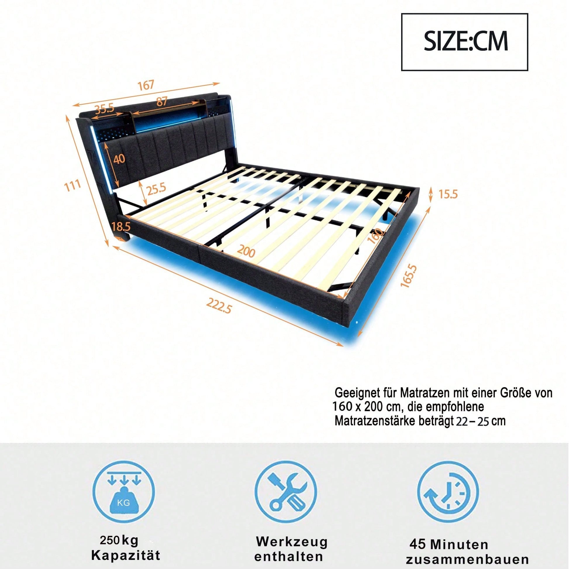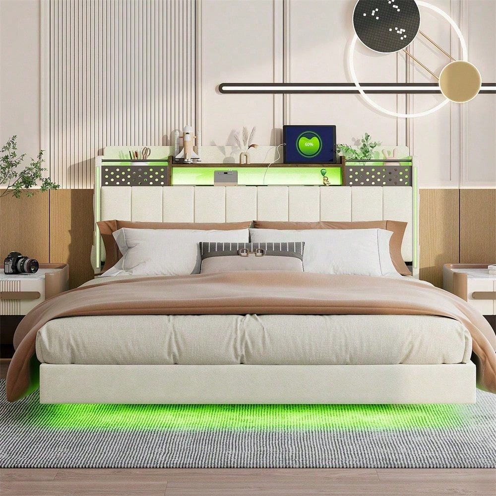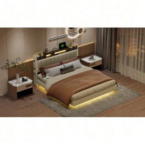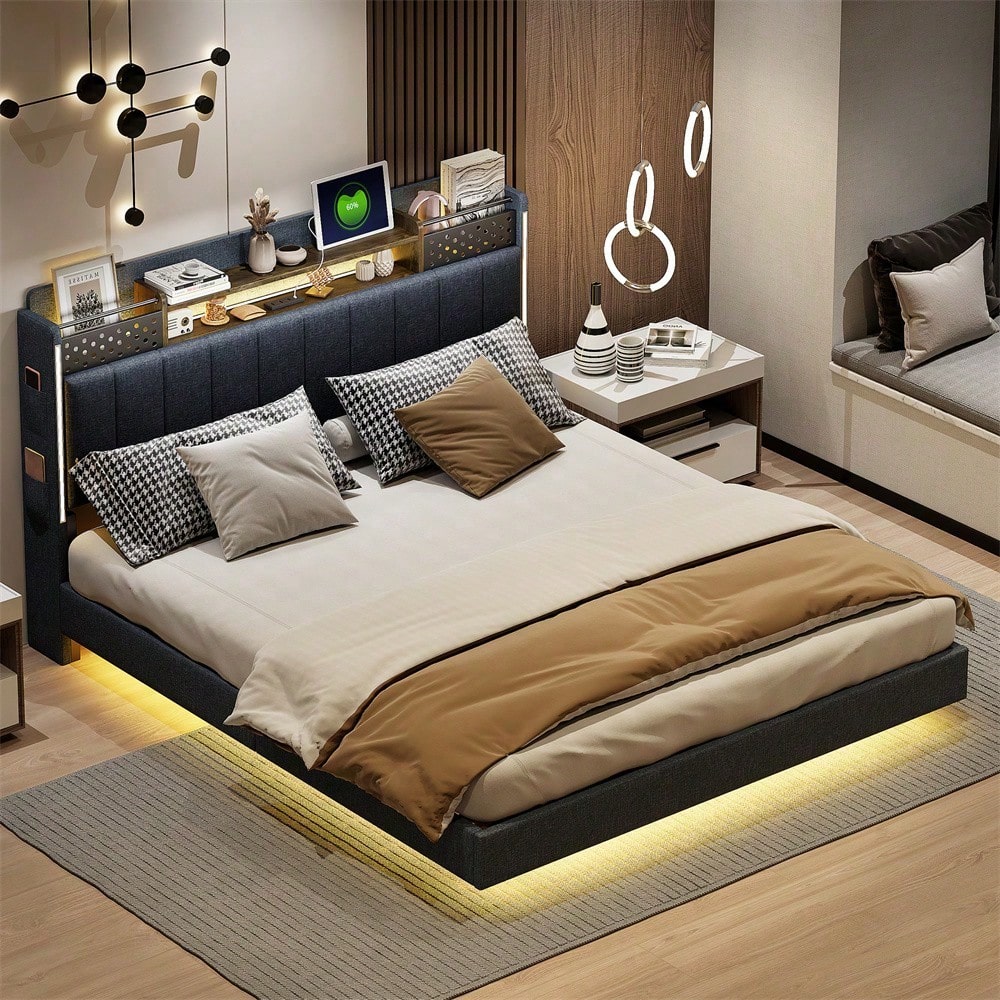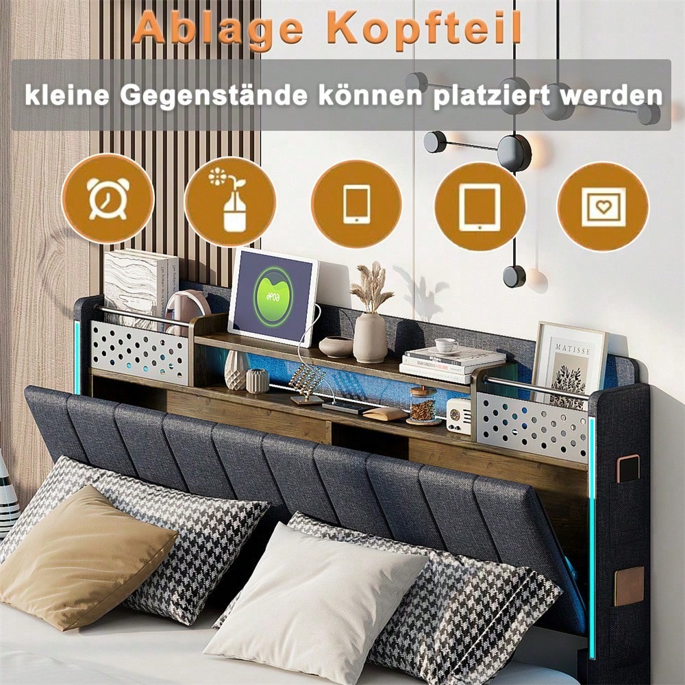 Tête de lit multifonctionnelle - Ce lit capitonné est équipé d'un port USB pour recharger rapidement vos appareils. La tête de lit est équipée d'étagères et de compartiments métalliques pour ranger vos affaires. Dépliée, elle offre un espace de rangement supplémentaire dissimulable, vous permettant d'accéder à vos affaires à tout moment. Avec bande lumineuse LED et poche pour téléphone portable - Les bandes LED entourant la tête et le pied de lit de ce lit capitonné offrent un éclairage nocturne et créent une ambiance unique. Les pieds de chaque côté du lit sont dotés de petits compartiments de rangement pour votre téléphone portable. Pieds dissimulés - Leur conception confère à ce lit capitonné un aspect flottant et une touche de modernité. Le lit est conçu dans un style qui s'intègre parfaitement à une variété de décorations de chambre. Lin - Ce lit capitonné est fabriqué en lin de haute qualité, disponible en beige et gris. Il est confortable, respirant, résistant aux taches et à l'usure. Robuste et facile à monter – Le cadre de lit est composé d'un sommier à lattes et de supports métalliques, offrant un soutien dense et solide, avec une capacité de charge allant jusqu'à 250 kg. Les dimensions totales du lit sont de 222,5 x 165,5 x 111 cm avec sommier à lattes (matelas non inclus). Ce lit double rembourré est expédié en deux colis depuis l'Allemagne ; il peut arriver que deux colis n'arrivent pas le même jour. Veuillez prévoir un délai de livraison de 2 à 3 jours supplémentaires.