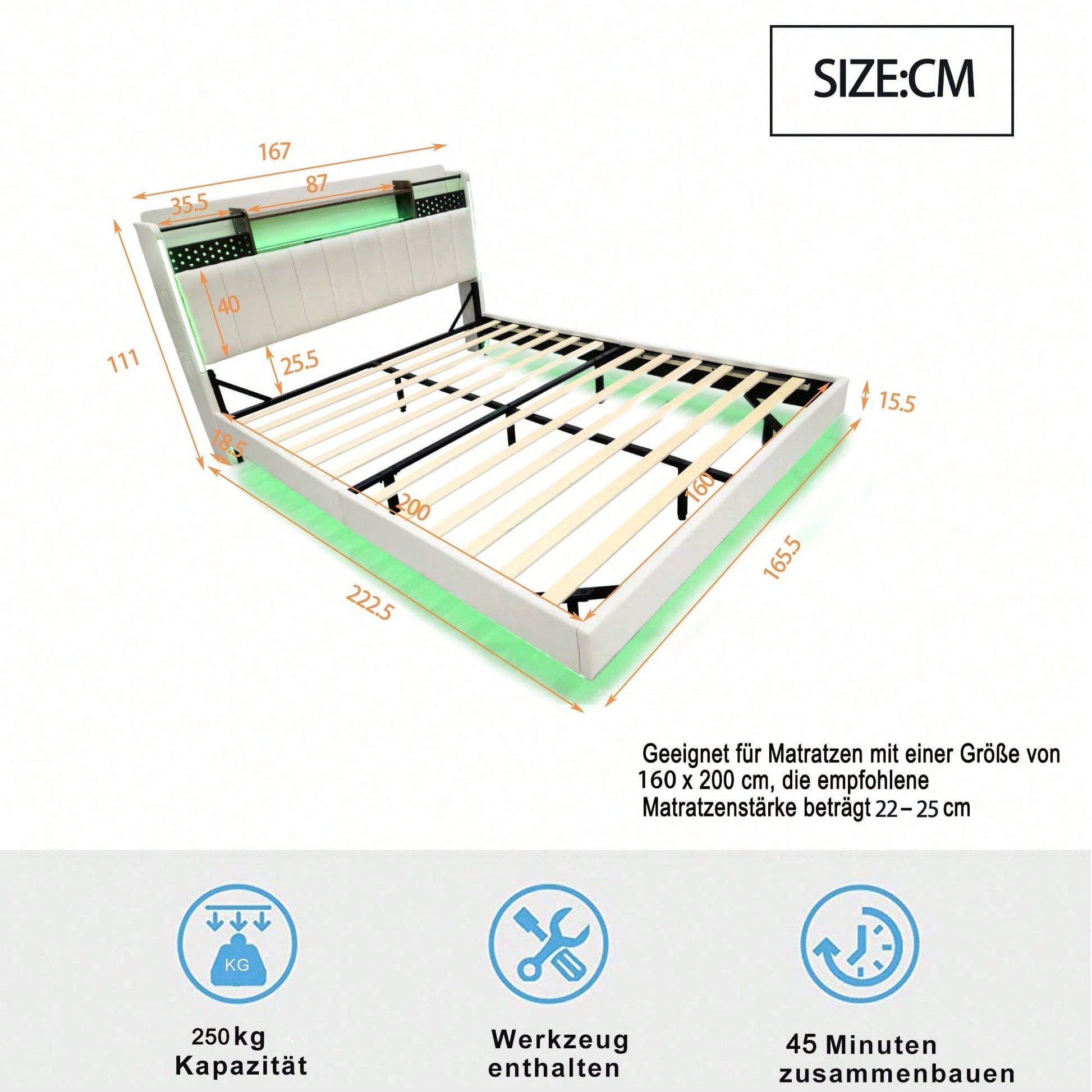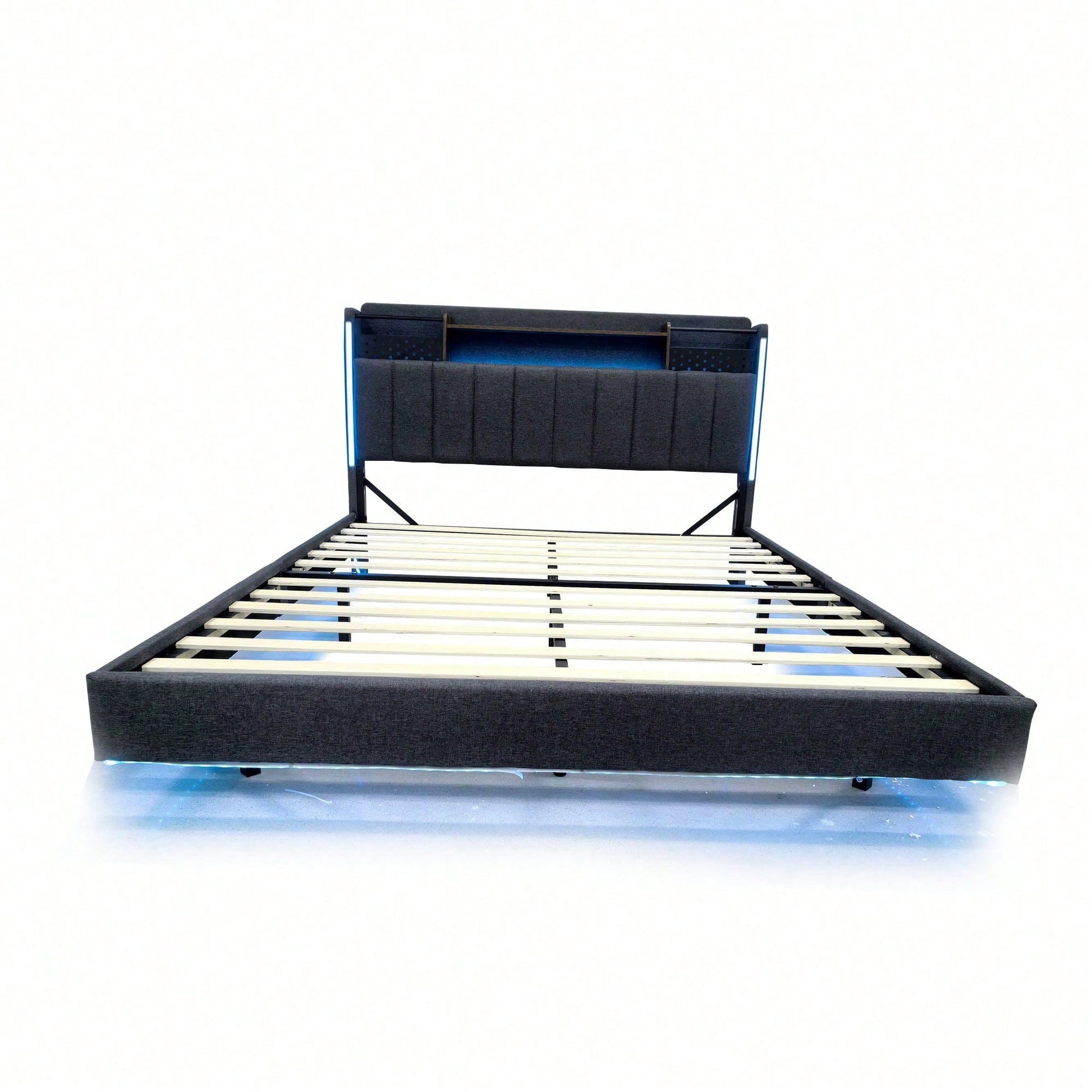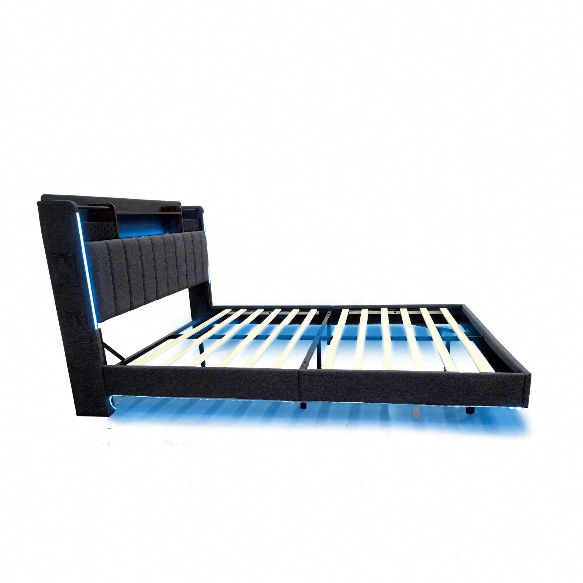 Tête de lit multifonctionnelle - Ce lit capitonné est équipé d'un port USB pour recharger rapidement vos appareils. La tête de lit est équipée d'étagères et de compartiments métalliques pour ranger vos affaires. Dépliée, elle offre un espace de rangement supplémentaire dissimulable, vous permettant d'accéder à vos affaires à tout moment. Avec bande lumineuse LED et poche pour téléphone portable - Les bandes LED entourant la tête et le pied de lit de ce lit capitonné offrent un éclairage nocturne et créent une ambiance unique. Les pieds de chaque côté du lit sont dotés de petits compartiments de rangement pour votre téléphone portable. Pieds dissimulés - Leur conception confère à ce lit capitonné un aspect flottant et une touche de modernité. Le lit est conçu dans un style qui s'intègre parfaitement à une variété de décorations de chambre. Lin - Ce lit capitonné est fabriqué en lin de haute qualité, disponible en beige et gris. Il est confortable, respirant, résistant aux taches et à l'usure. Robuste et facile à monter – Le cadre de lit est composé d'un sommier à lattes et de supports métalliques, offrant un soutien dense et solide, avec une capacité de charge allant jusqu'à 250 kg. Les dimensions totales du lit sont de 222,5 x 165,5 x 111 cm avec sommier à lattes (matelas non inclus). Ce lit double rembourré est expédié en deux colis depuis l'Allemagne ; il peut arriver que deux colis n'arrivent pas le même jour. Veuillez prévoir un délai de livraison de 2 à 3 jours supplémentaires.