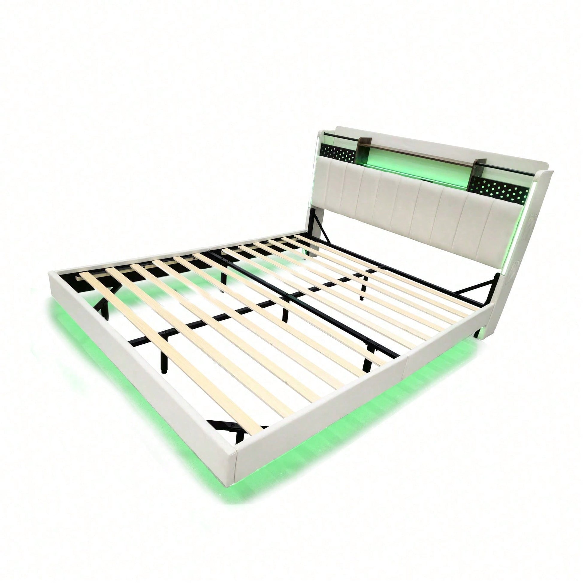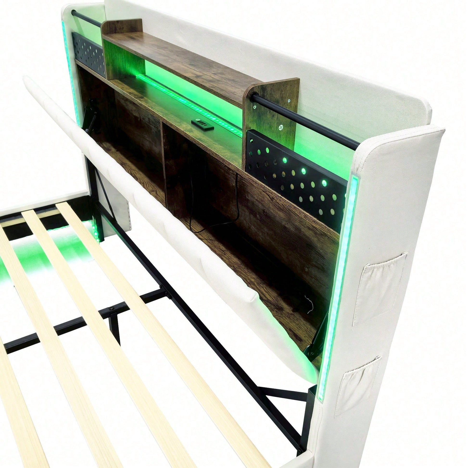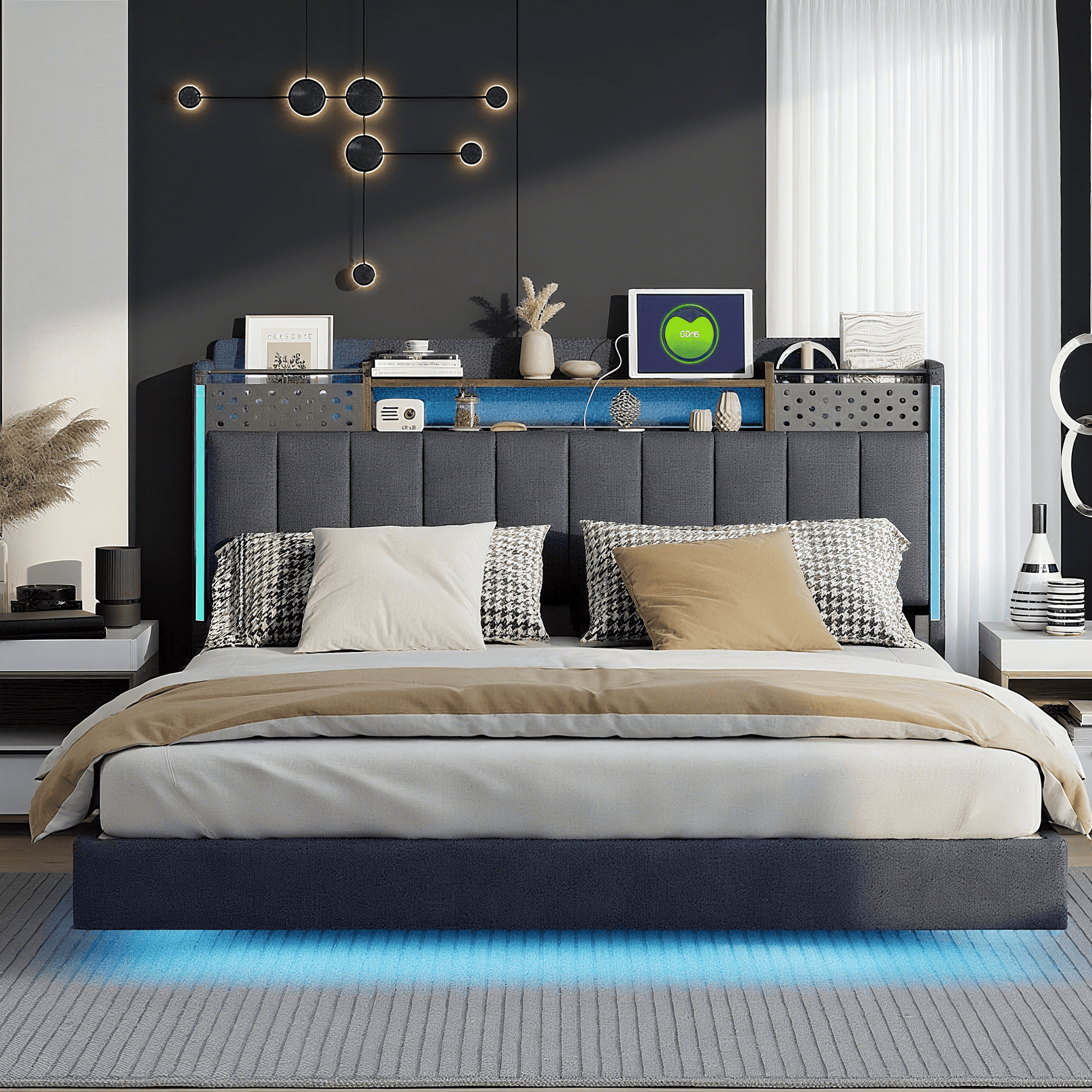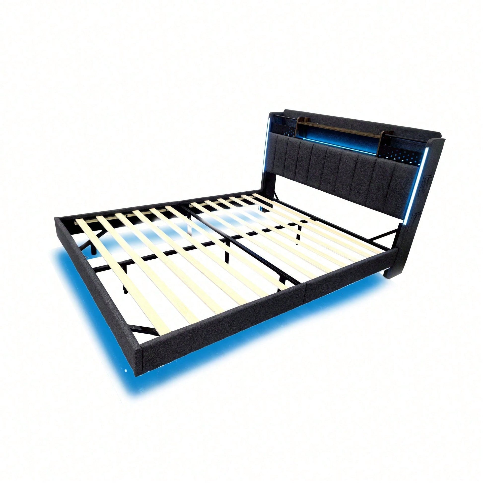 Tête de lit multifonctionnelle - Ce lit capitonné est équipé d'un port USB pour recharger rapidement vos appareils. La tête de lit est équipée d'étagères et de compartiments métalliques pour ranger vos affaires. Dépliée, elle offre un espace de rangement supplémentaire dissimulable, vous permettant d'accéder à vos affaires à tout moment. Avec bande lumineuse LED et poche pour téléphone portable - Les bandes LED entourant la tête et le pied de lit de ce lit capitonné offrent un éclairage nocturne et créent une ambiance unique. Les pieds de chaque côté du lit sont dotés de petits compartiments de rangement pour votre téléphone portable. Pieds dissimulés - Leur conception confère à ce lit capitonné un aspect flottant et une touche de modernité. Le lit est conçu dans un style qui s'intègre parfaitement à une variété de décorations de chambre. Lin - Ce lit capitonné est fabriqué en lin de haute qualité, disponible en beige et gris. Il est confortable, respirant, résistant aux taches et à l'usure. Robuste et facile à monter – Le cadre de lit est composé d'un sommier à lattes et de supports métalliques, offrant un soutien dense et solide, avec une capacité de charge allant jusqu'à 250 kg. Les dimensions totales du lit sont de 222,5 x 165,5 x 111 cm avec sommier à lattes (matelas non inclus). Ce lit double rembourré est expédié en deux colis depuis l'Allemagne ; il peut arriver que deux colis n'arrivent pas le même jour. Veuillez prévoir un délai de livraison de 2 à 3 jours supplémentaires.