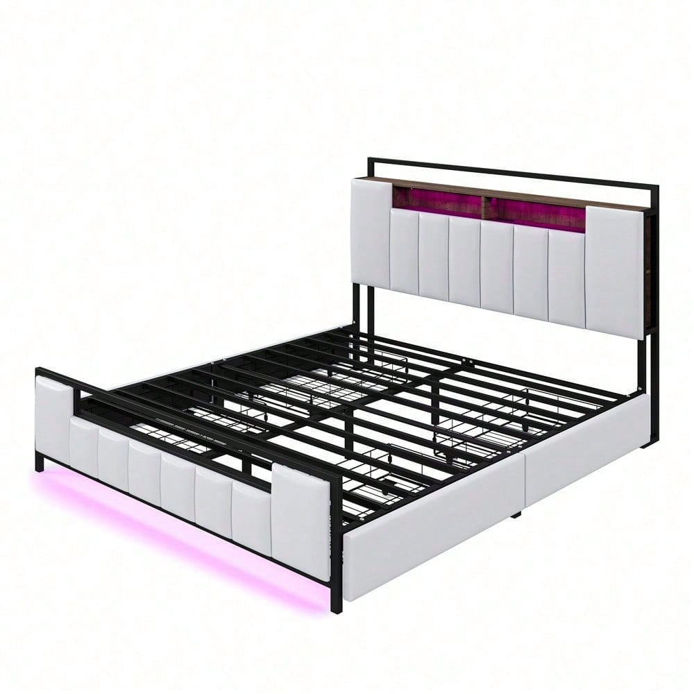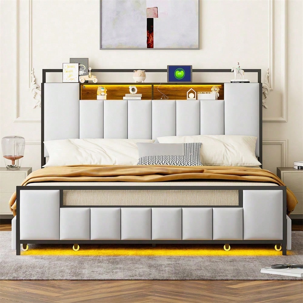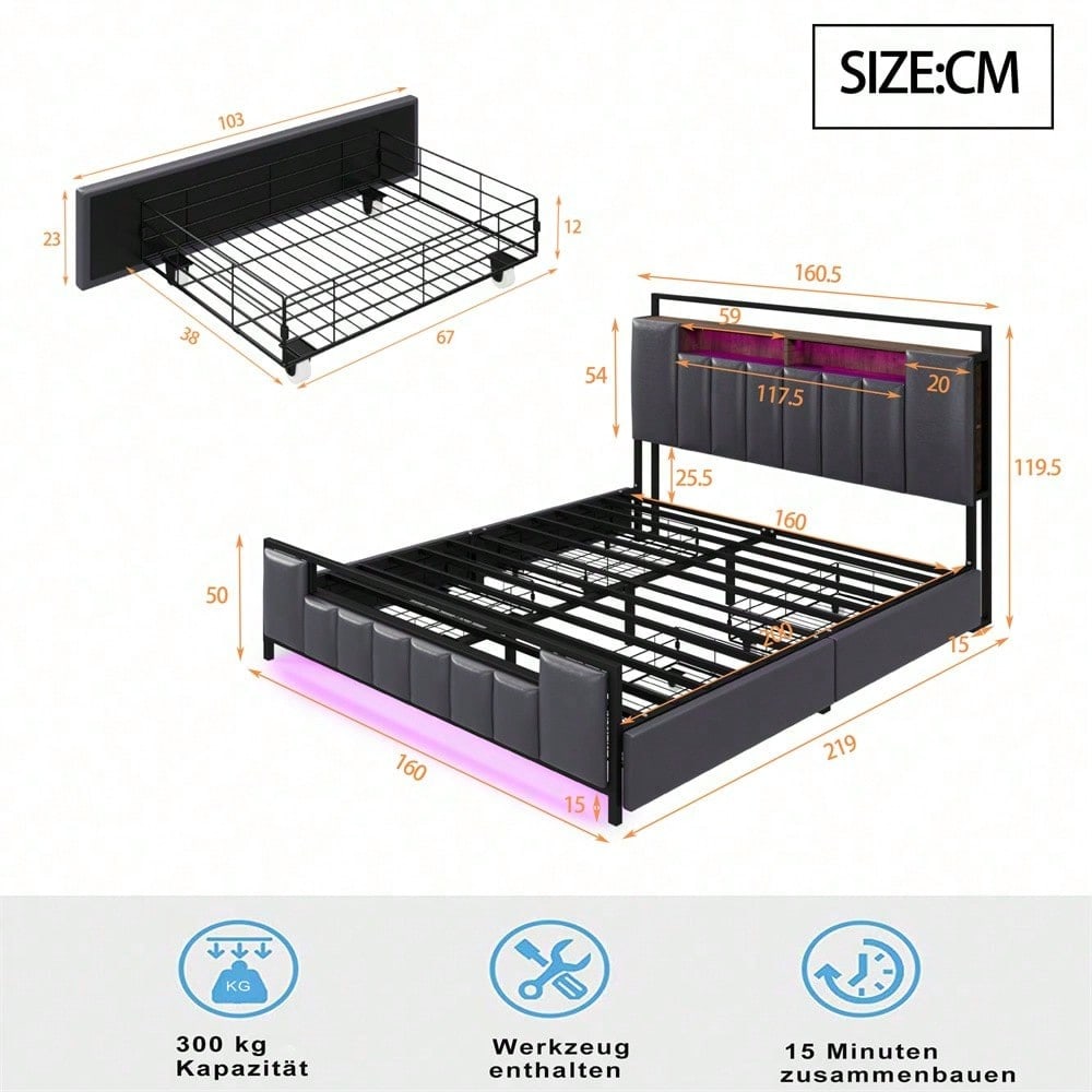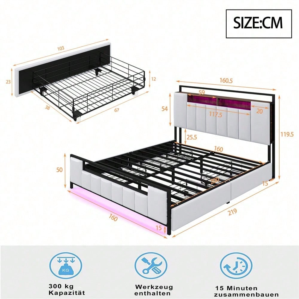 Découvrez l'alliance parfaite du style et de la fonctionnalité avec notre lit capitonné polyvalent. Doté de LED en tête et en pied de lit, ce lit crée un espace de sommeil moderne et confortable. Grâce au port USB pratique situé sur la tête de lit, vous pouvez facilement recharger vos appareils pendant votre sommeil. La tête de lit est dotée d'un compartiment de rangement interne pour garder vos essentiels organisés et à portée de main. Le cadre de lit entièrement en fer assure une grande capacité de charge et une grande durabilité. Disponible en blanc et gris, le lit est doté d'un revêtement en similicuir qui s'harmonise avec tous les styles de chambre. Conçu pour le confort et la praticité, ce lit crée un environnement de sommeil paisible et organisé. Poids et dimensions : Dimensions totales du produit : 219 x 160 x 119,5 cm Dimensions détaillées du produit : Veuillez vous référer à l'image des tailles Nombre de colis : 3 Poids total du produit : 67 kg Capacité de charge : 300 g Épaisseur de matelas recommandée : 22-25 cm Caractéristiques : Type de produit : Lit modulable Dimensions : 160 x 200 cm Couleur : Blanc/Gris Matériau du produit : Similicuir + Métal + Contreplaqué + MDF Niveau d'assemblage : Assemblage complet requis/Assemblage partiel Poids total du colis : 74,5 kg Nombre de lattes : 12 Temps de montage estimé : 2 heures Nombre de personnes recommandé : 2 Outils supplémentaires requis : Tous les outils sont inclus/Tournevis Éviter l'utilisation d'outils électriques : Oui
