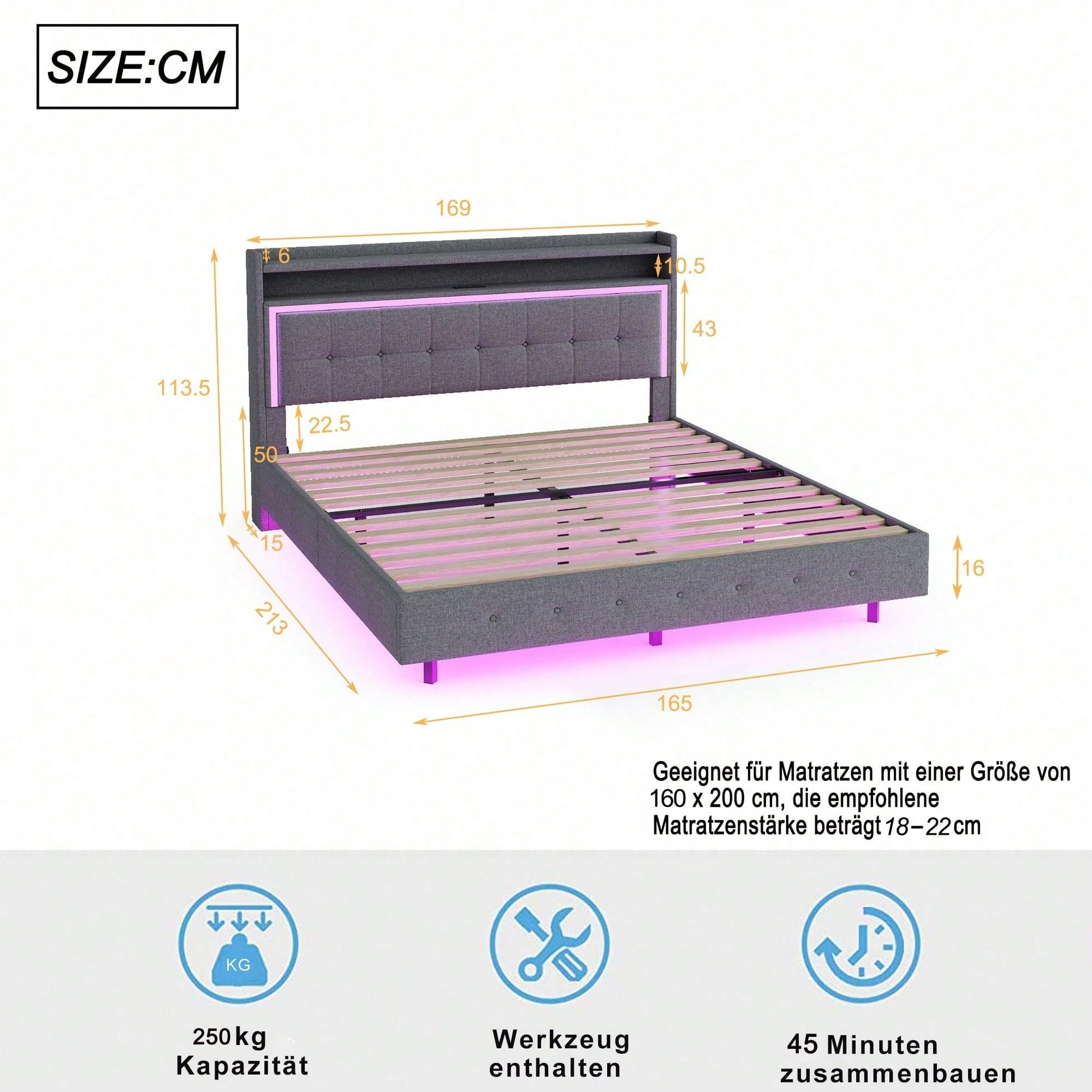 Informations produit Code article : LDU00139AAE Type de produit : Article combiné Nom du produit : Lit rembourré 160 x 200 cm, avec port USB et éclairage LED, tête de lit intégrée, pieds dissimulés, lit double plat, tissu en lin gris Origine : Chine Couleur principale : Gris Matériau principal : Rembourré Dimensions du lit : 160 cm x 200 cm Utilisation : Chambre Personnalisation : Oui * Un service de personnalisation est disponible pour ce produit. Veuillez contacter le vendeur pour plus de détails. Dimensions du produit Longueur une fois assemblé (cm) : 213,00 Largeur une fois assemblé (cm) : 165,00 Hauteur une fois assemblé (cm) : 113,50 Poids du produit (kg) : 48,00 Dimensions du colis Sous-article 1 : N623P194732E Quantité : 1 137,5 x 38,5 x 12 cm 22,08 kg Sous-article 2 : N623P194728E Quantité : 1 168 x 46 x 15,5 cm 28,3 kg Caractéristiques du produit Simplicité classique : La simplicité classique de ce lit rembourré s'intègre parfaitement à tous les styles de chambre. Lit avec port USB et éclairage LED : Doté d'un port USB et d'éclairage LED pour une recharge facile et un éclairage nocturne, ce lit rembourré offre un confort moderne pour recharger vos appareils et créer une ambiance chaleureuse. Lin - Ce lit double rembourré est fabriqué en lin doux pour la peau, confortable et respirant, résistant à la saleté et à l'usure. Pieds dissimulés et cadre robuste - Les pieds dissimulés confèrent au lit un style unique. Nos cadres de lit sont solidement maintenus par des supports métalliques robustes et des sommiers à lattes pouvant supporter une charge allant jusqu'à 250 kg. Facile à monter - Les dimensions totales du lit sont de 213 x 165 x 113,5 cm avec sommier à lattes (matelas non inclus). Ce lit double rembourré est expédié depuis l'Allemagne en deux colis ; il est possible que les deux colis n'arrivent pas le même jour. Veuillez prévoir 2 à 3 jours pour la livraison.