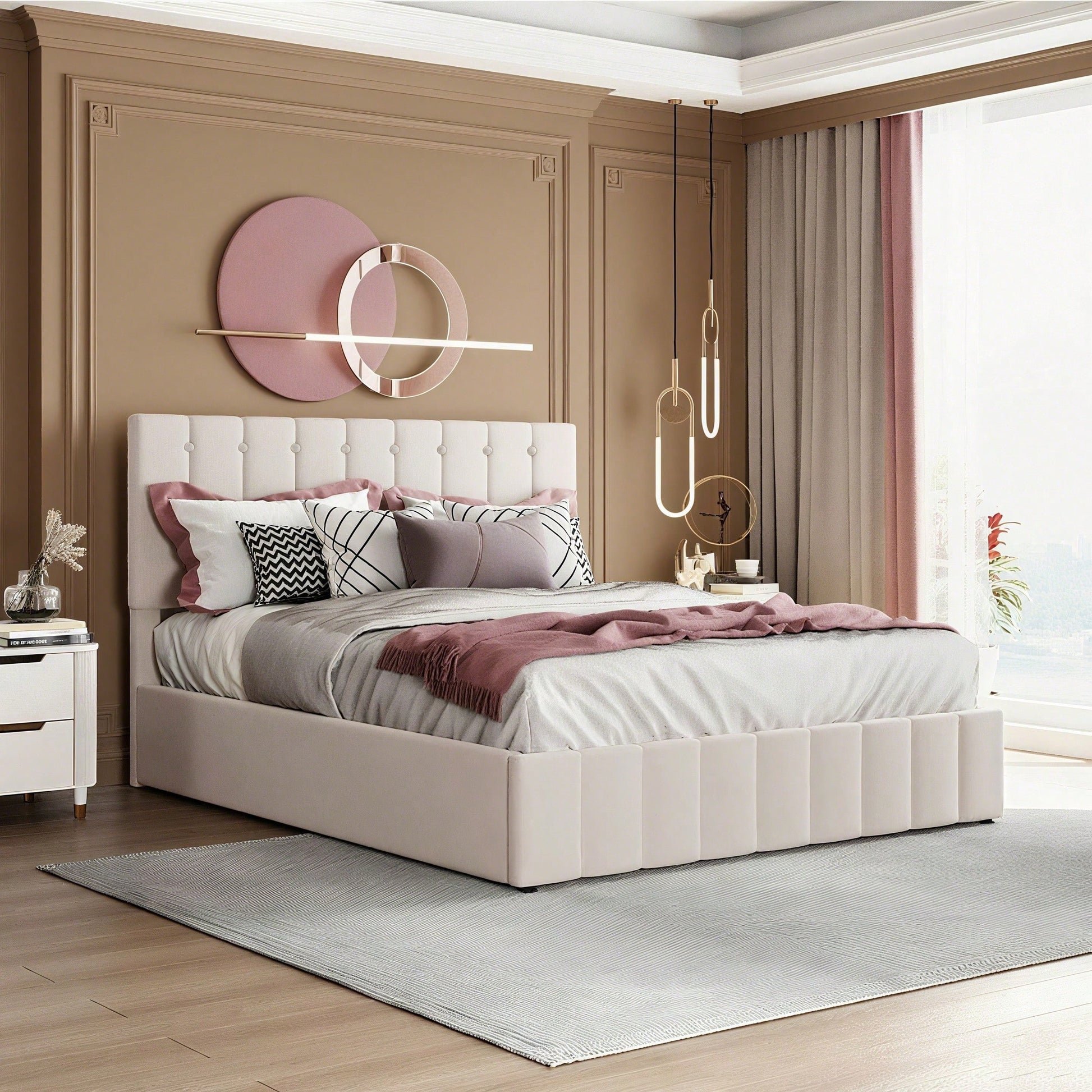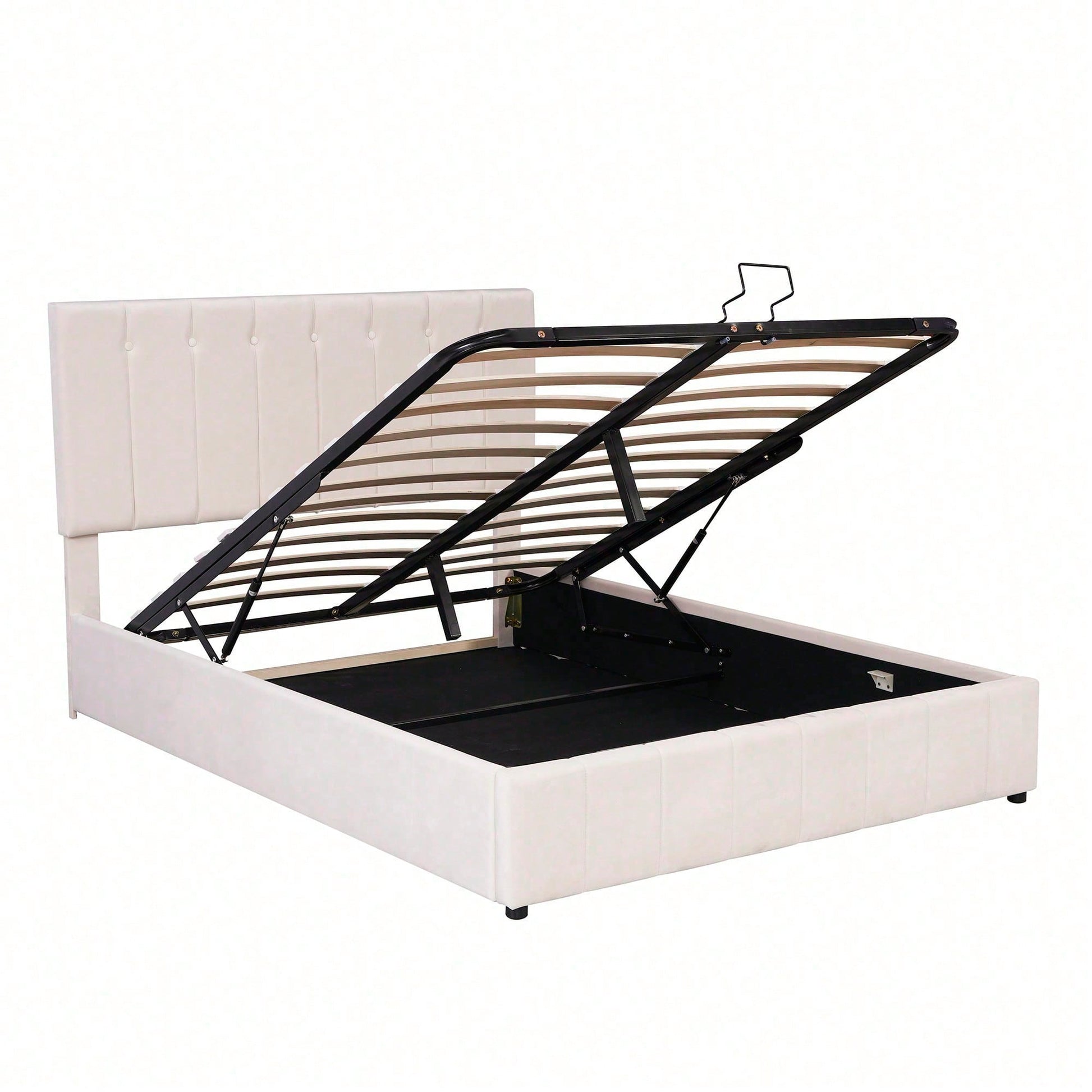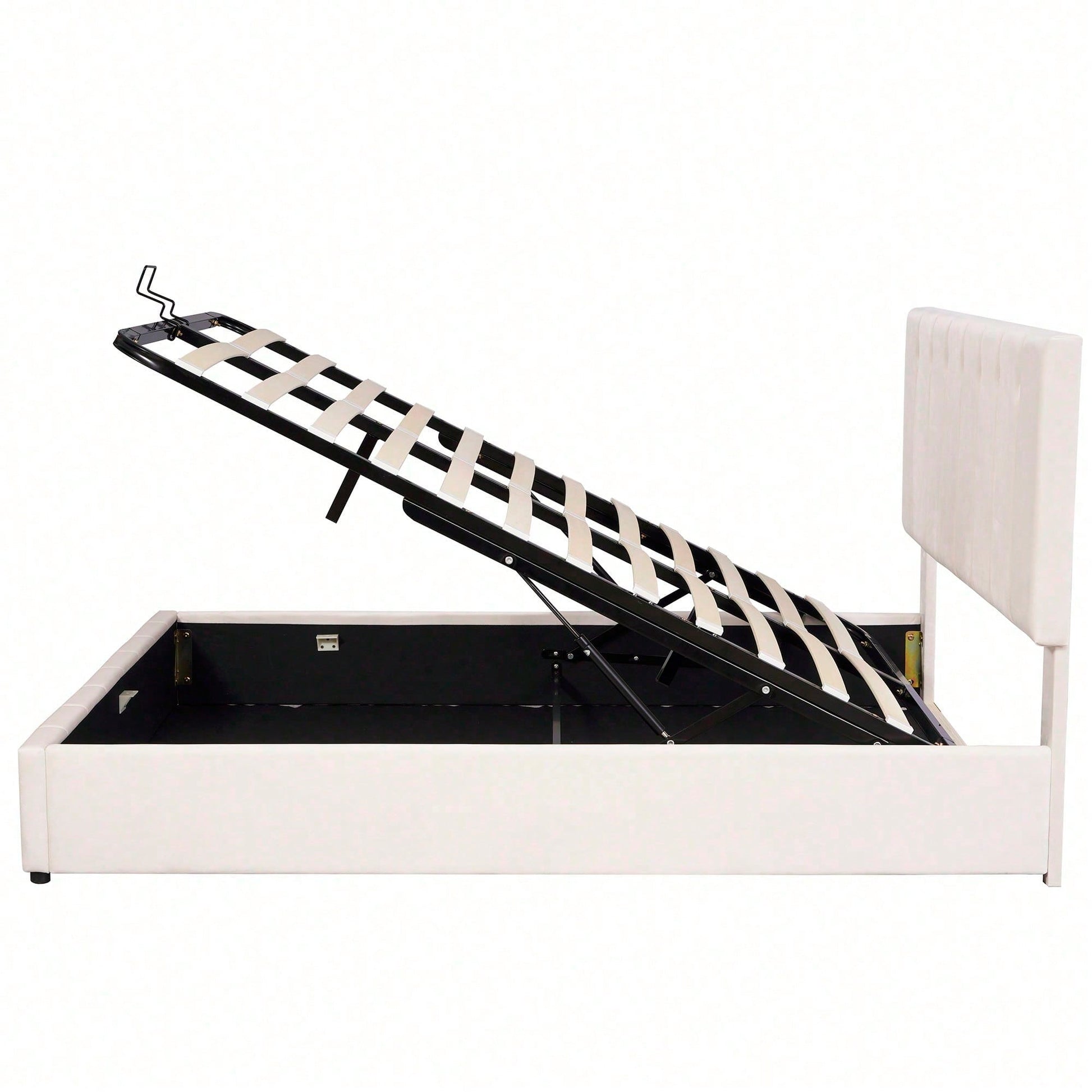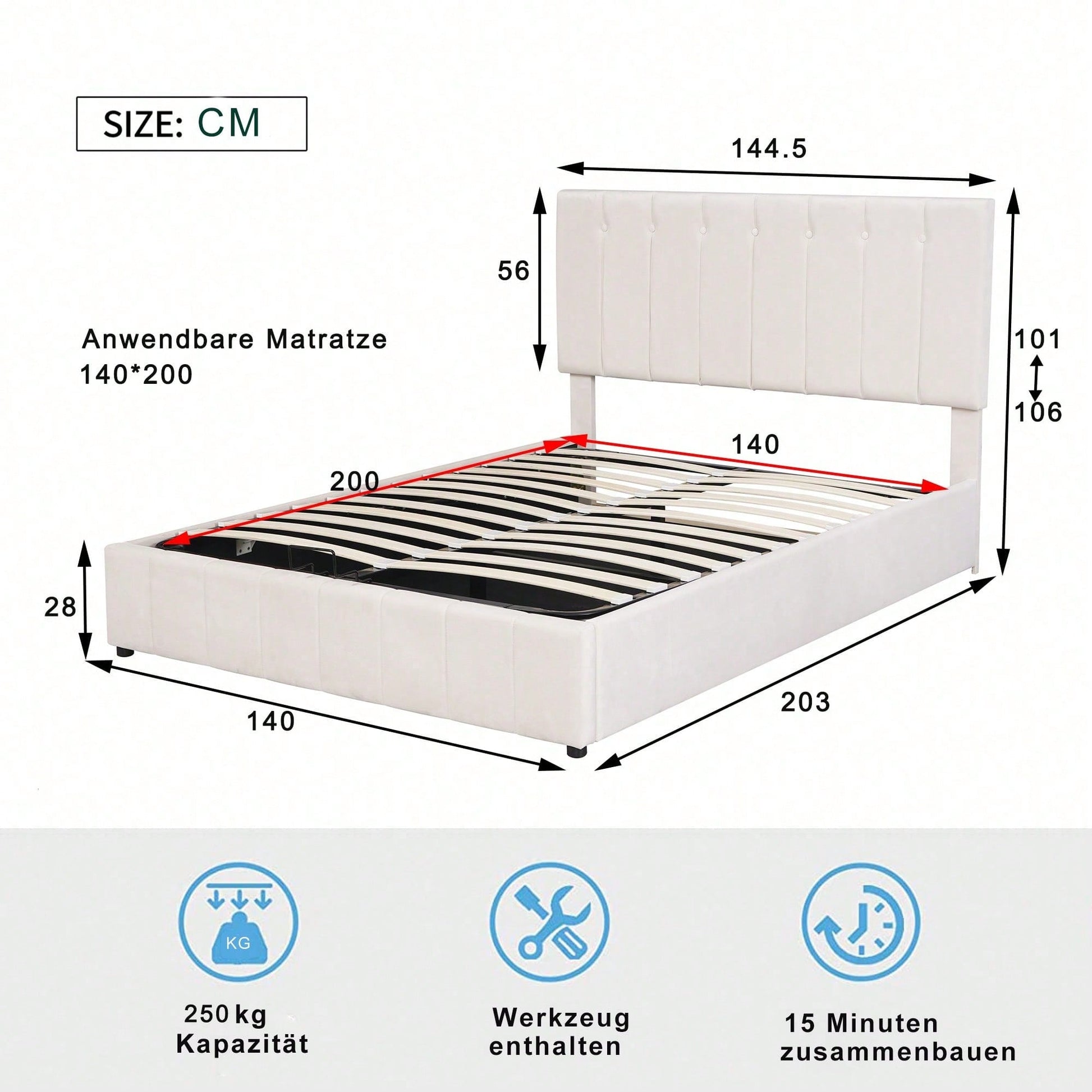Gagnez de la place et créez plus d'espace de rangement - Avec 28 cm d'espace utilisable sous le sommier à lattes, il équivaut au rangement d'une armoire à deux portes, idéal pour les petites maisons ou les appartements où l'espace est limité. Facile à utiliser - Ce lit tapissé unique avec fonction de levage hydraulique offre un grand espace de rangement, accessible à tout moment. Accédez aux objets sous le lit sans transpirer ni déplacer le matelas. Durable - Sommier à lattes métalliques et 24 lattes à double rangée ; les lattes sont courbées pour un meilleur soutien, empêchant le matelas de s'affaisser facilement et créant un environnement de sommeil confortable. Tissu velours - Doux et confortable, ce tissu velours de haute qualité apporte une touche de chaleur à la pièce. Plusieurs couleurs sont disponibles, s'harmonisant parfaitement avec une variété de décorations intérieures pour créer un espace unique, rien que pour vous. Cadre de lit facile à monter - Dimensions totales du lit : 203 x 140 x 106 cm, et capacité de charge : 250 kg. Ce lit plateforme est expédié depuis l'Allemagne par colis de deux. Il est possible que deux colis ne soient pas livrés le même jour. Veuillez prévoir un délai supplémentaire de 2 à 3 jours ou contacter notre service client pour obtenir de l'aide. Description Ce magnifique lit plateforme tapissé est doté d'une tête de lit rembourrée qui apporte une touche moderne et chic à votre chambre. Rembourré d'une mousse épaisse pour un confort optimal, il est doté d'un cadre en bois robuste et d'un système de lattes en bois pour plus de stabilité et de . Un système de rangement hydraulique sous le matelas vous permet de ranger vos essentiels dans un espace réduit sans compromettre la taille de lit souhaitée. Ce produit est également livré avec un kit de lattes. Ne manquez pas l'occasion de le récupérer dès aujourd'hui. Caractéristiques Dimensions globales du produit : 203 x 140 x 106 cm Dimensions du produit : Veuillez consulter le tableau des tailles. Nombre de colis : 2 Poids total du produit : 40 kg Capacité de charge : 250 kg Épaisseur de matelas recommandée : 12-24 cm Couleur : Crème/Beige foncé Matériau : MDF + métal + velours Nombre de lattes : 24 Sommier requis : Non Matelas inclus : Non Temps de montage estimé : 0,5 heure Nombre de personnes recommandé : 2 Outils supplémentaires requis : Tous les outils sont inclus, y compris un tournevis Éviter l'utilisation d'outils électriques : Oui