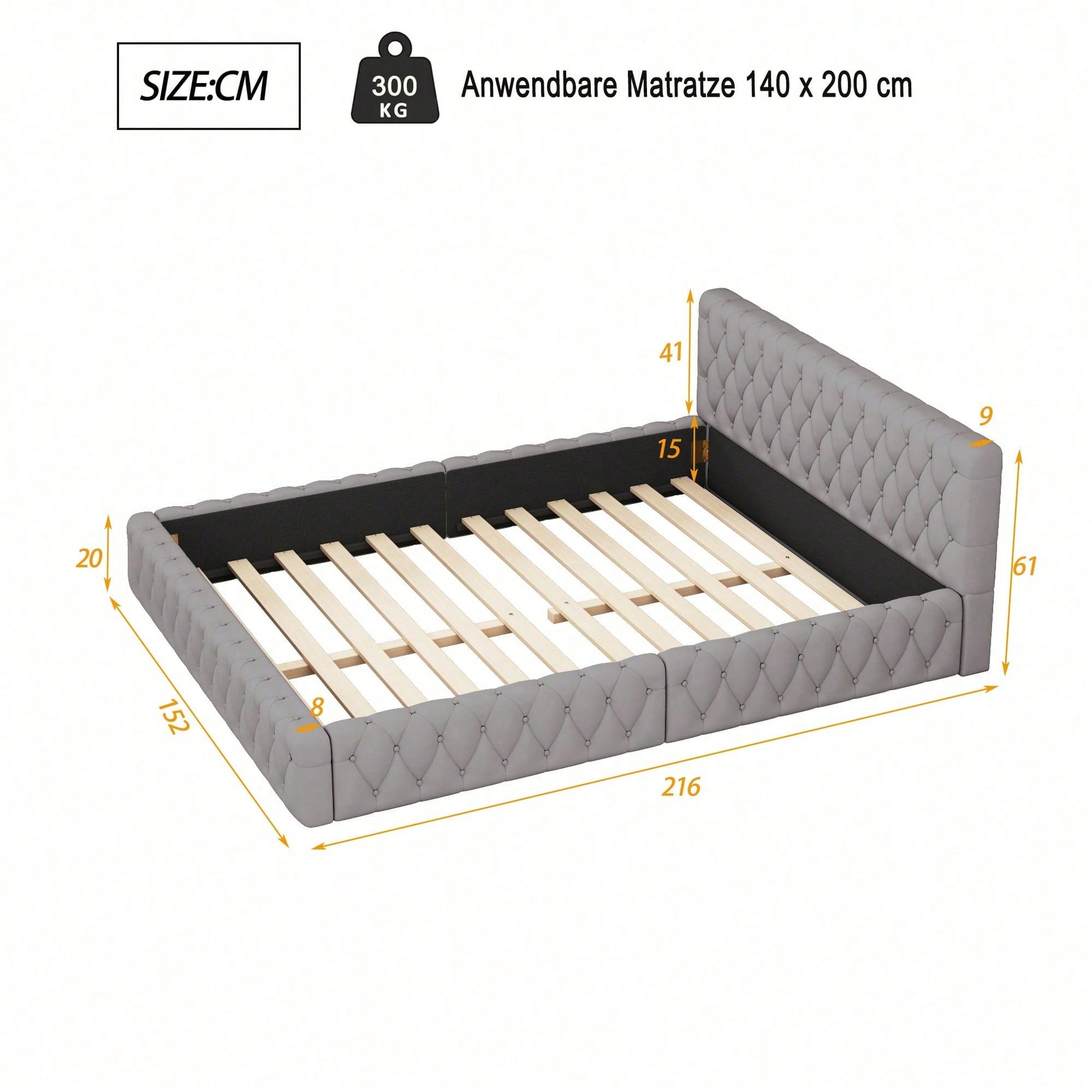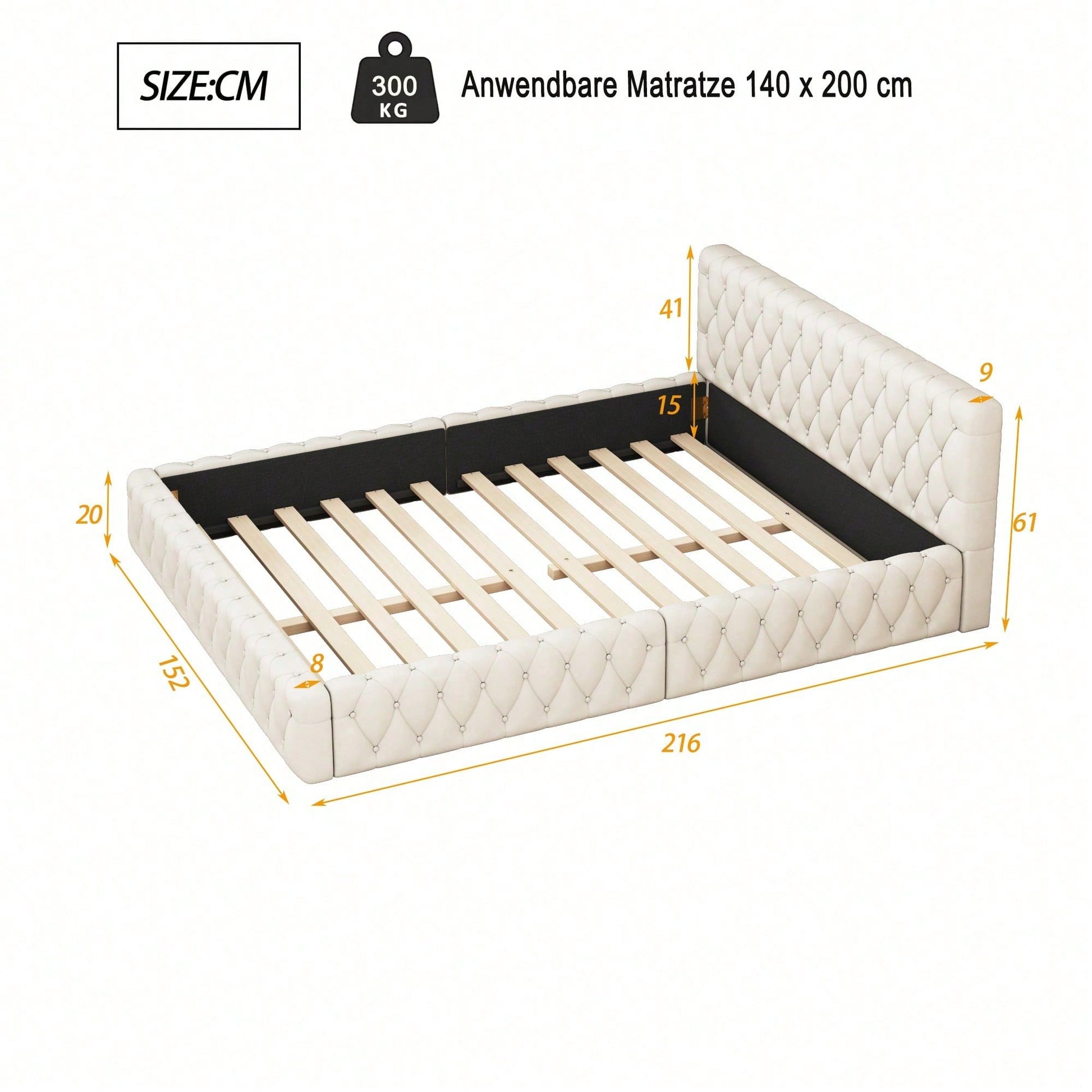Spécifications Informations produit Code article : LDU00130AAA Type de produit : Article combiné Nom du produit : Lit double rembourré pour jeune 140 x 200 cm, en velours doux pour la peau, beige Origine : Chine Couleur principale : Beige Matériau principal : Rembourré Utilisation : Chambre Dimensions du lit : 140 cm x 200 cm Matériau du revêtement : Velours Dimensions du produit Longueur une fois assemblé (cm) : 216,00 Largeur une fois assemblé (cm) : 152,00 Hauteur une fois assemblé (cm) : 61,00 Poids du produit (kg) : 40,00 Dimensions du colis Sous-article 1 : WF322142AAA Quantité : 1 104,5 x 41,6 x 20,1 cm, 15 kg Sous-article 2 : WF322141AAA Colis Quantité : 1 157 x 43,6 x 20,5 cm, 30 kg Caractéristiques du produit Confort luxueux : Le dossier moelleux assure un confort optimal sur ce lit double rembourré, idéal pour se détendre au quotidien ou lire au lit. Design élégant : Le tissu en velours de haute qualité ajoute une touche de sophistication à la décoration de votre chambre. Sa couleur blanc perle s'intègre parfaitement aux intérieurs modernes. Style contemporain : Le design discret du lit améliore la convivialité et s'intègre parfaitement aux espaces de vie modernes. Cadre robuste : Le cadre rembourré offre une excellente durabilité et stabilité. Capacité de charge : Jusqu'à 300 kg pour une résistance et une stabilité fiables. Style intemporel : La finition beige s'adapte à tous les décors. Polyvalence : Convient pour un lit junior ou double.
