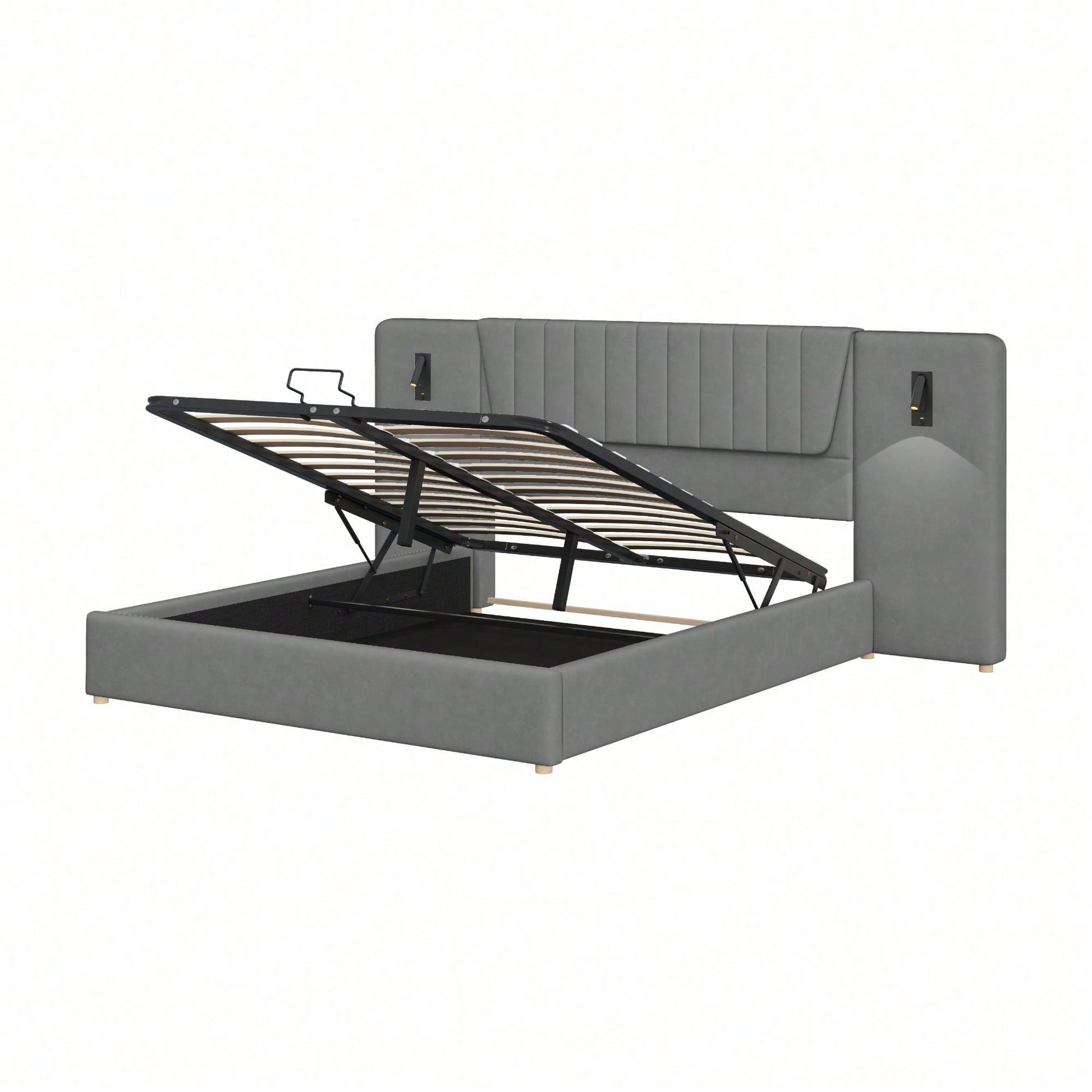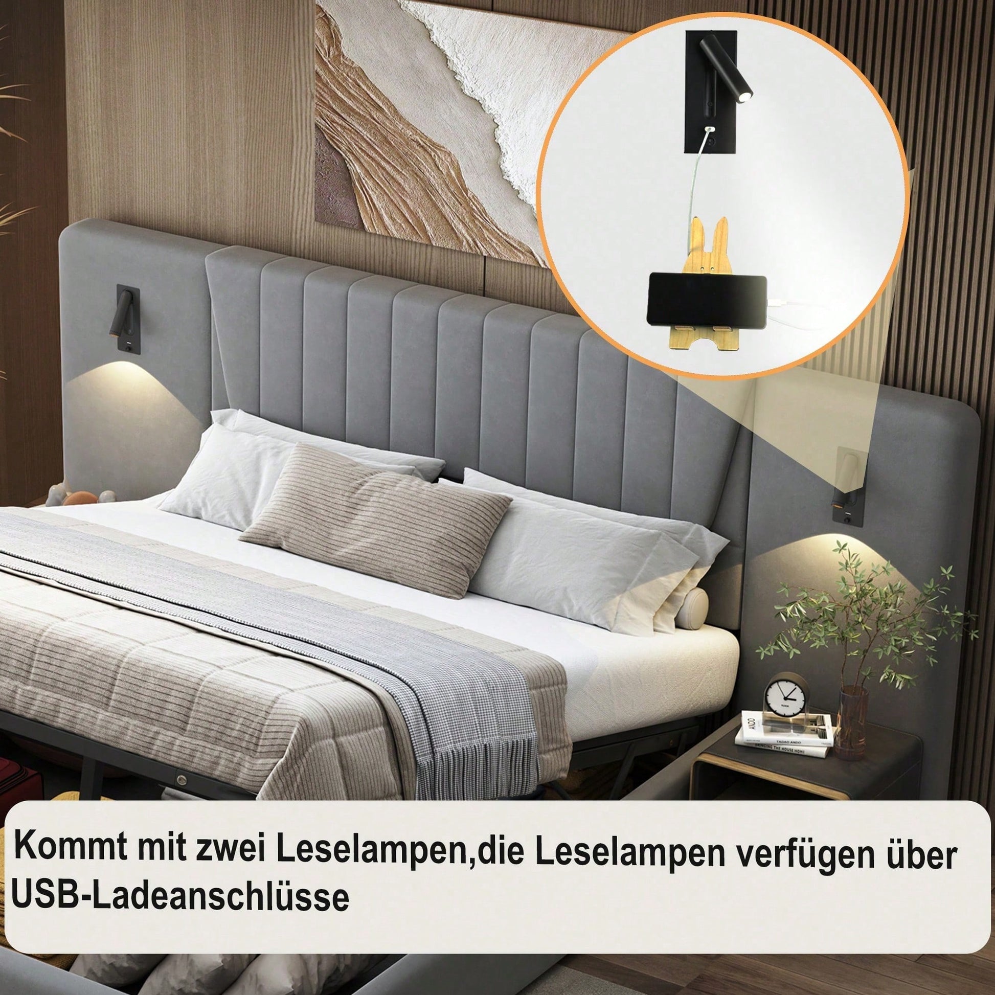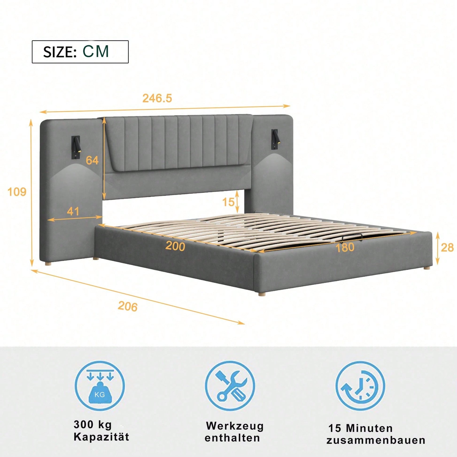 Spécifications Informations produit Code article : LDU00244AAE Type de produit : Article combiné Nom du produit : Lit rembourré 180 x 200 cm, avec dossier extra-long, lampe de lecture réglable, port de charge USB, lit coffre hydraulique, lit double, tissu velours, gris Origine : Chine Couleur principale : Gris Matériau principal : Rembourré Dimensions du lit : 180 x 200 cm Type de lit : Structure de lit Dimensions du produit Longueur une fois assemblé (cm) : 206,00 Largeur une fois assemblé (cm) : 246,50 Hauteur une fois assemblé (cm) : 109,00 Poids du produit (kg) : 57,00 Dimensions du colis Sous-article 1 : N623P182388E Quantité par colis : 1 197,49 x 26,67 x 21,84 cm kg Sous-article 2 : N623P182387E Quantité par paquet : 1 135,13 x 44,45 x 13,97 cm 11,5 kg Sous-article 3 : N623P182386E Quantité par paquet : 1 168,91 x 50,29 x 10,41 cm 22,7 kg Caractéristiques du produit Coussin de dossier extra-long et large : ce lit capitonné présente une tête de lit au design unique. Les lignes classiques du dossier et de la tête de lit extra-longs et larges confèrent à ce lit capitonné un style distinctif tout en offrant un excellent confort et un excellent soutien. Idéal pour lire, se détendre ou regarder la télévision, il est idéal pour se détendre. Le tissu en velours est agréable et doux au toucher, garantissant un sommeil réparateur. Liseuses pivotantes avec ports USB : ce lit double capitonné est équipé de deux liseuses pivotantes à 180° à la tête de lit, vous permettant d'orienter facilement la lumière selon vos préférences. Le port de charge USB pratique des liseuses vous permet de recharger vos appareils sans câbles supplémentaires, un atout pratique et bien pensé. Rangement hydraulique - L'espace de rangement hydraulique sous ce lit double rembourré est l'équivalent d'une armoire dissimulée, idéale pour ranger votre literie et vos autres vêtements. Robuste, stable et durable - Le cadre de ce grand lit rembourré est composé de supports métalliques et de 24 doubles rangées de lattes pouvant supporter jusqu'à 300 kg. Il reste stable et ne s'enfonce pas pour une nuit de sommeil réparatrice. Montage facile - Les dimensions totales de ce lit double rembourré sont de 246,5 x 206 x 109 cm avec sommier à lattes (matelas non inclus). Ce lit double rembourré est expédié depuis l'Allemagne en trois colis. Il est possible que les trois colis ne soient pas livrés simultanément. Veuillez patienter quelques jours.