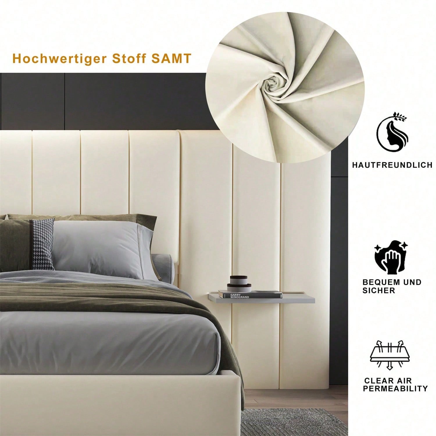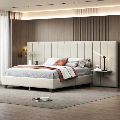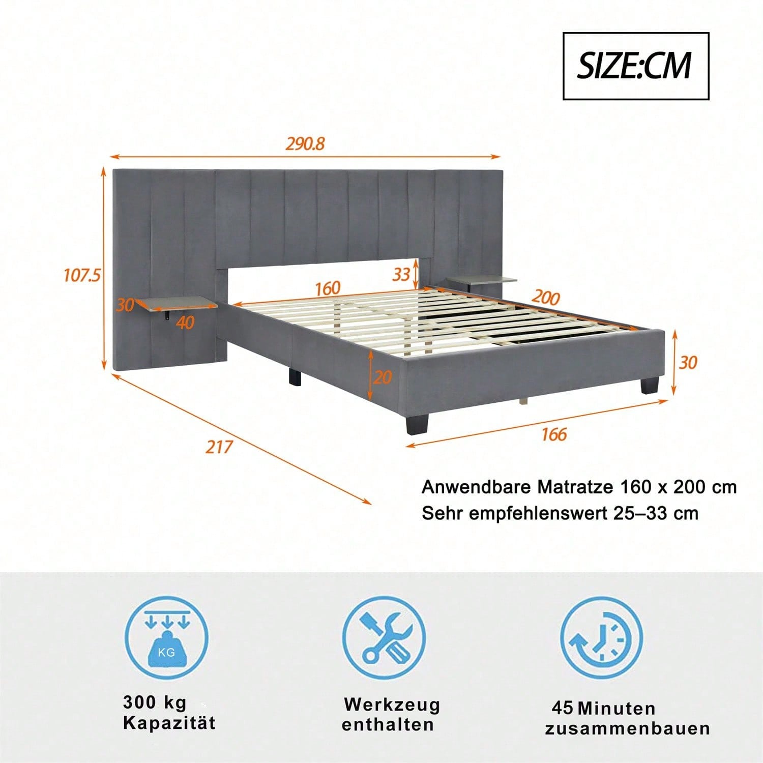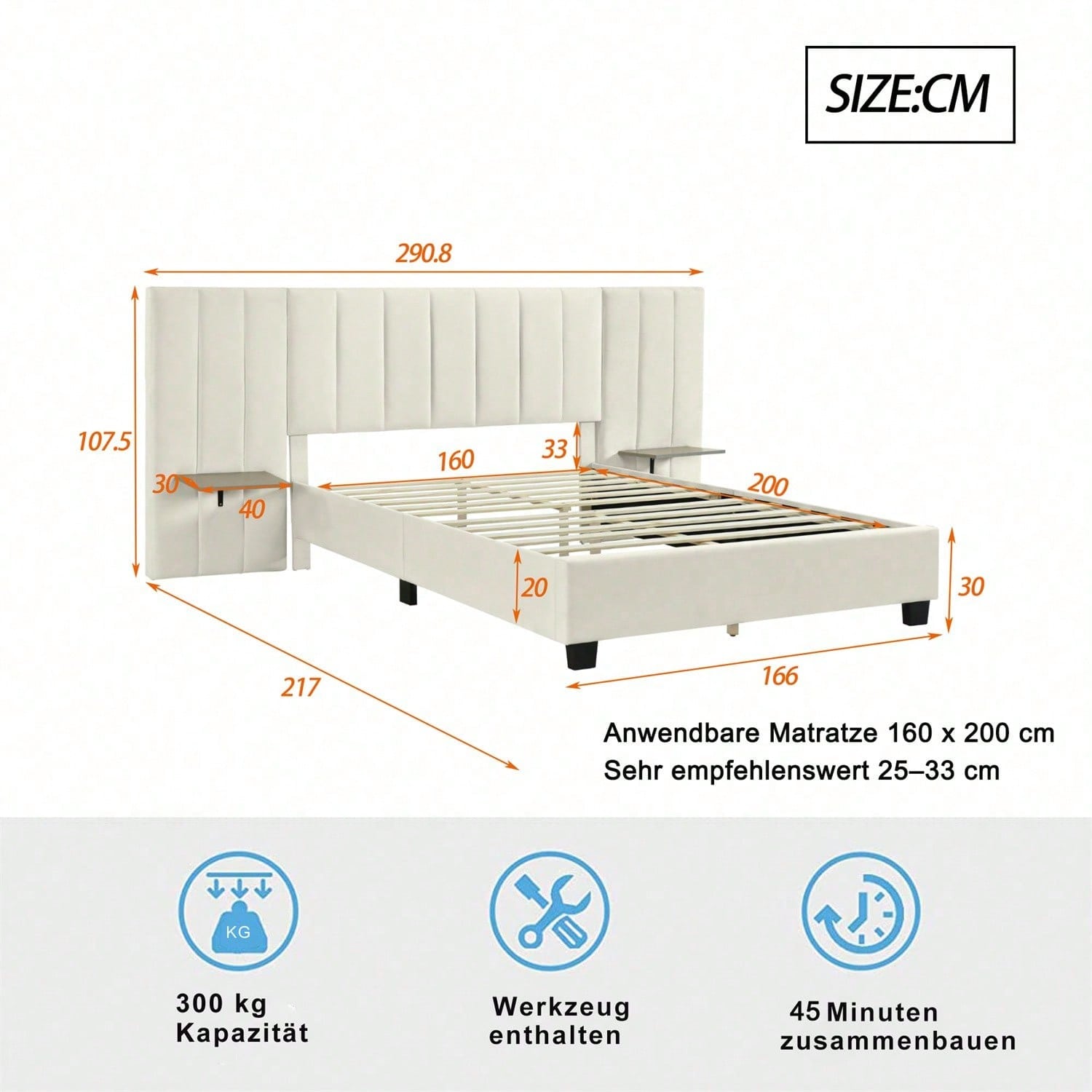 Informations produit Code article : LDU00129AAA Type de produit : Combo Nom du produit : Lit tapissé 160 x 200 cm, lit double avec tête de lit et dossier allongés, étagères de chaque côté de la tête de lit, sommier à lattes, velours beige Origine : Chine Couleur principale : Beige Matériau principal : Tapissé Utilisation : Chambre Dimensions du lit : 160 cm x 200 cm Matériau du revêtement : Velours Dimensions du produit Longueur une fois assemblé (cm) : 290,80 Largeur une fois assemblé (cm) : 217,00 Hauteur une fois assemblé (cm) : 107,50 Poids du produit (kg) : 51,00 Dimensions du colis Sous-article 1 : WF323131AAA Quantité : 1 167 x 55,9 x 10,5 cm kg Sous-article 2 : WF323132AAA Quantité par paquet : 1 106,7 x 63,5 x 22,9 cm 29 kg Caractéristiques du produit Tête de lit allongée au design unique : La tête de lit de ce lit rembourré est unique. Son large dossier et ses lignes classiques lui confèrent un aspect tridimensionnel. Les lignes symétriques de chaque côté de la tête de lit confèrent à ce lit double simplicité et raffinement. Le large dossier et le rembourrage en mousse intégrale à la tête de lit offrent soutien et confort. Lits avec étagères de chaque côté : Les étagères de chaque côté de ce lit double offrent un espace de rangement supplémentaire, vous permettant de placer librement lampes, livres ou décorations de chaque côté du lit pour créer une ambiance unique dans votre chambre. Tissu velours doux pour la peau - Ce lit est fabriqué en velours doux et agréable au toucher, à la texture délicate et agréable pour la peau. Il vous offre un confort optimal. Le velours confère à l'ensemble du lit rembourré un aspect élégant et de haute qualité, apportant un impact visuel unique à votre chambre. Robuste et stable - Le cadre de ce lit en kit est composé de lattes de bois et de supports métalliques, avec un sommier à lattes pouvant supporter une charge allant jusqu'à 300 kg. Facile à monter - Dimensions totales du lit : 290,8 x 217 x 107,5 cm avec sommier à lattes (matelas non inclus). Ce lit rembourré double est expédié depuis l'Allemagne en deux colis ; il peut arriver que deux colis n'arrivent pas le même jour. Veuillez prévoir un délai de livraison de 2 à 3 jours.