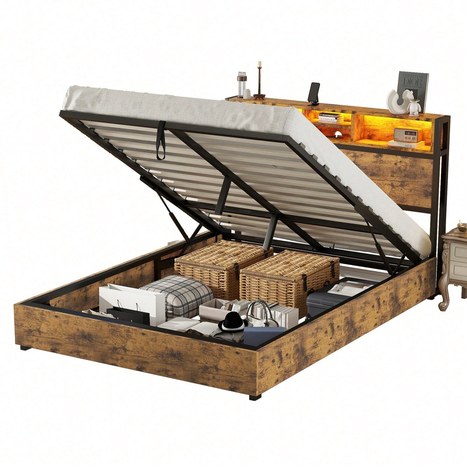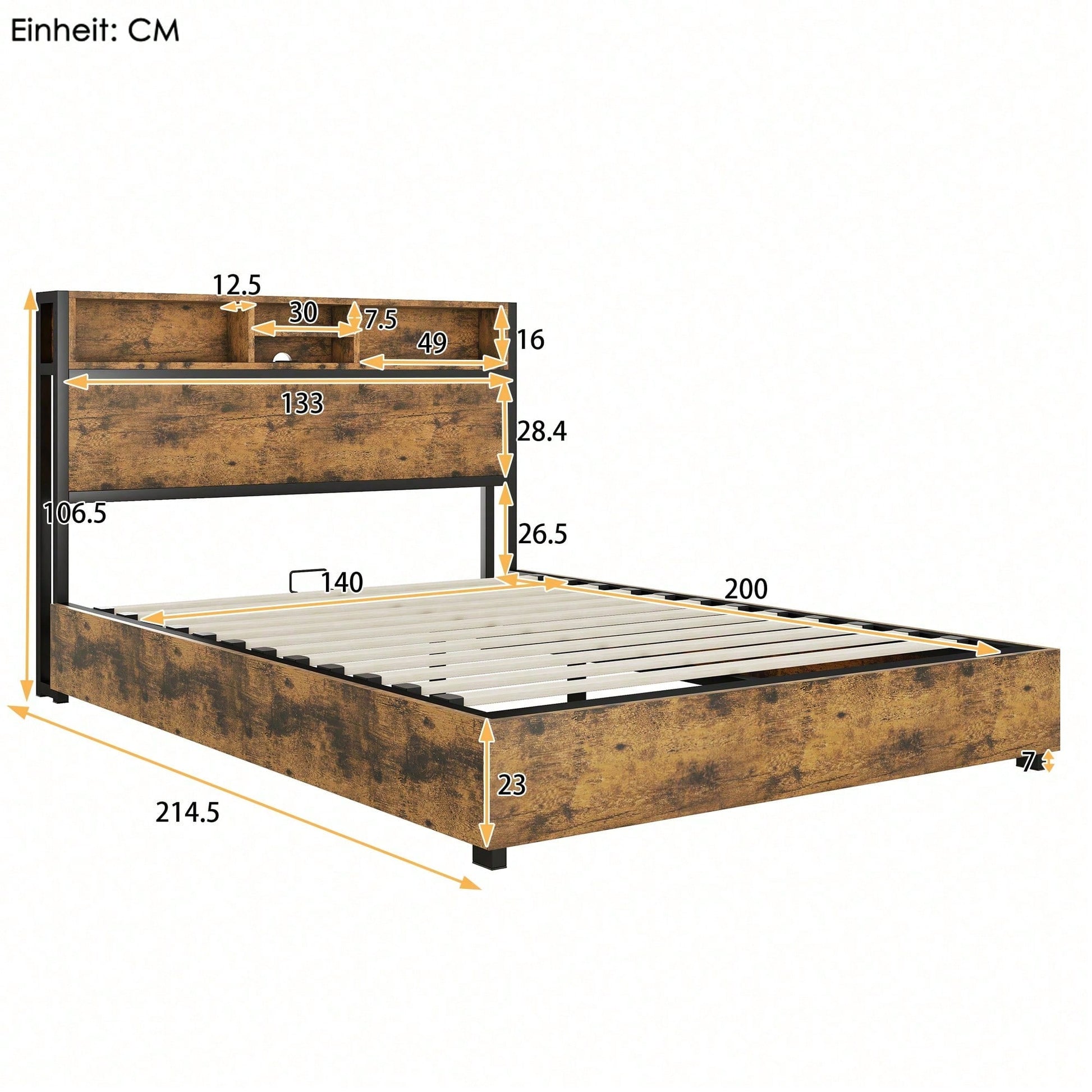 Spécifications Informations produit Code article : WX000542AAB Type de produit : Article combiné Nom du produit : Lit plat 140 x 200 cm, mécanisme de levage hydraulique, éclairage d'ambiance LED à changement de couleur, télécommande 24 touches, grand espace de rangement dans le tiroir, marron Couleur principale : Marron Matériau principal : MDF + métal Dimensions du lit : 140 x 200 cm Dimensions du produit Longueur une fois assemblé (cm) : 214,50 Largeur une fois assemblé (cm) : 140,00 Hauteur une fois assemblé (cm) : 106,50 Poids du produit (kg) : 50,40 Dimensions du colis Sous-article 1 : WF321566AAB Quantité par colis : 1 151 x 37,5 x 16 cm 26,7 kg Sous-article 2 : WF321565AAB Quantité par colis : 1 198,5 x 31,5 x 15,5 cm 29 kg Caractéristiques du produit Matériaux de haute qualité : Le lit est composé d'une structure métallique et de MDF, garantissant stabilité et capacité de charge, pour un confort de sommeil durable. Mécanisme de levage hydraulique : Le lit est équipé d'un mécanisme de levage hydraulique qui agrandit l'espace de rangement sous le lit, créant ainsi une combinaison parfaite de rangement et de couchage. L'espace généreux sous le lit permet de ranger divers objets, rendant la chambre plus ordonnée et ordonnée. Design en bois antique : Le design unique en bois antique est non seulement beau et généreux, mais s'intègre également facilement à divers styles d'intérieur, mettant en valeur le goût et le style de son propriétaire. Éclairage LED et port USB : La table de chevet est équipée d'un compartiment de rangement pour ranger facilement les objets fréquemment utilisés. L'éclairage LED intégré, avec télécommande 24 touches et port USB, assure le confort et confère à la chambre une atmosphère chaleureuse et romantique. Le lit est expédié depuis l'Allemagne en deux colis. Il arrive que les colis arrivent à des dates différentes. Pour être que vos attentes soient satisfaites, veuillez patienter ou contacter notre service client.