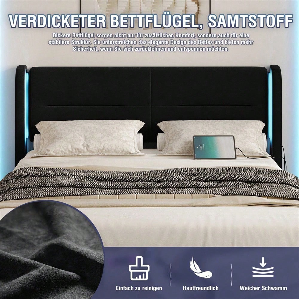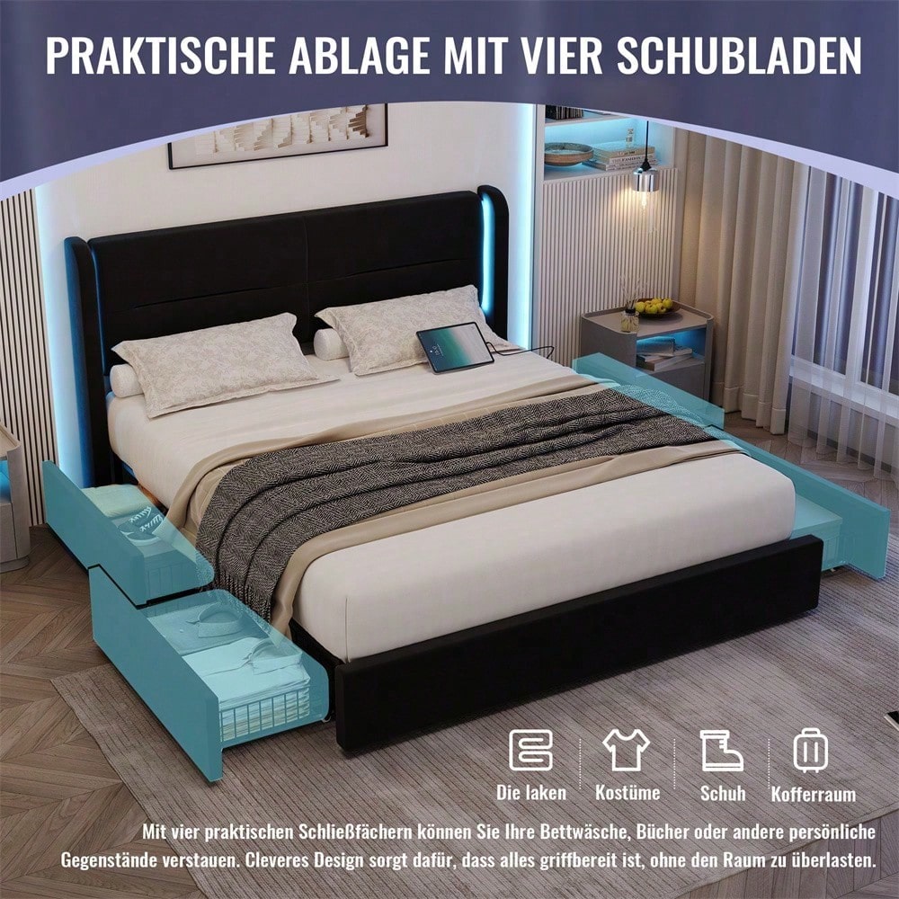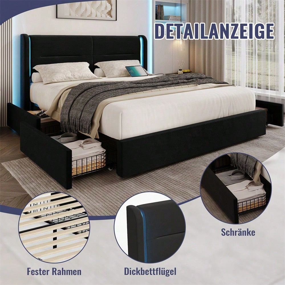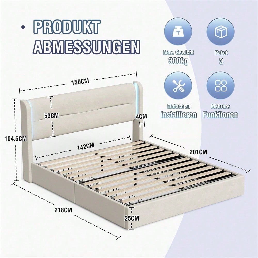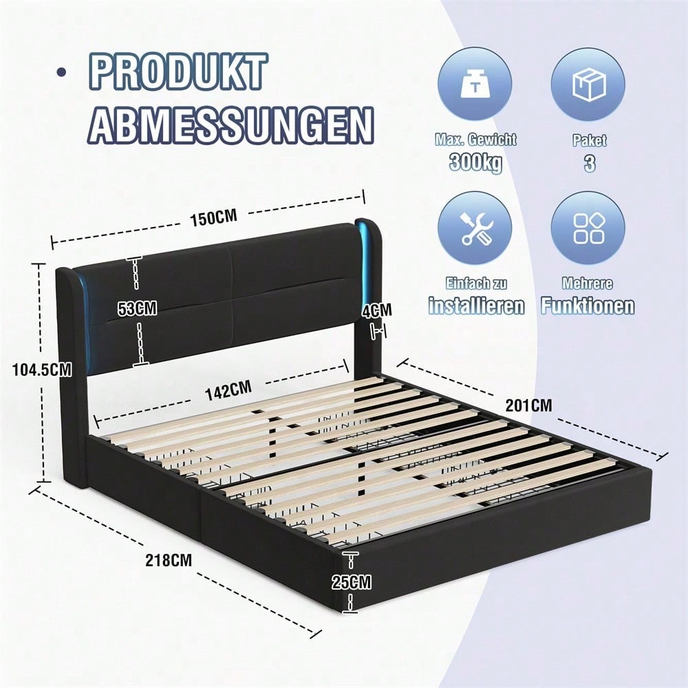 Spécifications Informations produit Code article : W2845S00064 Type de produit : Article combiné Nom du produit : Cadre de lit moderne 140 x 200 cm avec éclairage LED à la tête de lit, 4 tiroirs de rangement pratiques, rembourrage épais, deux ports USB et ailes élégantes pour plus de confort, noir Couleur principale : Noir Matériau principal : Velours Style du produit : Contemporain Utilisation : Chambre Dimensions du lit : 140 cm x 200 cm Type de lit : Cadre de lit Sommier requis : Sommier requis Matériau du cadre de lit : Métal Dimensions du produit Longueur après assemblage (cm) : Non applicable Largeur après assemblage (cm) : Non applicable Hauteur après assemblage (cm) : Non applicable Poids du produit (kg) : Non applicable Dimensions du colis Sous-article 1 : W2845P263591 Quantité par colis : 1 141,5 x 54 x 12,5 cm 25,3 kg Sous-article 2 : W2845P263590 Quantité par colis : 1 148,5 x 30,5 x 28,5 cm 27,1 kg