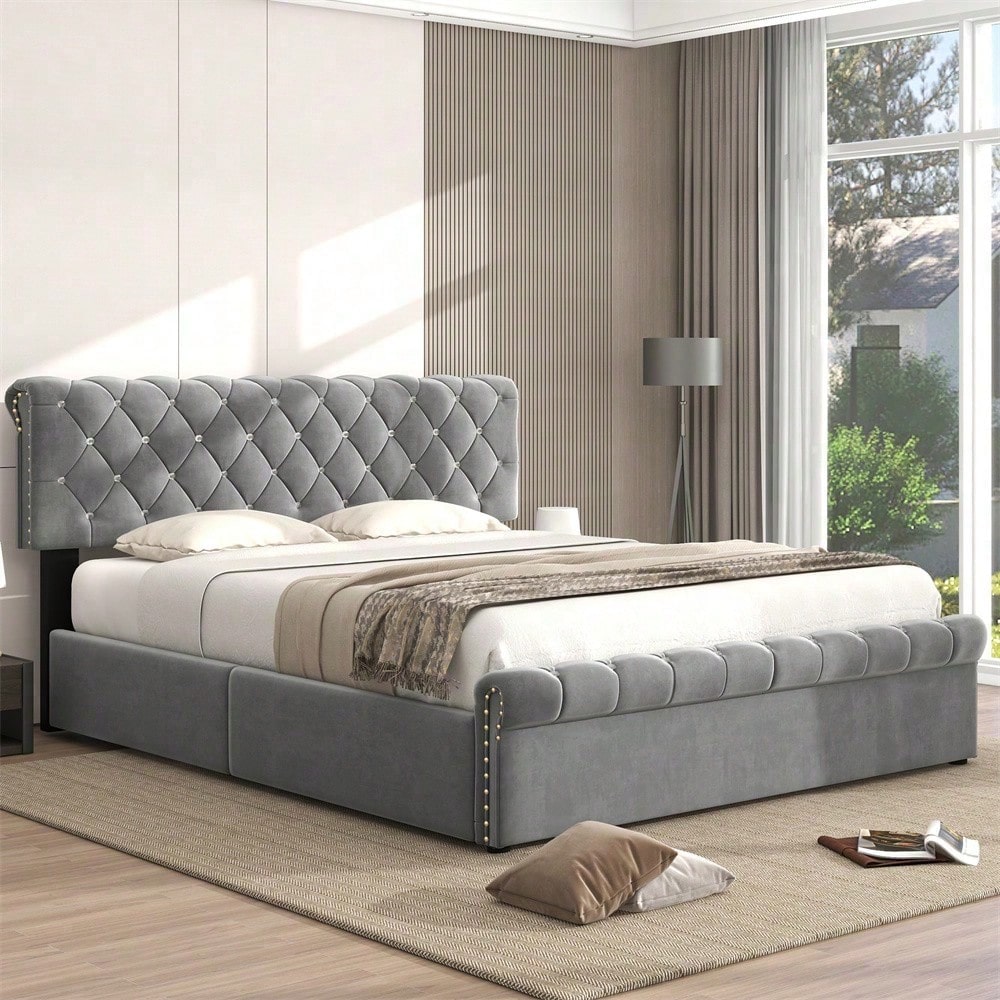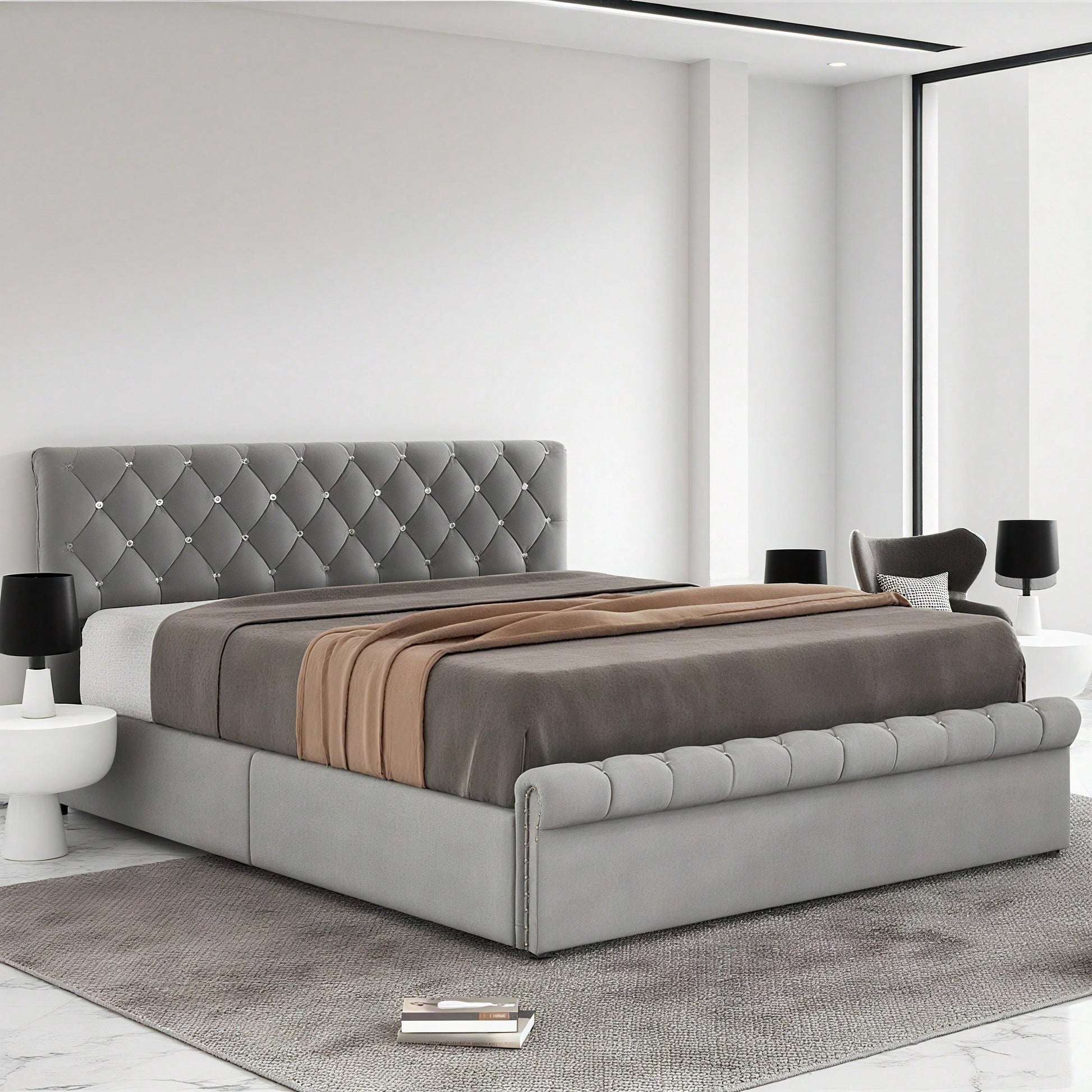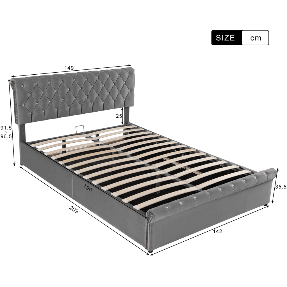 Tête de lit réglable en hauteur : La tête de lit de ce produit est réglable de 5 cm vers le haut et vers le bas, et sa hauteur peut être ajustée à votre convenance, ce qui le rend pratique pour toutes les morphologies. La large tête de lit apporte douceur et confort, idéal pour s'y adosser. Magnifique décoration en boucles de cristal : La tête de lit est ornée de boucles de cristal ornées, ajoutant une touche luxueuse à ce lit classique de style européen. Il s'adapte à une variété de styles de décoration et embellit et rend votre chambre plus confortable. Rangement puissant et pratique : Ce lit dispose d'un rangement puissant. Son ouverture hydraulique permet de ranger vos objets du quotidien tels que des boîtes, des couvertures, des vêtements, etc. Conception anti-collision : L'extrémité du lit et la tête de lit sont incurvées pour réduire les risques de collision. Les enfants et les membres de la famille peuvent l'utiliser en toute confiance. Assemblage facile : Le design du lit est simple et élégant, et il est facile à assembler selon les instructions, vous faisant gagner un temps précieux. Si vous rencontrez des problèmes lors du montage, veuillez nous contacter rapidement. Description Détails du produit Type : Sommier à lattes : Un sommier à lattes est inclus. Type : Matelas : Non inclus. Rangement : Espace de rangement sous le lit. Dimensions : 209 x 149 x 91,5-96,5 cm Poids net : 46,5 kg Remarque : Dimensions : Toutes les dimensions sont approximatives. Charge maximale : 300 kg Housse : Velours Matelas non inclus. État de livraison : Démonté, 2 colis. Ce produit sera livré en 2 colis. Il est possible qu'ils ne soient pas livrés simultanément. Merci de votre patience.