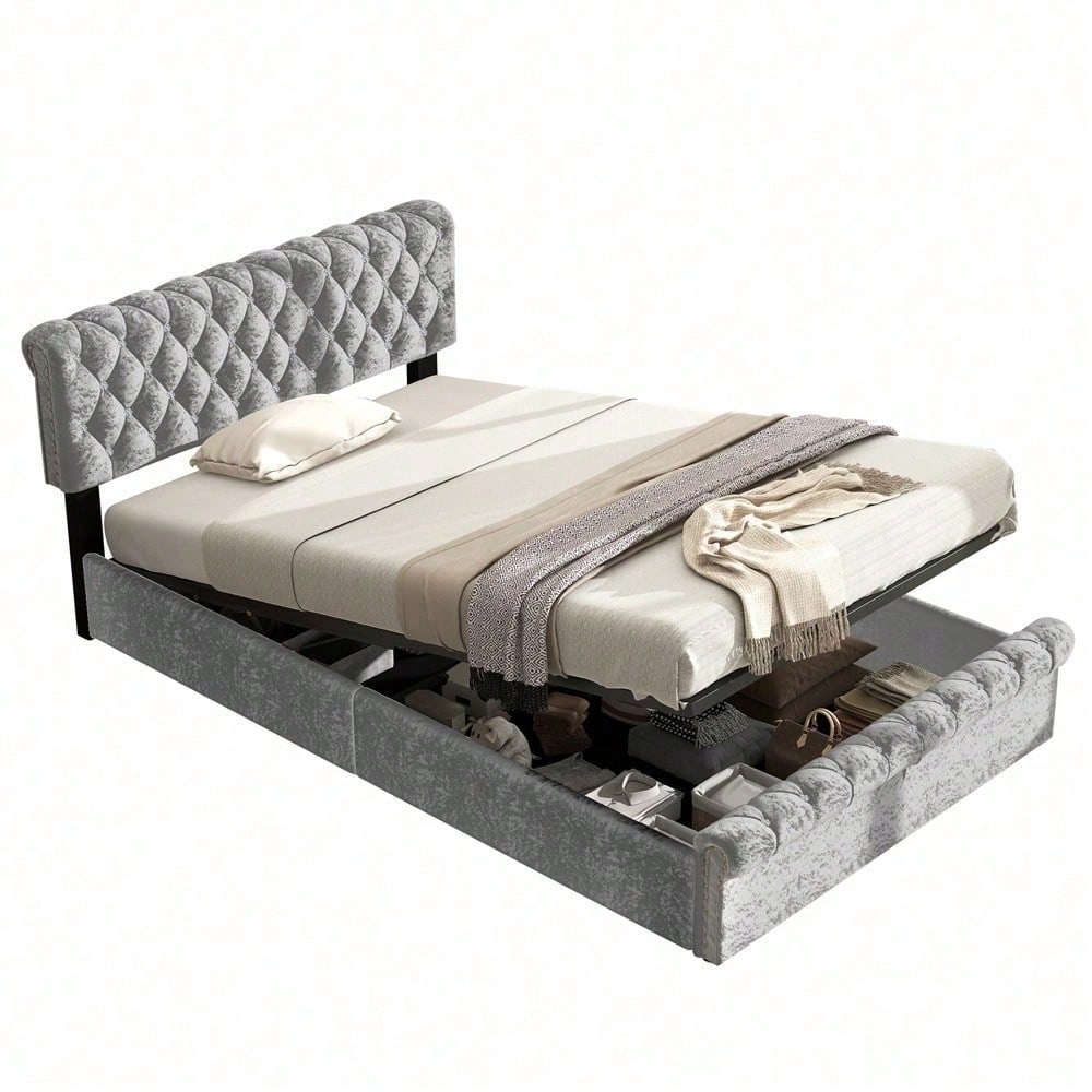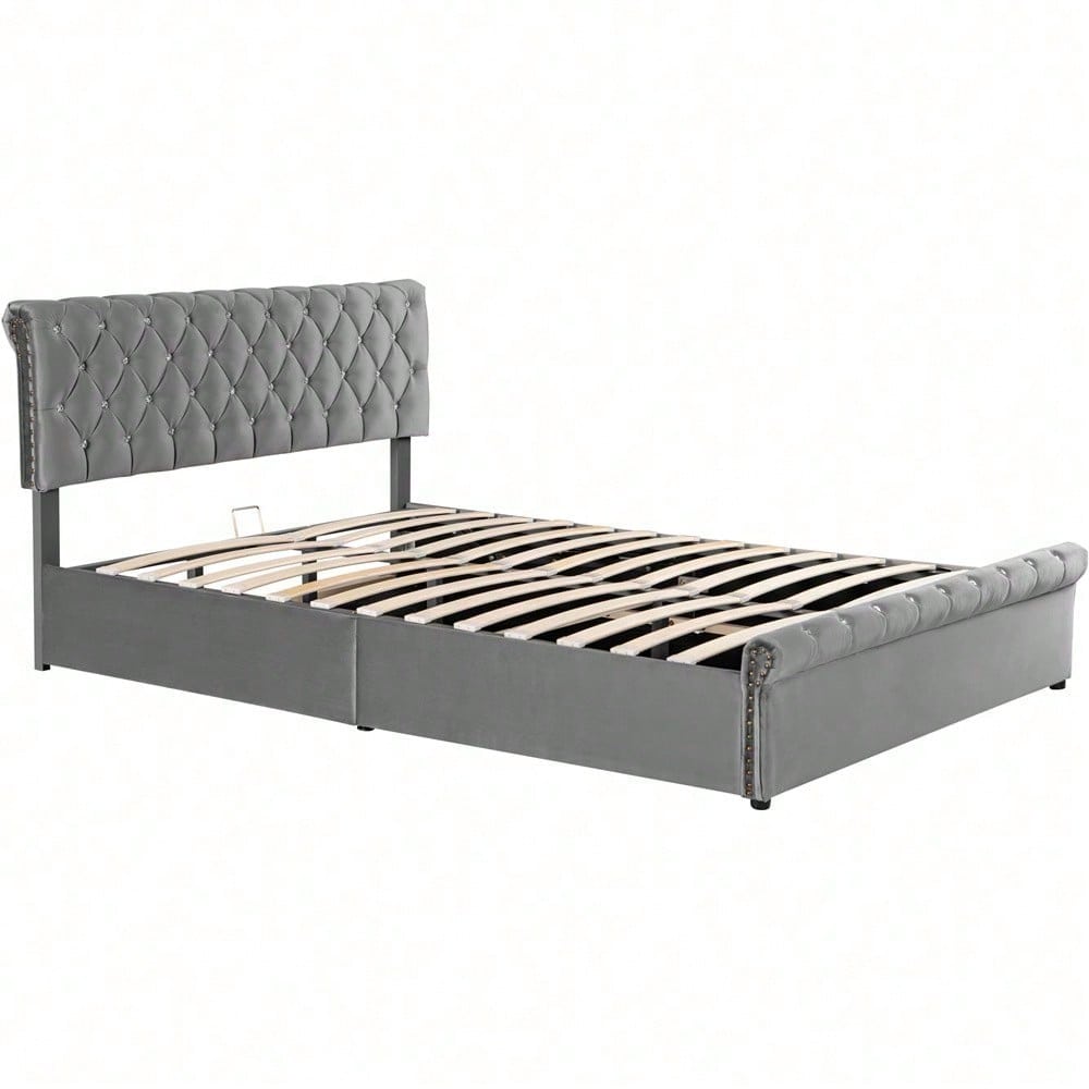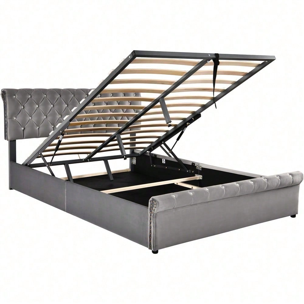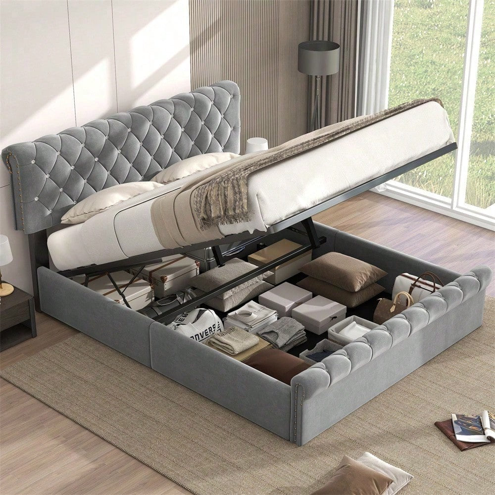 Tête de lit réglable en hauteur : La tête de lit de ce produit est réglable de 5 cm vers le haut et vers le bas, et sa hauteur peut être ajustée à votre convenance, ce qui le rend pratique pour toutes les morphologies. La large tête de lit apporte douceur et confort, idéal pour s'y adosser. Magnifique décoration en boucles de cristal : La tête de lit est ornée de boucles de cristal ornées, ajoutant une touche luxueuse à ce lit classique de style européen. Il s'adapte à une variété de styles de décoration et embellit et rend votre chambre plus confortable. Rangement puissant et pratique : Ce lit dispose d'un rangement puissant. Son ouverture hydraulique permet de ranger vos objets du quotidien tels que des boîtes, des couvertures, des vêtements, etc. Conception anti-collision : L'extrémité du lit et la tête de lit sont incurvées pour réduire les risques de collision. Les enfants et les membres de la famille peuvent l'utiliser en toute confiance. Assemblage facile : Le design du lit est simple et élégant, et il est facile à assembler selon les instructions, vous faisant gagner un temps précieux. Si vous rencontrez des problèmes lors du montage, veuillez nous contacter rapidement. Description Détails du produit Type : Sommier à lattes : Un sommier à lattes est inclus. Type : Matelas : Non inclus. Rangement : Espace de rangement sous le lit. Dimensions : 209 x 149 x 91,5-96,5 cm Poids net : 46,5 kg Remarque : Dimensions : Toutes les dimensions sont approximatives. Charge maximale : 300 kg Housse : Velours Matelas non inclus. État de livraison : Démonté, 2 colis. Ce produit sera livré en 2 colis. Il est possible qu'ils ne soient pas livrés simultanément. Merci de votre patience.