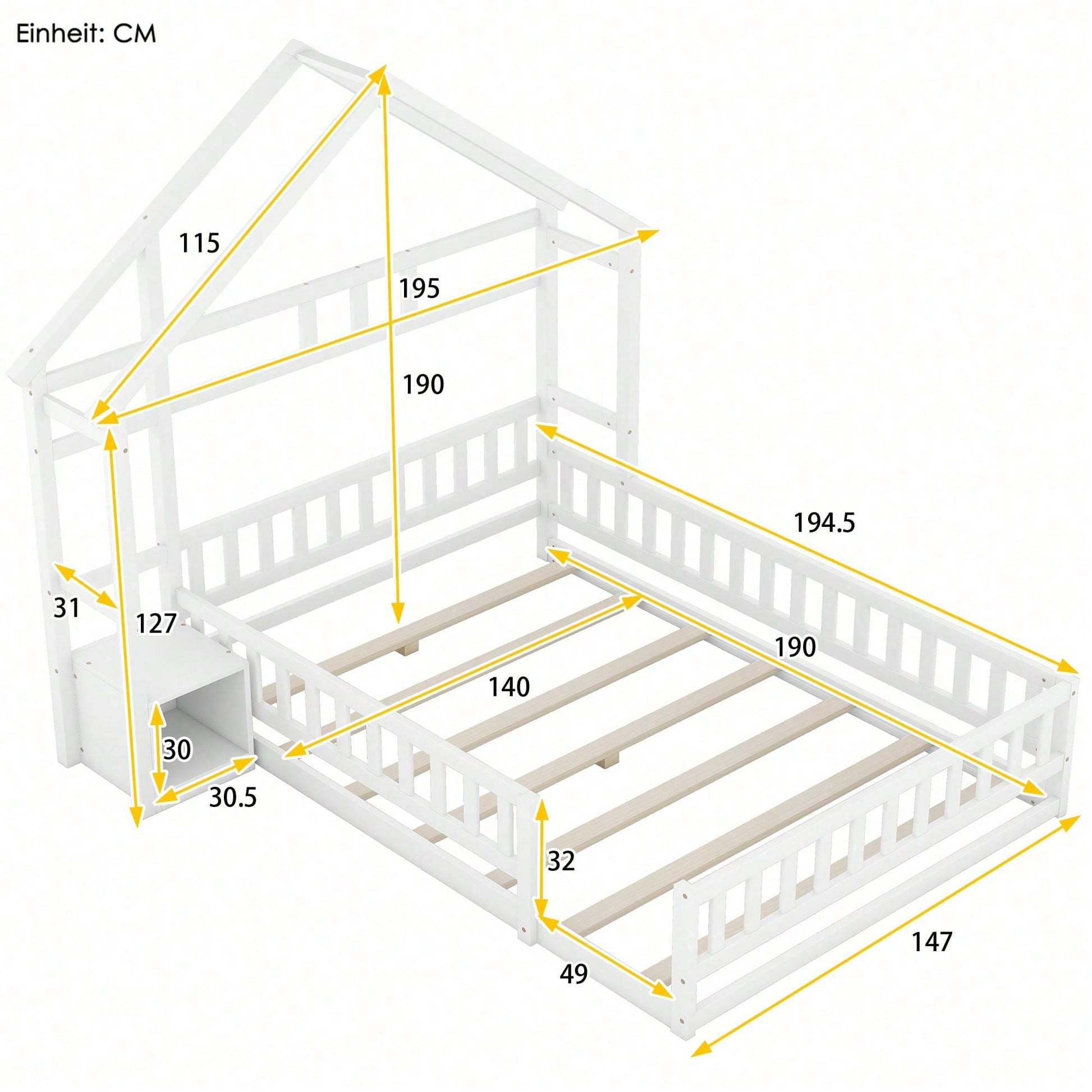 Spécifications Informations produit Code article : WX000332AAE Type de produit : Article combiné Nom du produit : Lits enfant 140 x 190 cm, lits plats, lits cabanes avec barrières, lits enfant avec tables de chevet, sans matelas, gris Couleur principale : Gris Matériau principal : Pin Dimensions du lit : 140 cm x 190 cm Dimensions du produit Longueur (monté) : 194,50 Largeur (monté) : 195,00 Hauteur (monté) : 190,00 Poids du produit (kg) : 32,00 Dimensions du colis Sous-article 1 : N636P285406E Quantité par colis : 1 146,48 x 43,99 x 9,5 cm 15,05 kg Sous-article 2 : N636P285405E Quantité par colis : 1 197,49 x 31,5 x 14,99 cm 21,1 kg Caractéristiques du produit Fabriqué en pin de haute qualité, ce lit bénéficie d'une fabrication soignée, ce qui le rend solide et durable, garantissant une longue durée de vie. Ce lit en forme de maisonnette vous apportera plus de plaisir et procurera à votre enfant un sentiment de . Le lit est équipé d'une table de chevet pour ranger facilement livres et autres objets, rendant votre chambre plus ordonnée et organisée. Le lit est doté d'une barrière latérale de 32 cm de haut pour éviter les glissades et assurer un sommeil en toute . Sa conception pleine hauteur permet aux enfants de se coucher facilement. Le lit mesure 194,5 x 195 x 190 cm et a une capacité de charge de 150 kg. Le lit est expédié depuis l'Allemagne en deux colis. Il peut arriver que deux colis n'arrivent pas le même jour. Veuillez patienter 2 à 3 jours ou contacter notre service client.