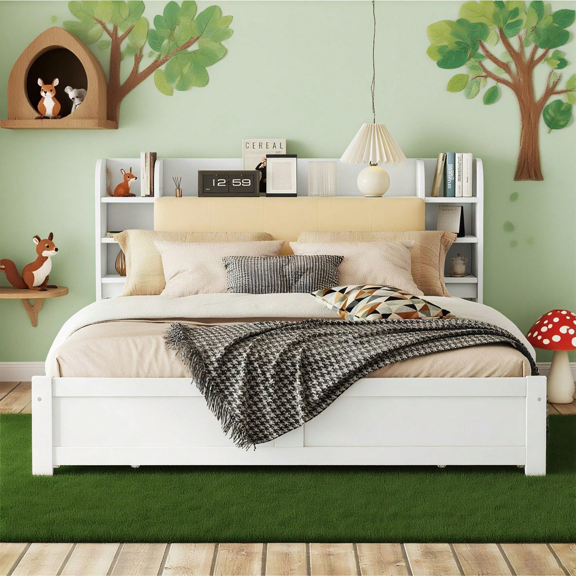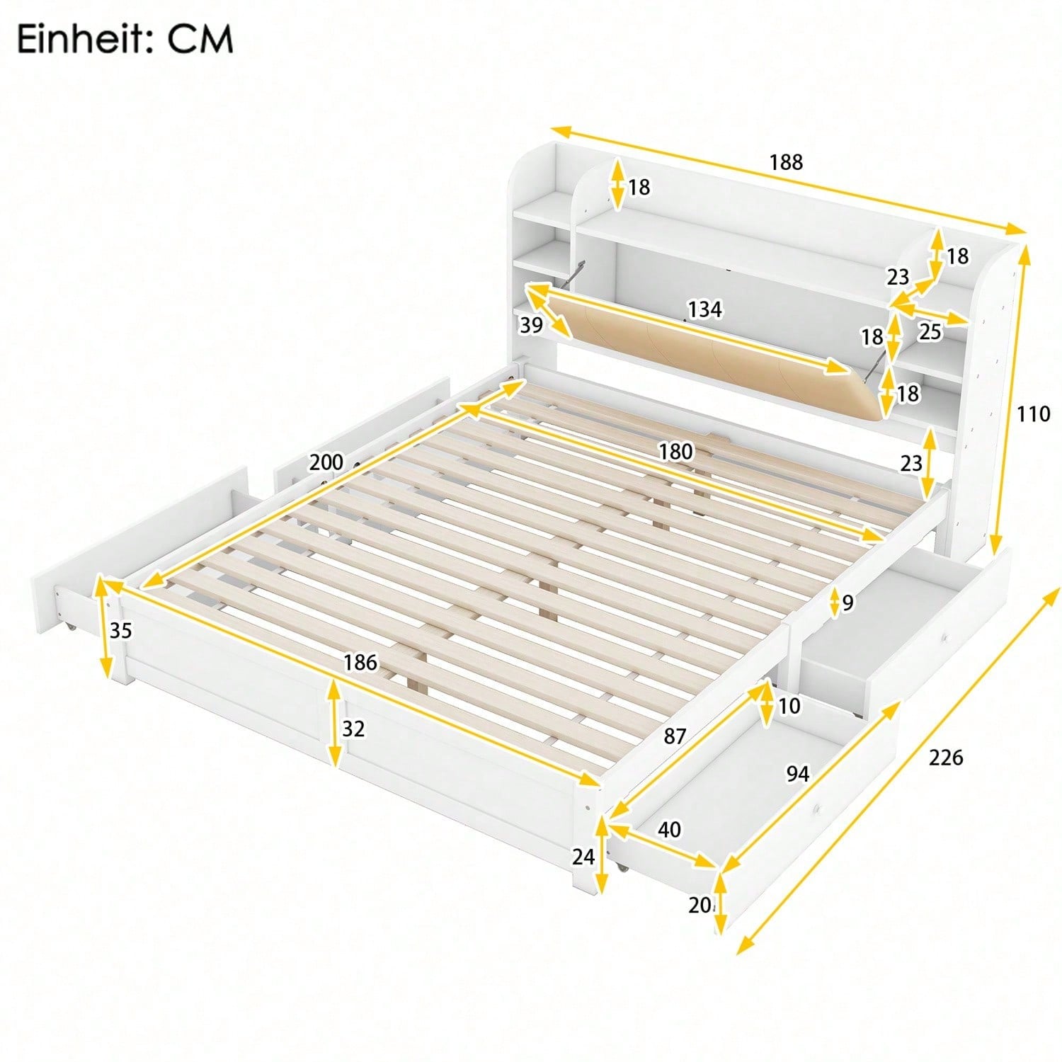 Spécifications Informations produit Code article : WX000809AAK Type de produit : Combo Nom du produit : Lit plat 180 x 200 cm, tête de lit partiellement articulée, quatre tiroirs, plusieurs compartiments de rangement, blanc Couleur principale : Blanc Matériaux principaux : Pin Dimensions du produit Longueur après assemblage (cm) : 226,00 Largeur après assemblage (cm) : 188,00 Hauteur après assemblage (cm) : 110,00 Poids du produit (kg) : 83,30 Dimensions du colis Sous-article 1 : WF318292AAK Quantité par colis : 1 192,5 x 32,5 x 16 cm, 30,5 kg Sous-article 2 : WF318290AAK Quantité par colis : 1 141 x 47 x 17,5 cm, 29,3 kg Sous-article 3 : WF318291AAK Quantité par paquet : 1 187 x 37 x 15,5 cm 29,5 kg Caractéristiques du produit Structure robuste : Fabriqué en pin massif et en MDF, ce lit assure robustesse et stabilité. Il est également de , pour un confort optimal. Table de chevet multifonctionnelle : Trois compartiments de rangement sont disposés de chaque côté du lit, et la partie centrale de la housse souple s'ouvre et se ferme. Ce rangement intégré est pratique pour ranger livres, vêtements et autres objets, pour une chambre plus ordonnée et organisée. Grand espace de rangement : Quatre tiroirs sous le lit offrent un espace de rangement supplémentaire pour répondre à vos besoins. Large et confortable : Ce lit large et confortable vous offre un sommeil réparateur. Que vous l'utilisiez comme lit simple ou double, il répond à vos besoins et vous permet de profiter d'un sommeil réparateur. Le lit est expédié en trois colis depuis l'Allemagne. Parfois, les colis arrivent à des moments différents, mais pour vous assurer que vos attentes sont satisfaites, soyez patient ou contactez notre service client amical.