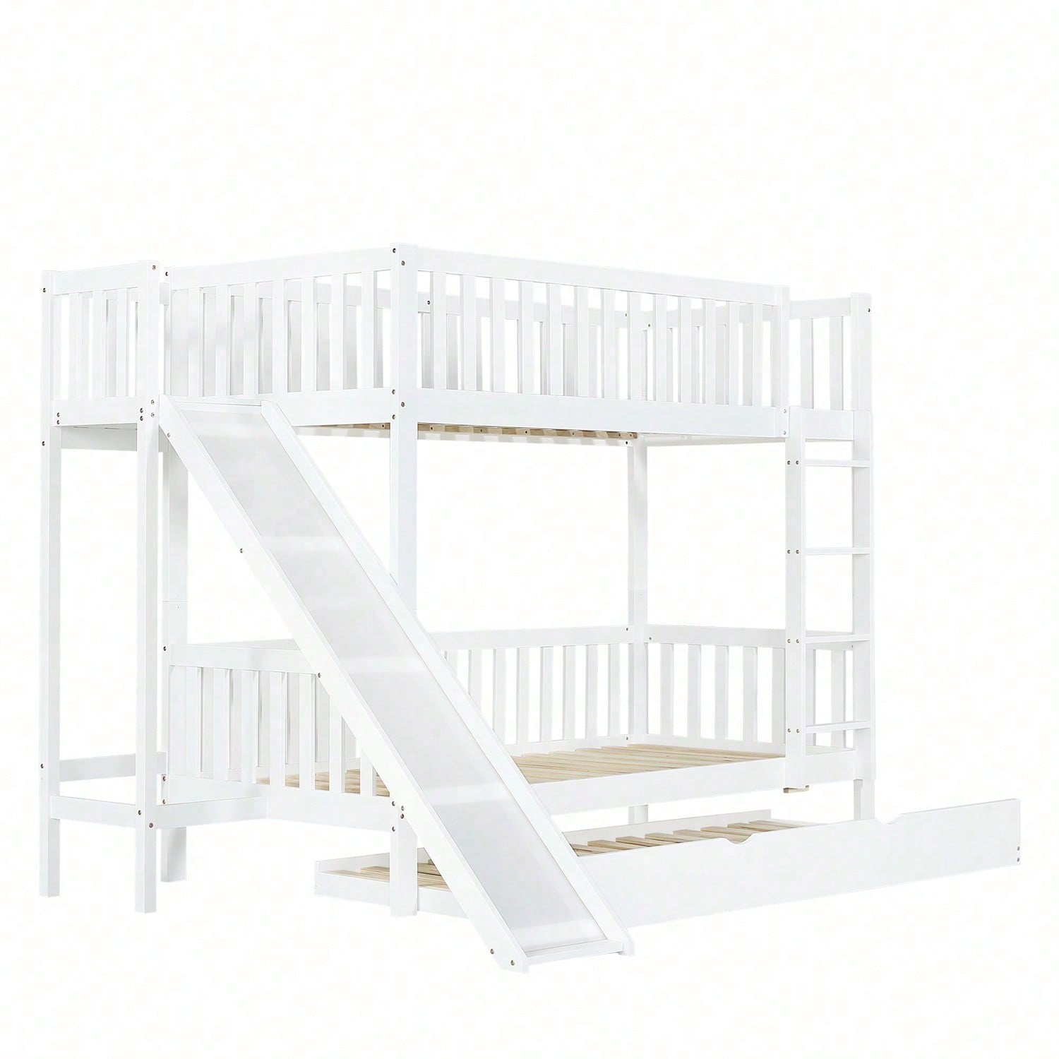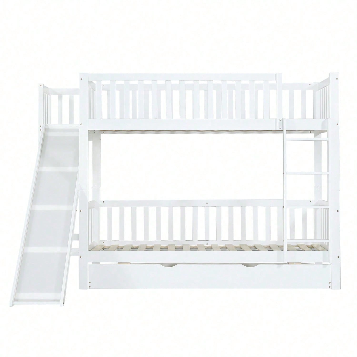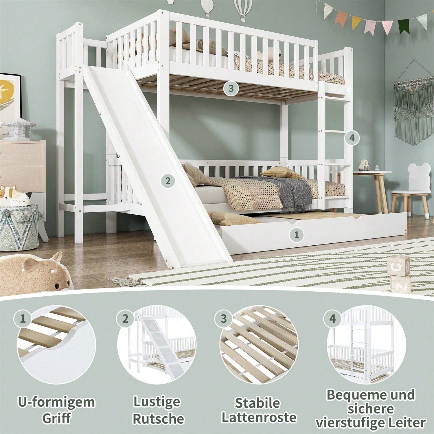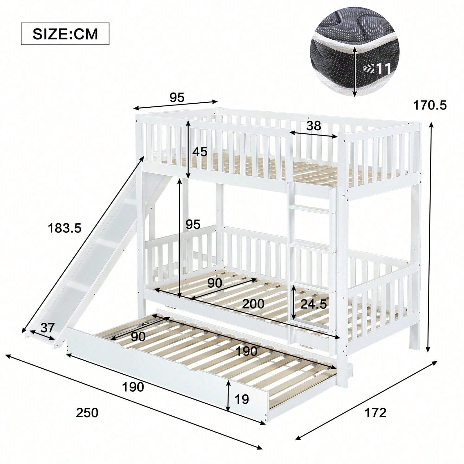 Spécifications Informations produit Code article : N622T530525678W Type de produit : Article combiné Nom du produit : [530525678WAA] Lit superposé avec lit gigogne, lit enfant, avec barrière antichute, toboggan et étagères, échelle droite 4 marches, pin + MDF, blanc, 90 x 200/190 cm Origine : Chine Couleur principale : Blanc Matériau principal : Bois massif + MDF Dimensions du lit : 90 x 200 cm Type de lit : Superposé Dimensions du produit Longueur une fois assemblé (cm) : 250,00 Largeur une fois assemblé (cm) : 172,00 Hauteur une fois assemblé (cm) : 170,50 Poids du produit (kg) : 75,50 Dimensions du colis Sous-article 1 : N622P256029W Quantité par colis : 1 107,95 * 29,85 * 26,67 cm 27,05 kg Sous-article 2 : N622P256028W Quantité par colis : 1 184,15 * 43,82 * 12,7 cm 25,15 kg Sous-article 3 : N622P256027W Quantité par colis : 1 199 * 33 * 14,5 cm 29,5 kg Caractéristiques du produit Flexibilité et design compact : ce lit superposé avec lit gigogne supplémentaire offre de multiples possibilités de couchage. Le lit gigogne (90 x 190 cm) est facilement dépliable et rangé, ce qui est particulièrement pratique pour les petites chambres ou pour accueillir des invités. Lit superposé avec toboggan ludique : le toboggan est fabriqué en PP, un matériau lisse et résistant à l'usure. Son inclinaison douce assure un confort de couchage optimal.