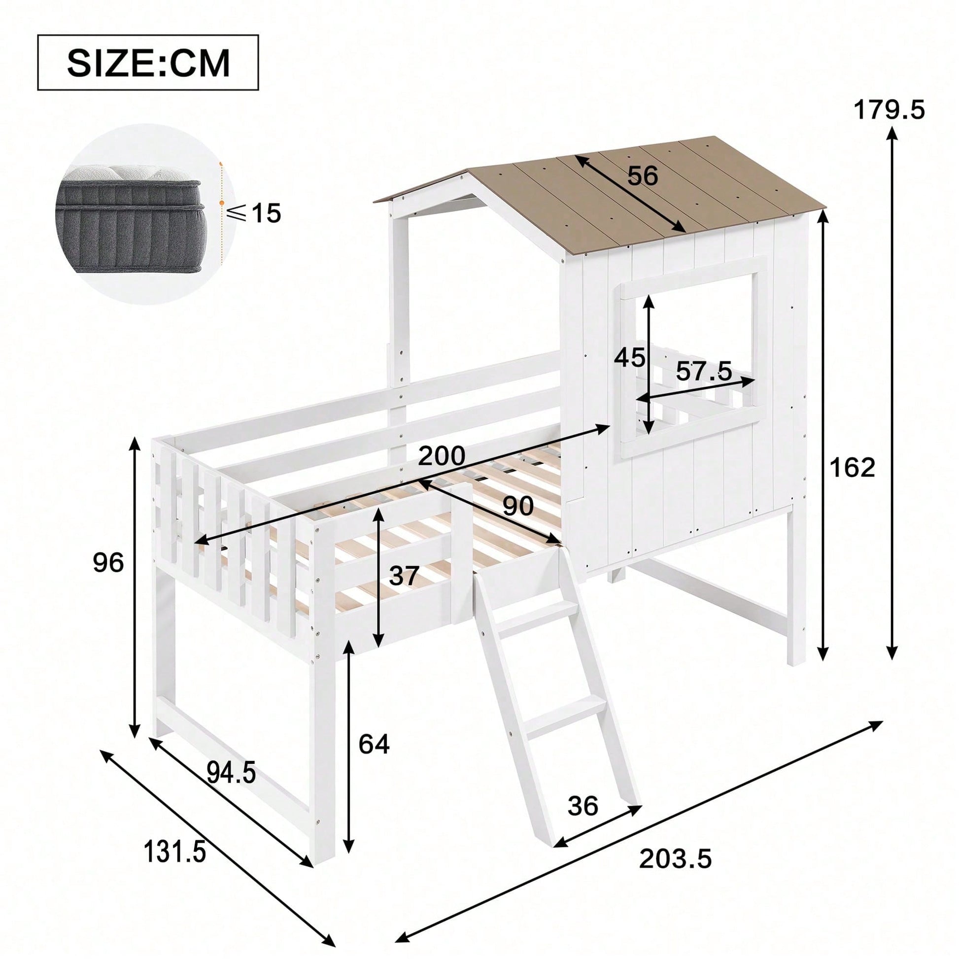 Dimensions hors tout : 203,5 x 131,5 x 179,5 cm Poids total : 49 kg Matelas assortis (matelas non inclus) : 90 x 200 cm (épaisseur du matelas ≤ 15 cm) Espace libre sous le lit : 64 cm Capacité de charge : 120 kg Caractéristiques Nom du produit : Lit cabane Couleur : Blanc + Naturel Matériau du cadre : Pin + MDF Matériau des lattes : Contreplaqué Méthode d'assemblage : À monter soi-même La structure est-elle interchangeable de gauche à droite ? Non Certifié FSC : Oui Nombre de colis : 2 Pays d'origine : Malaisie Remarque : Ce produit contient 2 colis. Il est normal que 2 colis soient reçus à des dates différentes, veuillez donc patienter.