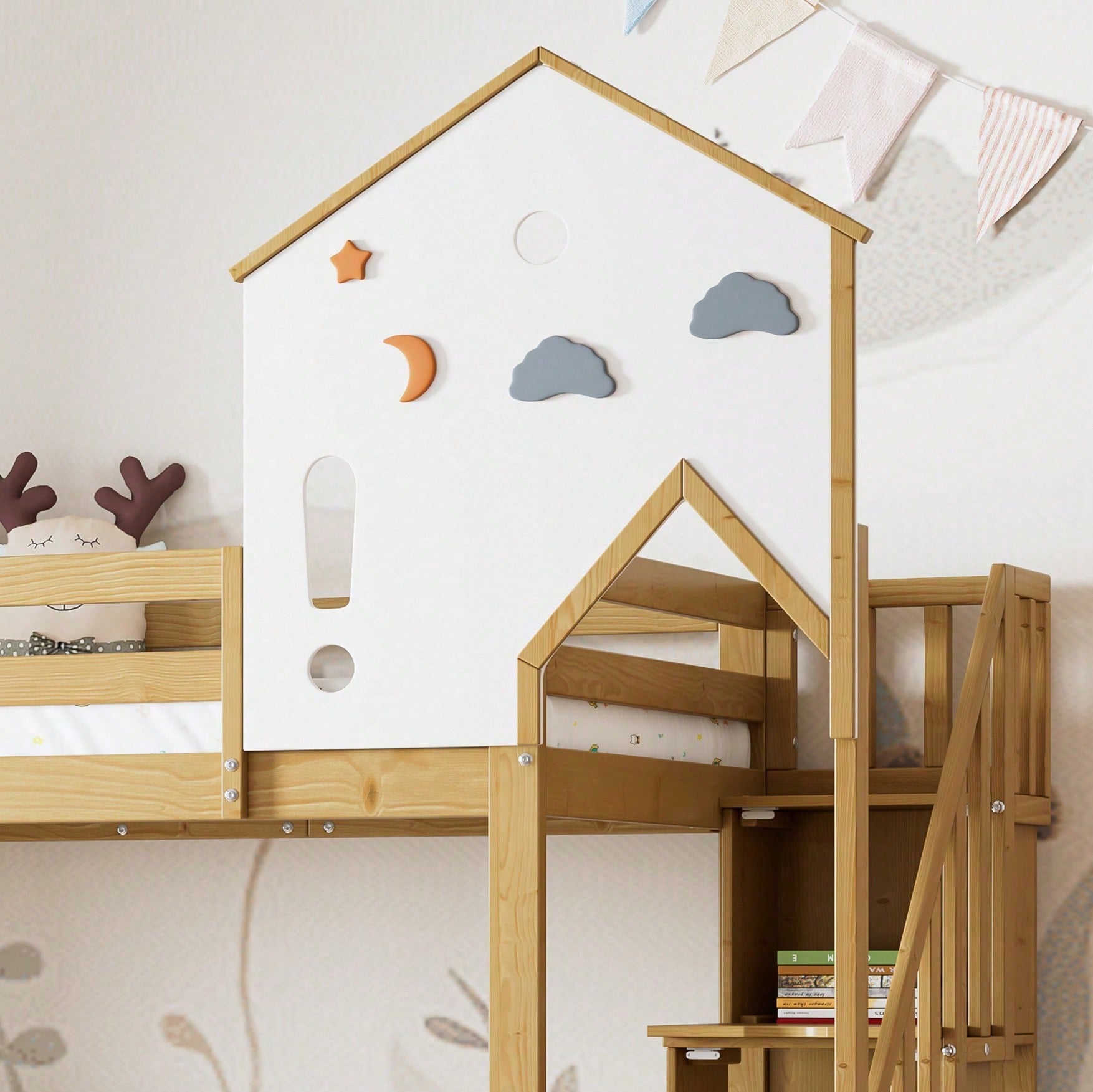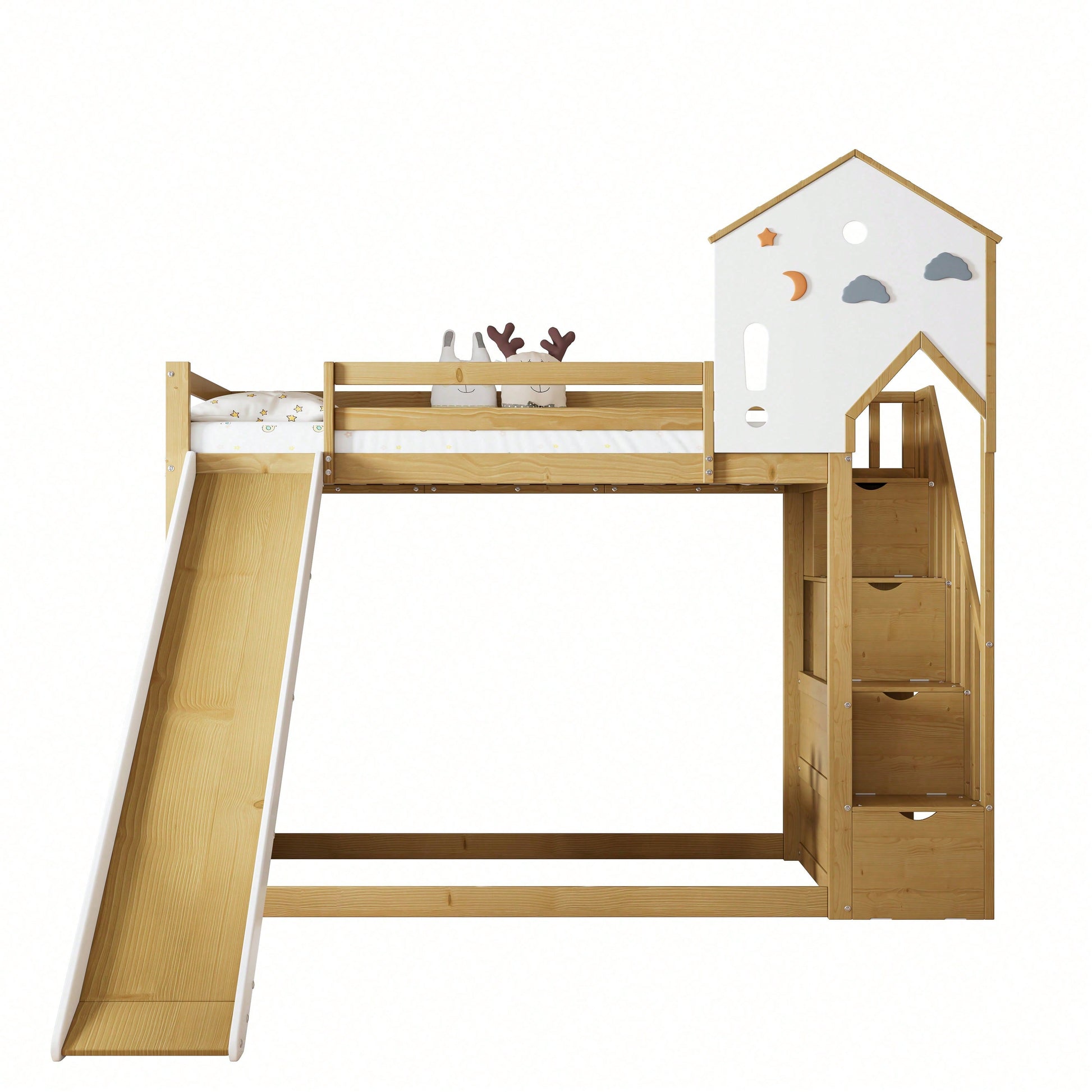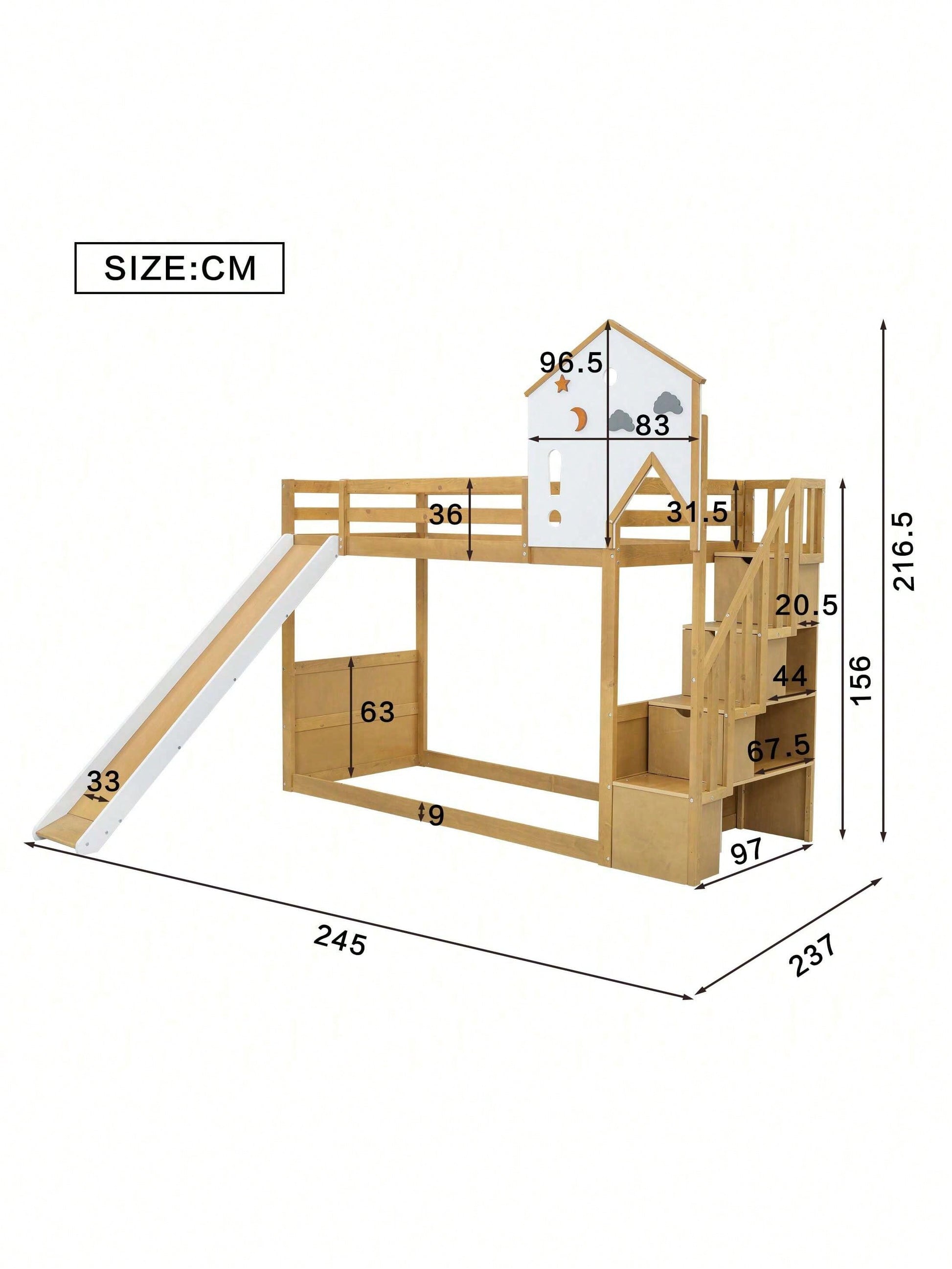 Spécifications Informations produit Code article : 532252345AAD Type de produit : Article combiné Nom du produit : Lit superposé, lit cabane, lit enfant, lit avec escalier d'angle, lit enfant avec toit et fenêtre, lit enfant avec 3 casiers dans l'escalier, lit superposé avec toboggan, pin + MDF, blanc + naturel, 90 x 200 cm Origine : Viet Nam Couleur principale : Blanc + naturel Matériau principal : Bois massif + MDF Dimensions du lit : 90 cm x 200 cm Dimensions du produit Longueur une fois assemblé (cm) : 245,00 Largeur une fois assemblé (cm) : 237,00 Hauteur une fois assemblé (cm) : 216,50 Poids du produit (kg) : 83,00 Dimensions du colis Sous-article 1 : WF532252AAD Quantité : 1 90 x 81 x 8 cm, 15 kg Sous-article 2 : WF532253AAD Quantité par paquet : 1 199 x 27 x 13 cm, 26 kg Sous-article 3 : WF532254AAD Quantité par paquet : 1 133,5 x 44 x 14 cm, 28 kg Sous-article 4 : WF532255AAD Quantité par paquet : 1 160 x 40 x 9,5 cm, 26 kg Caractéristiques du produit Conception pratique du lit escalier : Ce lit escalier est très peu encombrant. Pour vous permettre d'organiser l'espace sous le lit, le cadre de lit en dessous n'est pas équipé de sommier à lattes. Vous pouvez acheter votre propre sommier à lattes ou utiliser l'espace sous le lit comme rangement ou pour une table et des chaises pour enfants, offrant ainsi à votre enfant une grande liberté de mouvement. Design ludique : Le toit du lit superposé est orné de fenêtres en forme d'étoiles, de lunes et de nuages, ce qui en fait un élément charmant dans toute chambre d'enfant. Matériaux de haute qualité : Fabriqué en pin robuste et en MDF durable, ce lit allie l'esthétique naturelle du bois à la durabilité des matériaux modernes, garantissant longévité et stabilité. Lit superposé avec toboggan ludique : Le toboggan est un lien direct avec le bonheur, et chaque chute mène à une nouvelle aventure. Avec le toboggan, vos enfants peuvent libérer leur énergie, libérer leur créativité et réaliser leurs rêves d'aventure. Un jouet parfait pour tous les âges, qui garde le cœur jeune et stimule l'imagination ! Combinaison de couleurs élégante : L'harmonie du blanc et du bois naturel s'intègre parfaitement à différents styles d'intérieur et confère à la chambre d'un enfant ou d'un adolescent une atmosphère moderne et accueillante. Installation facile : Des instructions détaillées et des pièces complètes vous aideront à terminer le montage. Le plaisir de l'installation vous permettra d'apprécier encore plus ce lit.