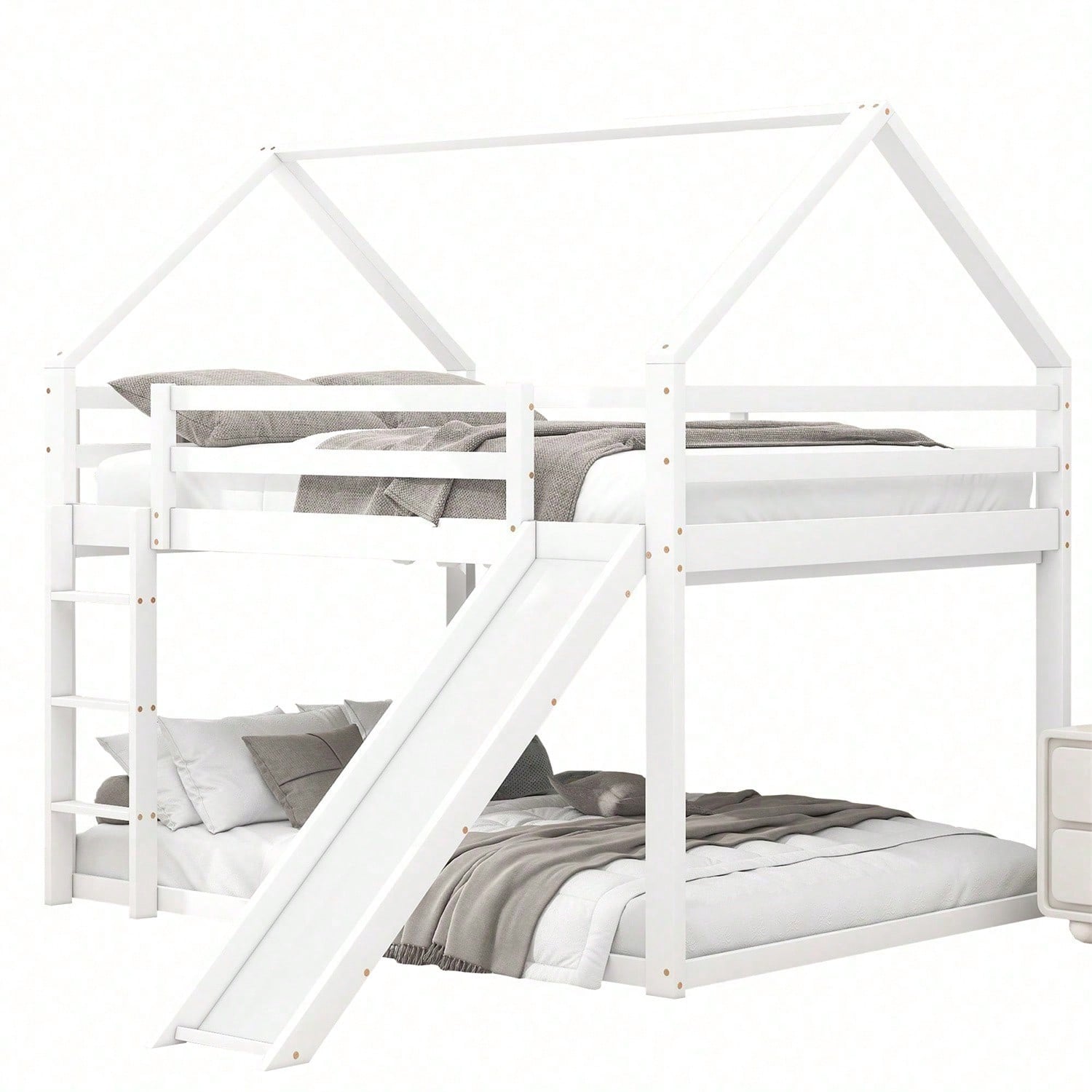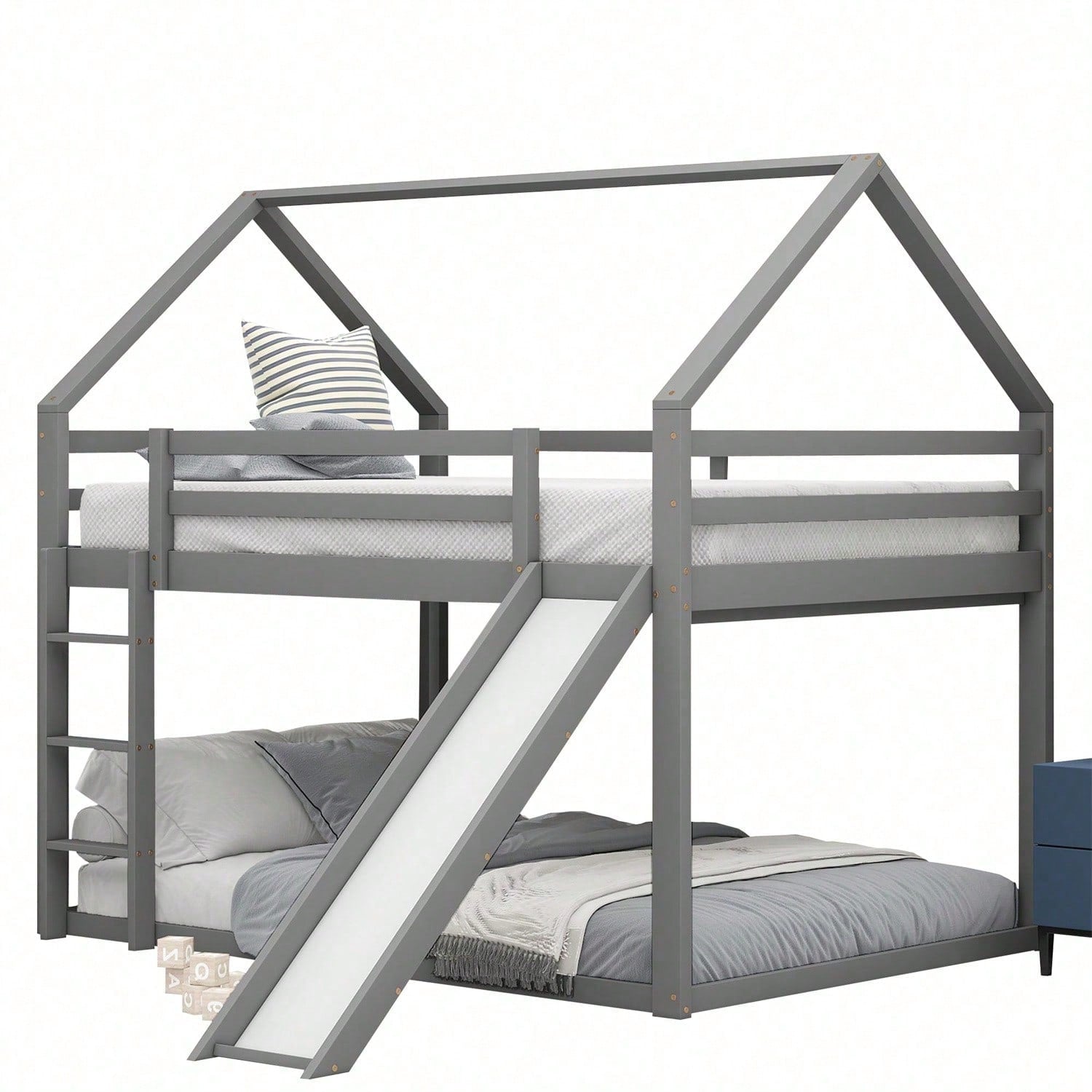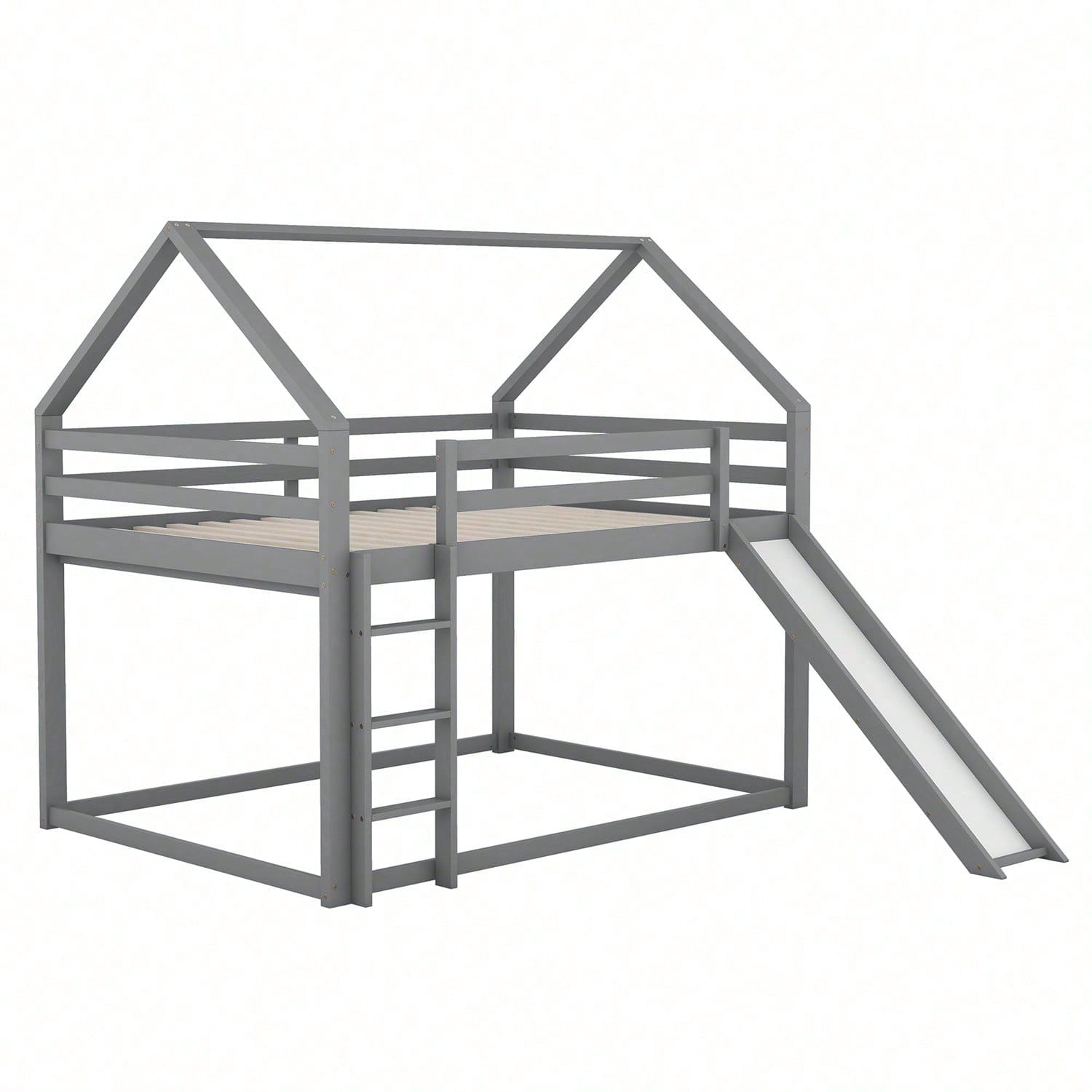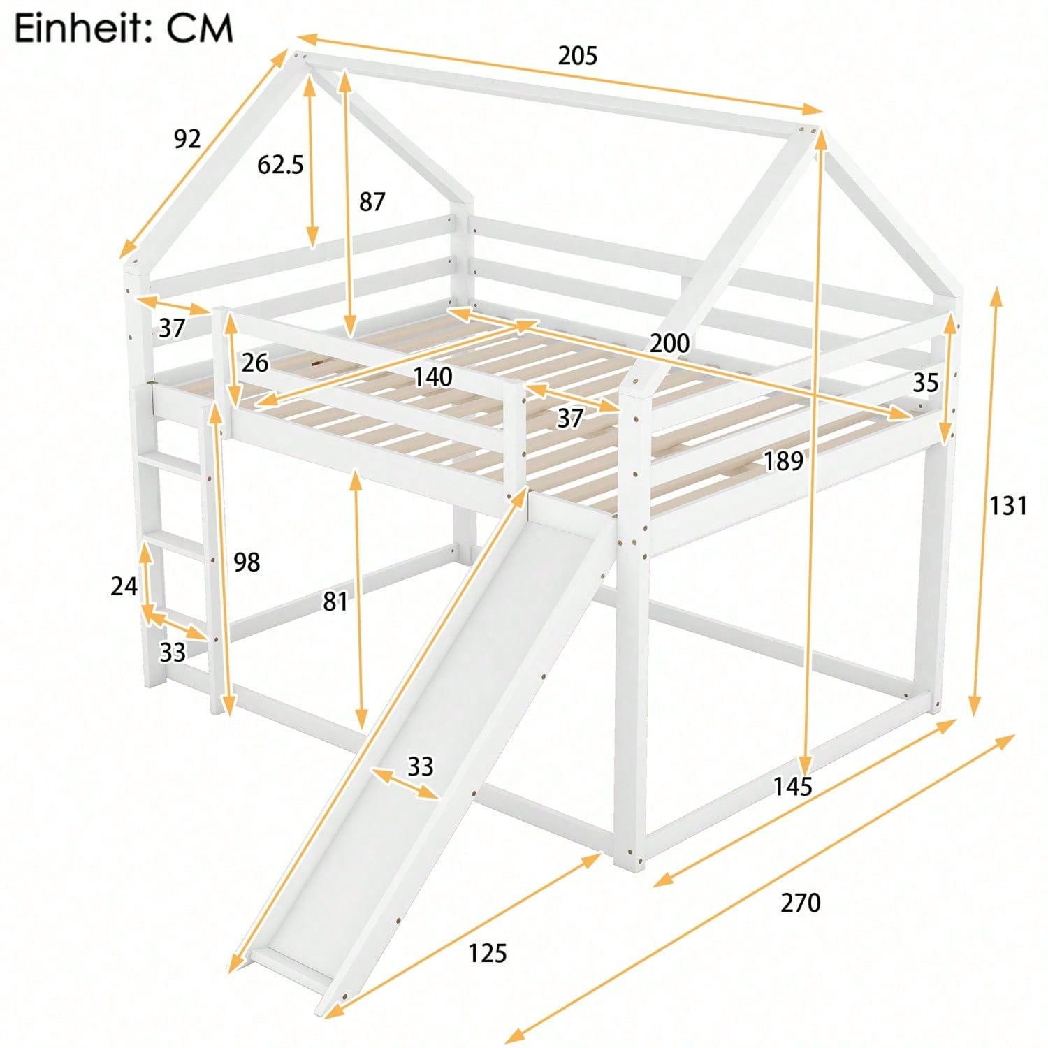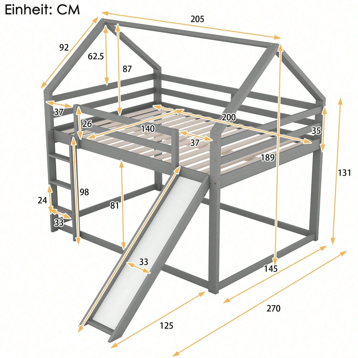 Spécifications Informations produit Code article : WX000401AAE-1 Type de produit : Article combiné Nom du produit : Lit double, lit cabane pour enfant, lit superposé avec toboggan et échelle, lit superposé haut pour chambre d'enfant, gris, 140 x 200 cm Couleur principale : Gris Matériau principal : Pin Dimensions du lit : 140 x 200 cm Dimensions du produit Longueur une fois assemblé (cm) : 205,00 Largeur une fois assemblé (cm) : 270,00 Hauteur une fois assemblé (cm) : 189,00 Poids du produit (kg) : 49,15 Dimensions du colis Sous-article 1 : WF315447AAE Quantité par colis : 1 198 x 27,5 x 15,7 cm 23,24 kg Sous-article 2 : WF315446AAE Quantité par colis : 1 151 x 40 x 14,2 cm, 29,36 kg Caractéristiques du produit [Lit cabane avec toboggan] Ce lit, en forme de maison unique, apporte une ambiance dynamique à votre chambre. Son toboggan ravira votre enfant. Il lui offre un espace de couchage et de détente. [Espace de couchage 140 x 200 cm] Les lits supérieur et inférieur offrent un espace de couchage de 140 x 200 cm. Votre enfant a ainsi plus d'espace pour se déplacer et deux enfants ne se sentiront pas à l'étroit. Si votre enfant invite un ami à dormir chez lui, ce lit sera largement suffisant ! [ enfant] Le lit inférieur est plus adapté aux jeunes enfants et réduit les risques d'escalade. Le lit supérieur est équipé d'une barrière robuste pour éviter les chutes. L'enfant peut facilement accéder au lit supérieur grâce à l'escalier, qui renforce la stabilité du lit. La position de l'escalier et du toboggan est réglable. [Cadre de lit en bois de haute qualité] Fabriqué en pin massif et en MDF, ce lit superposé est conçu pour durer et est solidement fixé par des vis robustes pour une stabilité optimale. Il est équipé d'un surmatelas intégré et d'un sommier à lattes robuste pour une longévité accrue de votre matelas. [Installation facile] Des instructions d'installation détaillées sont incluses. Les outils d'installation sont également inclus. Le montage vous aidera à comprendre la structure du lit et à l'apprécier encore plus.
