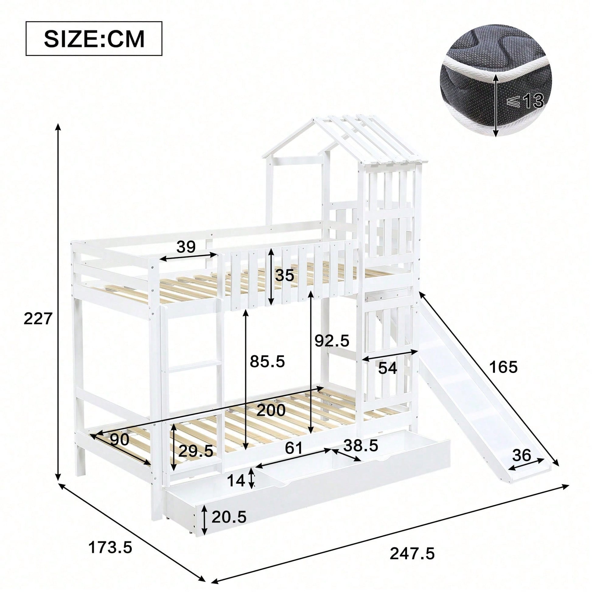 Poids et dimensions Dimensions totales : 247,5 x 173,5 x 227 cm Poids total : 78,5 kg Matelas assortis (matelas non inclus) : 90 x 200 cm (épaisseur du matelas : ≤ 13 cm) Distance entre les lits superposés : 92,8 cm Capacité de charge : 120 kg Caractéristiques Nom du produit : Lit superposé Couleur : Blanc Matériau du cadre : Pin + MDF Matériau des lattes : Contreplaqué Méthode d'assemblage : Auto-montage La structure est-elle interchangeable de gauche à droite ? Non Certifié FSC : Oui Nombre de colis : 3 Pays d'origine : Chine Remarque : Ce produit contient 3 colis. Il est normal que nous recevions 3 colis à des dates différentes ; merci de votre patience.