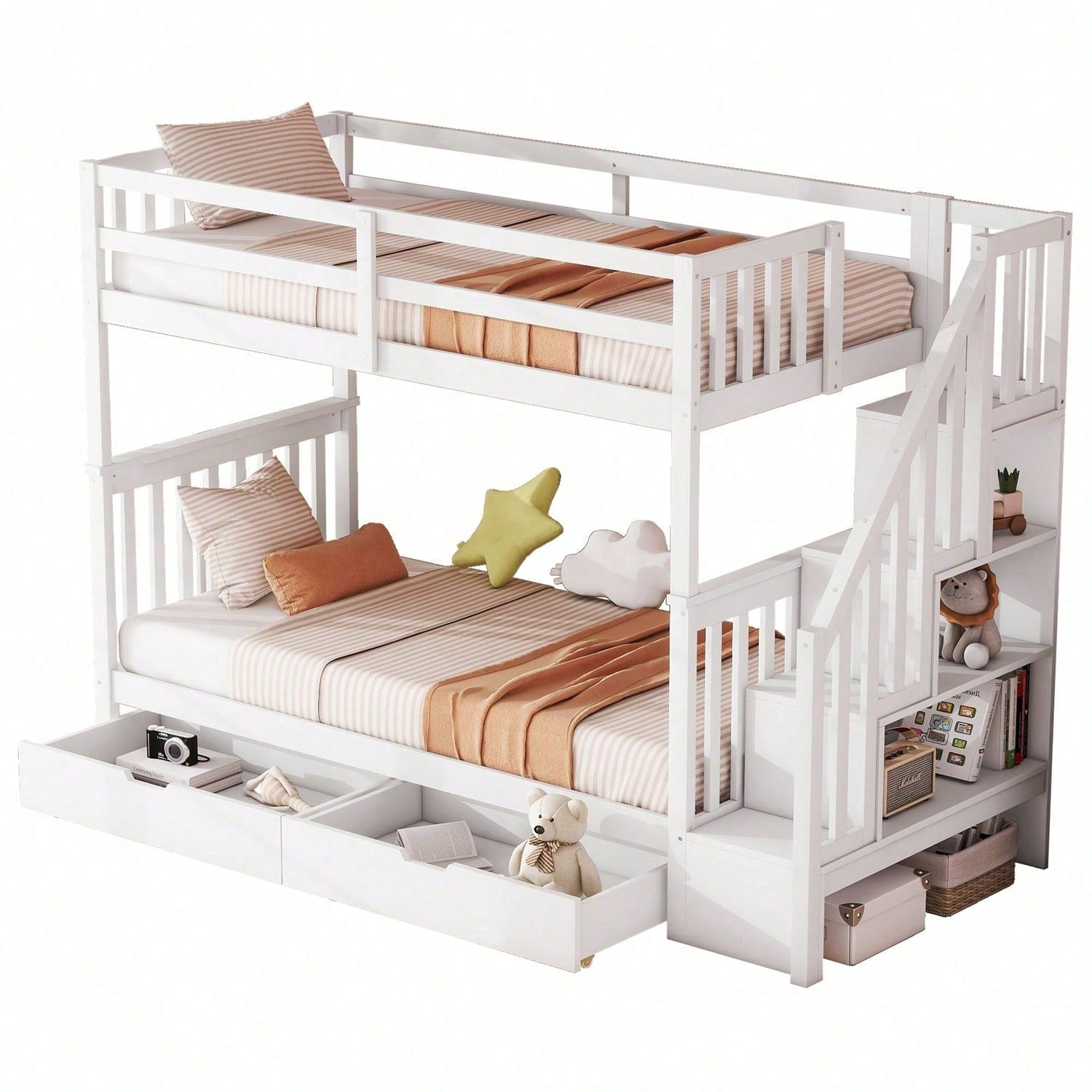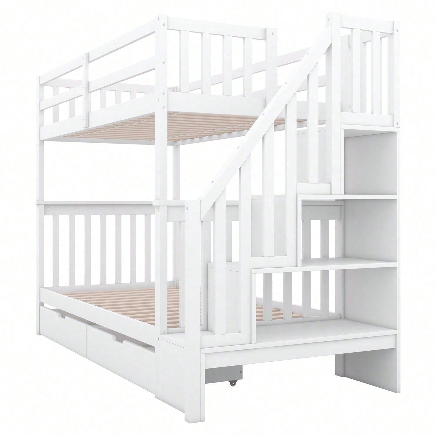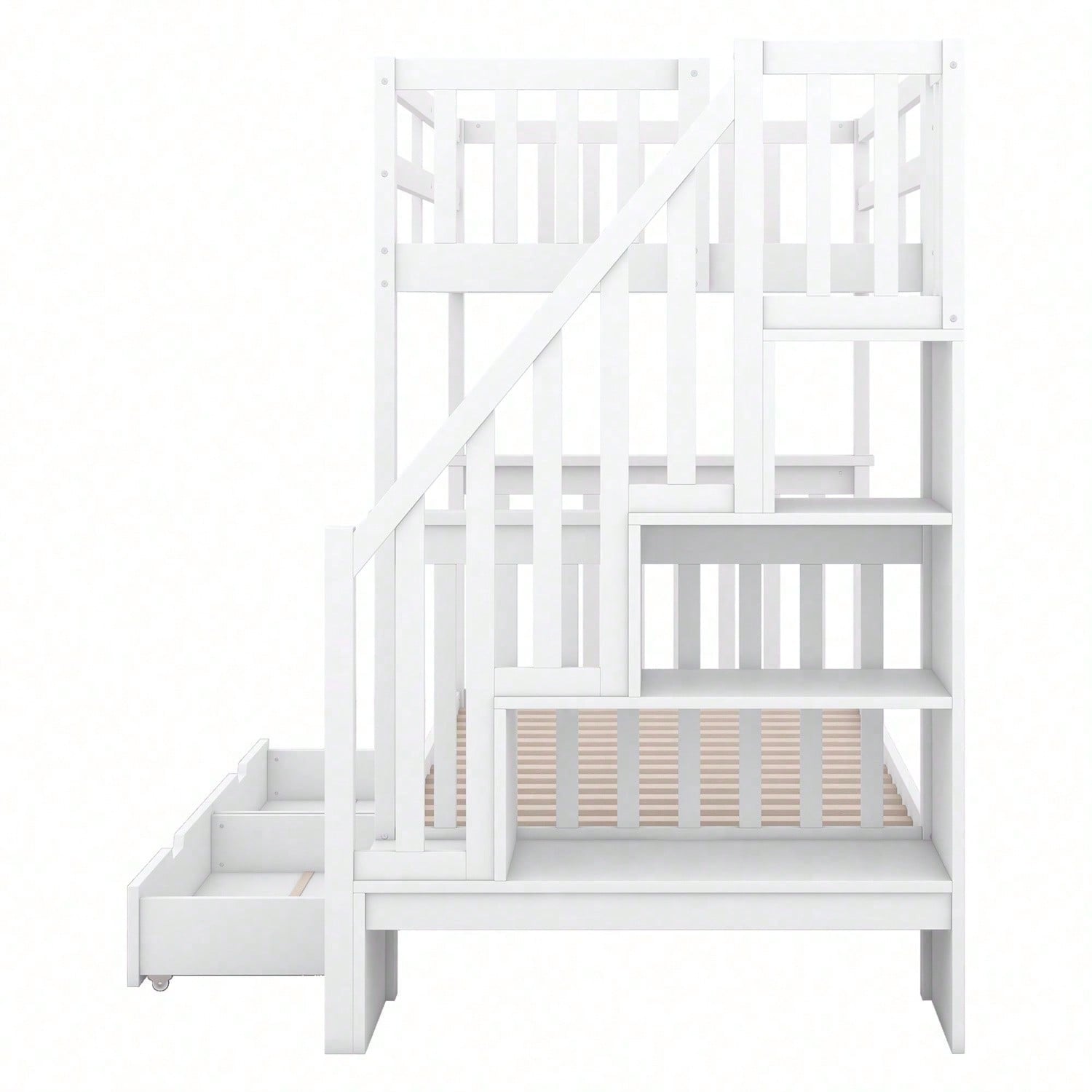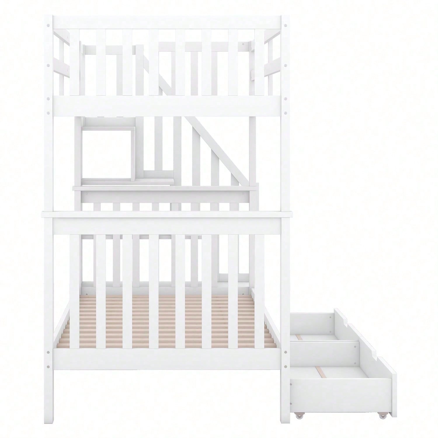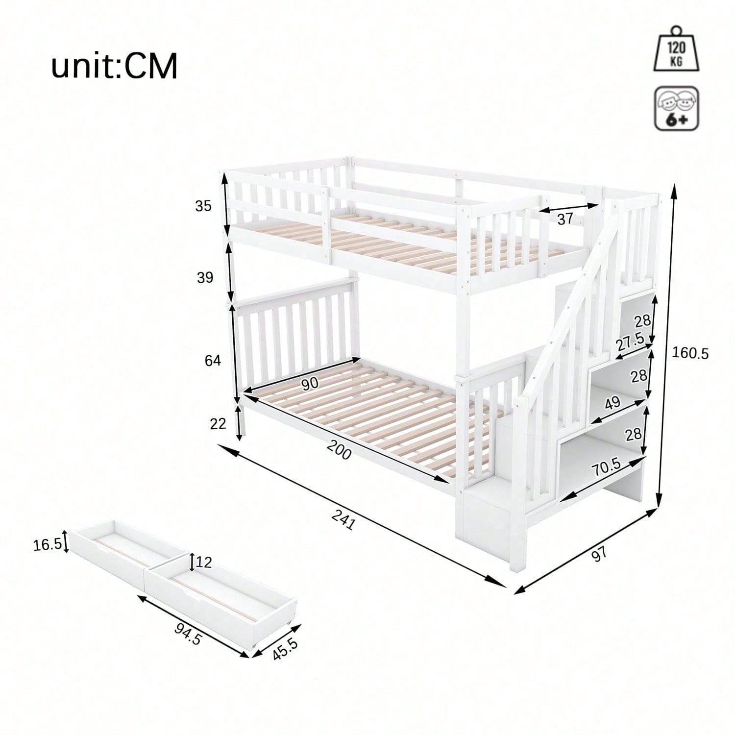 Spécifications Informations produit Code article : WX000818AAK Type de produit : Article combiné Nom du produit : Lit superposé 90 x 200 cm avec escalier, équipé de deux tiroirs, barrières hautes, certifié EN747-1, blanc Couleur principale : Blanc Matériau principal : Pin Dimensions du produit Longueur après assemblage (cm) : 241,00 Largeur après assemblage (cm) : 97,00 Hauteur après assemblage (cm) : 160,50 Poids du produit (kg) : 71,00 Dimensions du colis Sous-article 1 : WF321580AAK Quantité : 1 105 x 53 x 18 cm, 28,5 kg Sous-article 2 : WF321579AAK Quantité : 1 129,5 x 42,5 x 15 cm, 25,5 kg Sous-article 3 : WF321578AAK Quantité par colis : 1 198,5 x 32 x 17 cm, 26 kg