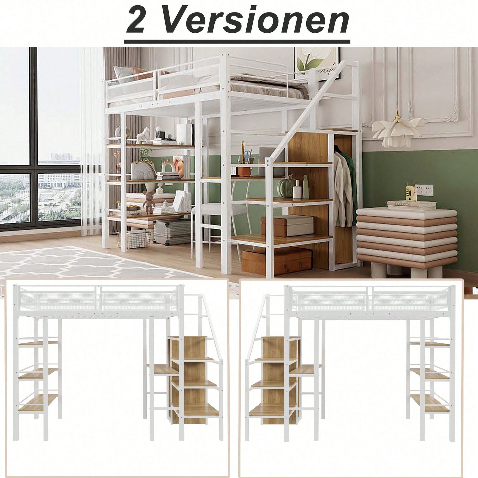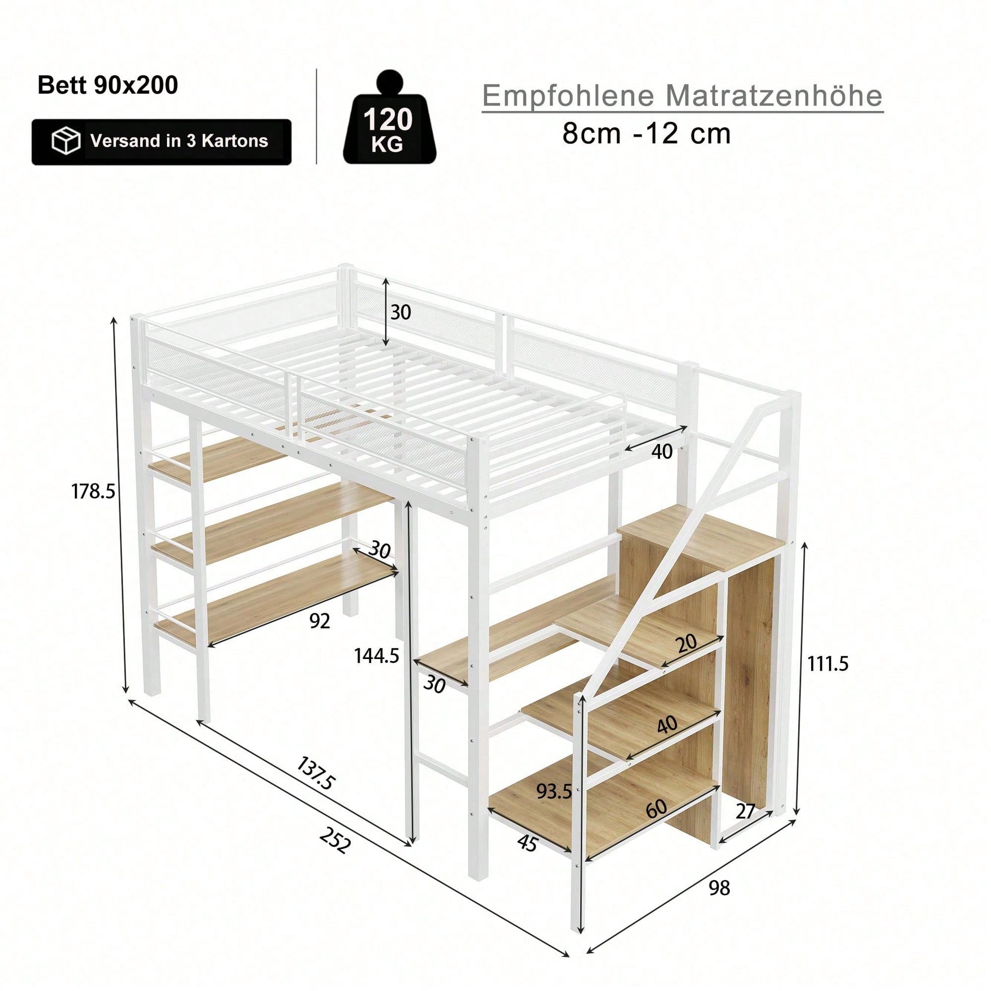 Información del producto Código del artículo: LDT00248AAK Tipo de producto: Artículo combinado Nombre del producto: Cama alta de 90 x 200 cm con estante de almacenamiento de tres niveles, escritorio, armario, escalones de con compartimento de almacenamiento, diseño de valla alta, cama de hierro, cama individual, color blanco Color principal: Blanco Material principal: Metal Tamaño de la cama: 90 x 200 cm Dimensiones del producto Largo ensamblado (cm): 252,00 Ancho ensamblado (cm): 98,00 Alto ensamblado (cm): 178,50 Peso del producto (kg): 60,00 Tamaño del paquete Subartículo 1: N623P176265W Cantidad del paquete: 1 102 x 45 x 20,5 cm 25,2 kg Subartículo 2: N623P176264W Cantidad del paquete: 1 101,5 x 44 x 23,5 cm 20 kg Subartículo 3: N623P176263W Cantidad por paquete: 1 110 x 42 x 17 cm 25,2 kg Características del producto Diseño multifuncional: El estante de almacenamiento de tres niveles proporciona espacio adicional para libros, juguetes u otros artículos pequeños, manteniendo el dormitorio organizado. El exclusivo escritorio es práctico y rápido para estudiar o trabajar; la cama también puede usarse como zona de ocio, entretenimiento, oficina o estudio. : Su diseño único y extremadamente práctico no solo tiene un buen efecto decorativo, sino que también garantiza la durante su uso. El marco de la cama está hecho de hierro macizo para garantizar su estabilidad y durabilidad. Escalera de con nivel de almacenamiento: Una escalera de proporciona y espacio de almacenamiento adicional. La escalera también está equipada con un armario para satisfacer las necesidades del usuario y mejorar la organización del dormitorio; la escalera se puede instalar a la izquierda o a la derecha. Resistente y duradera: La estructura de hierro es robusta y estable, lo que garantiza un uso prolongado sin preocupaciones. La capacidad máxima de carga es de 120 kg y el tamaño de colchón recomendado es de 8-12 cm. [La cama se envía en tres paquetes y no simultáneamente. Si tiene alguna pregunta sobre las piezas del producto, por favor, tome una foto y envíenosla; resolveremos el problema lo antes posible].