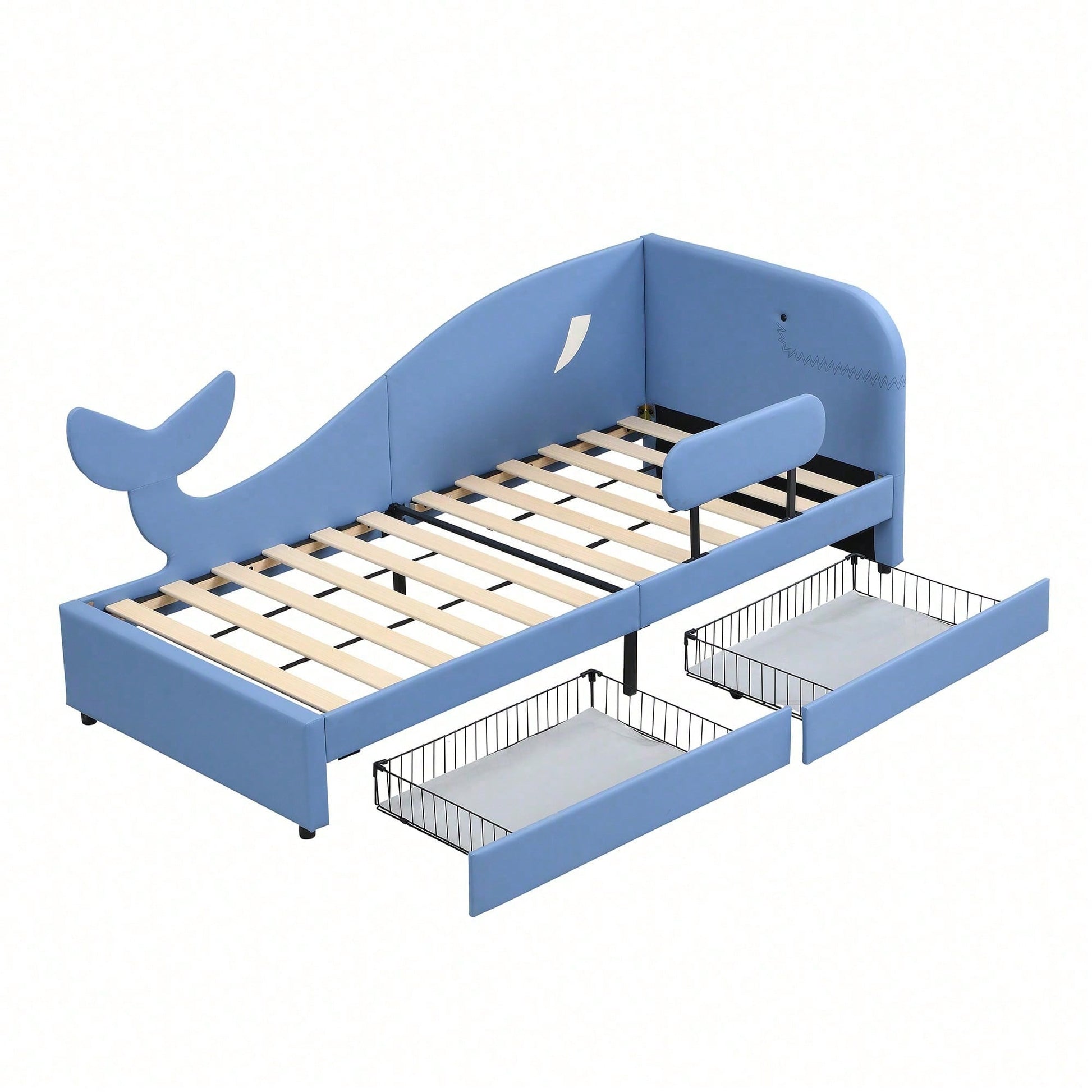 Características del producto Cuna infantil: Esta cama se puede conectar a la cama principal de los padres, lo que permite que los niños duerman de forma independiente y evita que los padres se den la vuelta y les hagan daño. Diseño con forma de ballena: Esta cuna está inspirada en las ballenas. Está fabricada en piel sintética azul y tiene una cola ligeramente elevada, lo que le da un toque divertido. Las laterales están equipadas con paneles metálicos acolchados para evitar que se caigan accidentalmente. Amplio espacio de almacenamiento: Esta cama cuenta con dos cajones con ruedas que se deslizan fácilmente y permiten guardar despertadores, juguetes, ropa y otros artículos de uso diario. Diseño y práctico: El diseño general de esta cama individual de 90 x 200 cm es sencillo y práctico. Cuenta con un práctico espacio de almacenamiento y los laterales de la cama están elevados para mayor . Somier de láminas con estructura metálica para un soporte óptimo: La cama está equipada con un robusto somier de láminas con estructura metálica. Esto proporciona un excelente soporte para el colchón y garantiza una buena ventilación para un sueño reparador. La moderna estructura de cama está diseñada no solo para ser estéticamente agradable, sino también para ofrecer un amplio espacio de almacenamiento. Instrucciones de cuidado: Utilice un paño suave de algodón o un cepillo para eliminar con cuidado el polvo y la suciedad de la superficie. Evite el uso de cepillos con cerdas duras o herramientas de limpieza ásperas, ya que pueden dañar la tela. Evite salpicaduras de líquidos sobre el producto. En caso de derrame accidental, límpielo inmediatamente con un paño limpio y absorbente. Fácil de instalar: Las instrucciones detalladas y las piezas completas le ayudarán a completar el montaje. El placer de la instalación le hará disfrutar aún más de la cama. Cama infantil empalmada, cama tapizada, diván, diseño en forma de ballena, sofá cama con estructura de metal Se recomienda un colchón de 90 x 200 cm para esta cama, con un grosor recomendado de 20 cm. La tela de esta cama individual tapizada es de PU cómodo, con una superficie suave y fácil de limpiar, y su color azul es fresco y adecuado para niños. Los laterales de la cama están elevados para mayor . Esta cama se puede usar sola o adjunta a la cama de los padres como cama infantil. Su innovadora funcionalidad y diseño contemporáneo se combinan para crear un mueble de dormitorio que combina estilo, comodidad y un práctico espacio de almacenamiento.