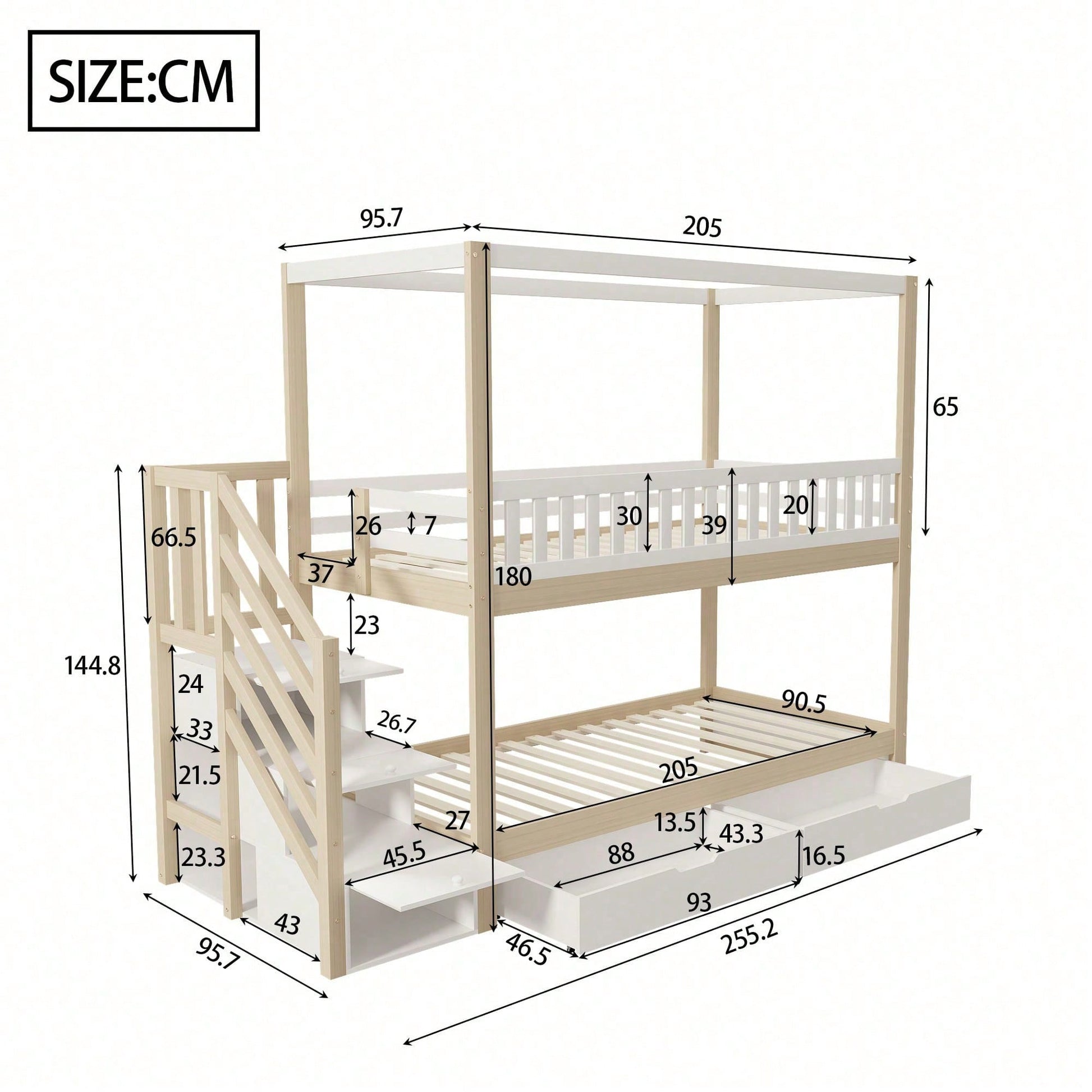 Especificaciones Información del producto Código del artículo: LDB00263AAN Tipo de producto: Artículo combinado Nombre del producto: Litera infantil de 90 x 200 cm, cama doble de madera maciza, forma de casa, diseño de puerta de , con compartimentos de almacenamiento y escalera de , diseño original en madera blanca, para niños y niñas Lugar de origen: China Color principal: Blanco + Natural Material principal: Madera Tamaño de la cama: 90 cm x 200 cm Personalización: Sí * Este producto ofrece servicio de personalización. Para más información, contacte con el vendedor. Dimensiones del producto Longitud ensamblada (cm): 255,20 Ancho ensamblado (cm): 95,70 Altura ensamblada (cm): 180,00 Peso del producto (kg): 90,00 Tamaño del paquete Subartículo 1: N623P195555N Cantidad por paquete: 1 100 x 39 x 11 cm, 12,5 kg Subartículo 2: N623P195552N Cantidad por paquete: 1 101 x 50,5 x 17,5 cm, 29 kg Subartículo 3: N623P195551N Cantidad por paquete: 1 188 x 26 x 21 cm, 28,6 kg Subartículo 4: N623P195550N Cantidad por paquete: 1 199*35*14,5 cm 24,8 kg Características del producto Litera infantil de forma única: esta litera de madera maciza tiene un diseño único en forma de casa que añade encanto e imaginación a la habitación de tu hijo. Escalera de con cajón: esta litera cuenta con una escalera de lateral que facilita la entrada y salida de tu hijo. Además, cada peldaño cuenta con un cajón oculto para organizar juguetes, libros y ropa. Amplio espacio de almacenamiento y organización: esta cama doble cuenta con dos cajones debajo de la cama, y cada peldaño de la escalera de lateral cuenta con un cajón, lo que proporciona un amplio espacio de almacenamiento para que tu hijo organice cómodamente juguetes, libros y otros artículos. Barandilla de : esta cama doble infantil cuenta con una barandilla de que proporciona a tu hijo un lugar cómodo y tranquilo para dormir. Está hecha de madera natural y acabada en blanco, lo que hace que toda la habitación sea cálida y acogedora. Robusta y duradera: esta litera está hecha de madera maciza de alta calidad, lo que garantiza una construcción estable y duradera. Los niveles superior e inferior están equipados con somieres que proporcionan un soporte estable para toda la cama, con una capacidad de carga de hasta 120 kg. La cama se adapta al crecimiento del niño, lo que garantiza una larga vida útil y un uso prolongado. Las dimensiones totales de la cama con somier son 255,2 x 95,7 x 180 cm (colchón no incluido).
