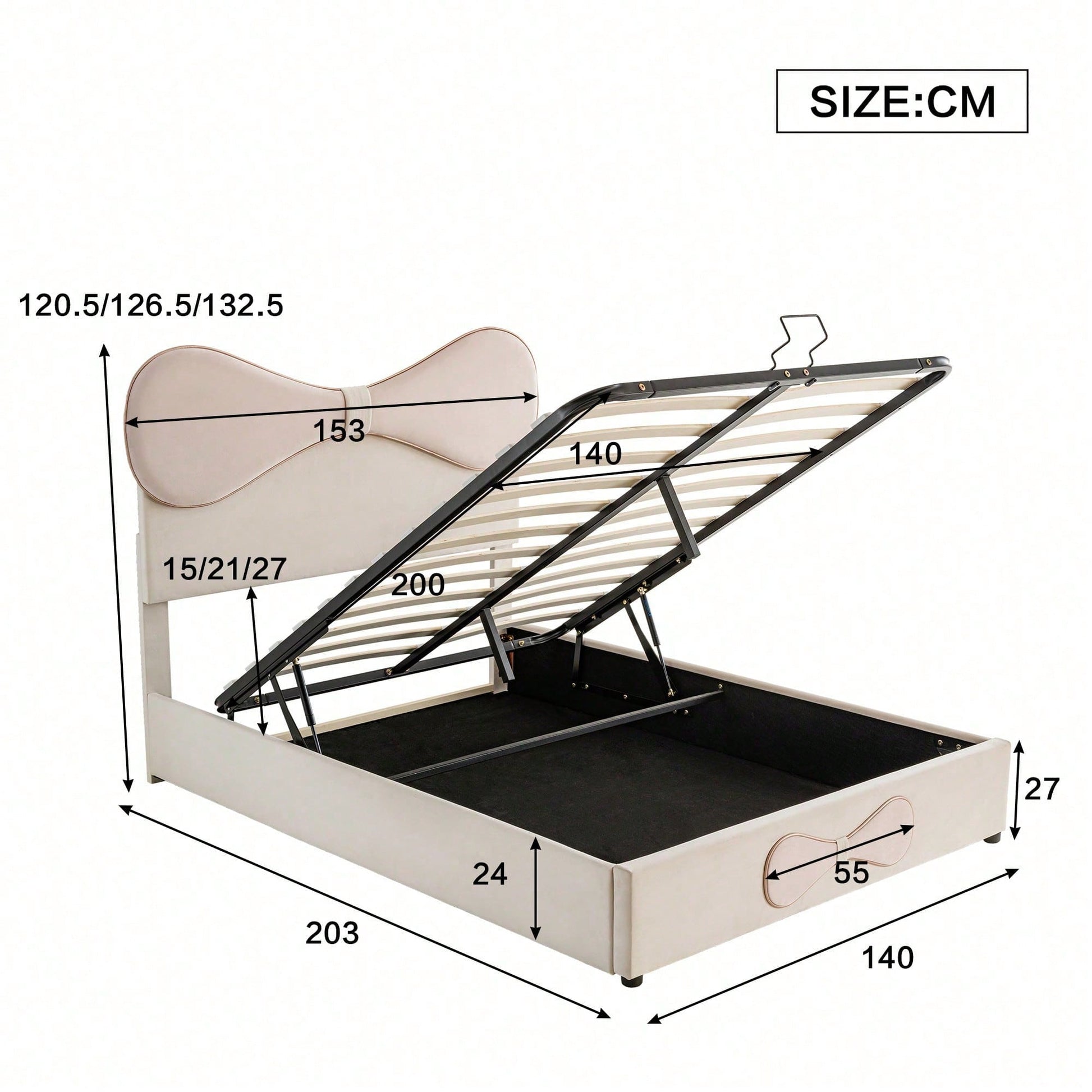 Características del producto Cama doble con ajuste hidráulico: Esta cama doble cuenta con una innovadora función hidráulica, con asas metálicas en los extremos del marco hidráulico que permiten levantarlo sin esfuerzo. Esto crea un espacio de almacenamiento de fácil acceso debajo de la cama, ideal para guardar ropa de cama, mantas u otros artículos. Cabecero tapizado ajustable: La altura del cabecero también se puede ajustar en tres posiciones, con incrementos de 6 cm cada una, para garantizar la postura más cómoda para leer o relajarse. Materiales de alta calidad: Esta cama tapizada está hecha de terciopelo blanco y rosa de alta calidad, que no solo es atractivo, sino también my resistente al desgaste. Confort óptimo: La cama está equipada con 12 bases de láminas y un pedestal metálico, mientras que dos patas metálicas garantizan un soporte firme y un descanso . La altura del cabecero ajustable en tres posiciones le permite encontrar su postura preferida para dormir. Instrucciones de cuidado: Utilice un paño de algodón suave o un cepillo para eliminar suavemente el polvo y la suciedad de la superficie. Evite usar cepillos con cerdas duras o herramientas de limpieza ásperas, ya que podrían dañar el terciopelo. Evite salpicaduras de líquidos sobre el producto. En caso de derrames accidentales, límpielos inmediatamente con un paño limpio y absorbente. Fácil de instalar: Las instrucciones detalladas y las piezas completas le ayudarán a completar el montaje. El placer de la instalación le hará disfrutar aún más de la cama. Cama doble tapizada hidráulica, cabecero ajustable, cabecero tapizado con lazo, terciopelo Medidas del colchón para esta cama tapizada: 140 x 200 cm; grosor recomendado: 20 cm. Esta cama doble tapizada hidráulica combina características innovadoras con un diseño moderno para crear un mueble de dormitorio que combina estilo, comodidad y un práctico espacio de almacenamiento. El somier de láminas con estructura metálica proporciona un soporte óptimo y garantiza una buena ventilación para un sueño reparador. El terciopelo es suave al tacto, y la moderna estructura de cama no solo es estéticamente agradable, sino que también ofrece un amplio espacio de almacenamiento. Ventajas: 1. Amplio espacio de almacenamiento debajo de la cama 2. Cabecero moldeado con altura ajustable 3. Cómodo material de terciopelo 4. Estructura de cama con soporte metálico 5. Se adapta a diversos estilos de decoración