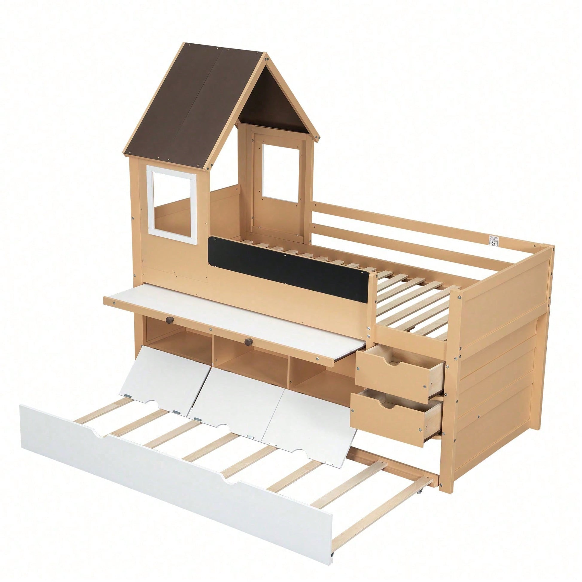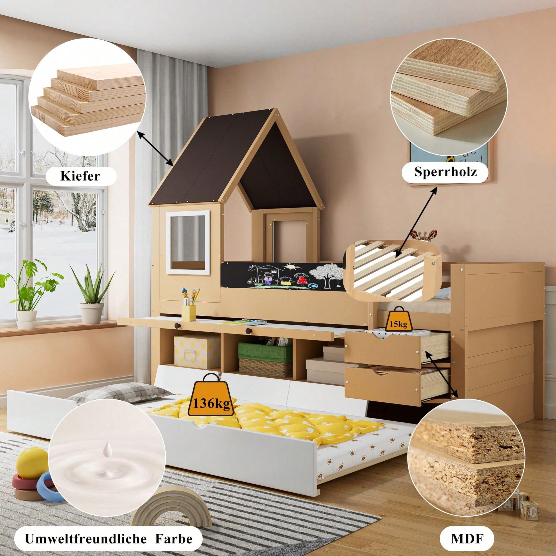 Características del producto Amplio espacio de almacenamiento: La cama es especialmente práctica y perfecta para niños. Debajo de la cama hay tres armarios con puertas abatibles donde los niños pueden guardar fácilmente libros, juguetes y otros artículos. La escalera no solo facilita la entrada y salida de la cama, sino que también cuenta con dos cajones en el hueco, lo que ofrece a los niños más opciones para guardar objetos adicionales. Este diseño evita el polvo y garantiza un ambiente ordenado. Precioso techo marrón: La litera superior está hecha de varias tablas de madera marrón oscuro en forma de cabaña, con ventanas marrón claro junto a la cama, lo que crea un aspecto interesante a la vez que proporciona privacidad. Los detalles de las ventanas sobre la cama recuerdan al exterior de una casa real y añaden un toque lúdico a la habitación. Mesa extensible: Esta litera multifuncional cuenta con una mesa extensible debajo que sirve como banco de trabajo, ideal para otros usos. Práctica cama extraíble: Esta litera está equipada con una cama extraíble debajo, con cuatro ruedas para facilitar su desplazamiento. Pizarra de grafiti infantil: La barandilla junto a la cama sirve como pizarra de grafiti, dando espacio a la imaginación de los niños. Fácil instalación: Nuestros juegos de dormitorio incluyen instrucciones claras e ilustradas y todas las piezas de repuesto. Todos los tornillos están etiquetados y embalados en bolsas separadas, al igual que todas las piezas. La superficie lisa lacada es muy fácil de limpiar. Recomendaciones de mantenimiento: Para la limpieza diaria, simplemente limpie la unidad suavemente con un trapo. Puede dejarla secar al aire durante unos días tras la entrega. Garantizamos que la pintura es apta para su uso y segura. Además, no la cuelgue del techo para jugar. Litera, cama tipo casa del árbol con cajones y cama extraíble, con mesa extraíble y amplio espacio de almacenamiento. Se recomiendan colchones de 90 x 200 y 90 x 190 cm para esta litera, con un grosor recomendado de 15 cm. Esta litera aporta calidez y romanticismo a su dormitorio con su diseño único y sus finos detalles. Perfecta para niños que adoran los temas bonitos y divertidos. Su agradable color y su forma, cuidadosamente elaborada, invitan a soñar sin límites. El patchwork de blanco y marrón crea un ambiente cálido y acogedor, perfecto para una habitación infantil o un dormitorio pequeño. La pequeña ventana en el cabecero añade encanto y funciona también como elemento decorativo. También cuenta con espacio de almacenamiento debajo, que no solo sirve como un cómodo lugar para dormir, sino también como un práctico organizador de espacio. El diseño general logra un equilibrio entre funcionalidad y estética, lo que la convierte en la opción ideal para cualquier hogar.
