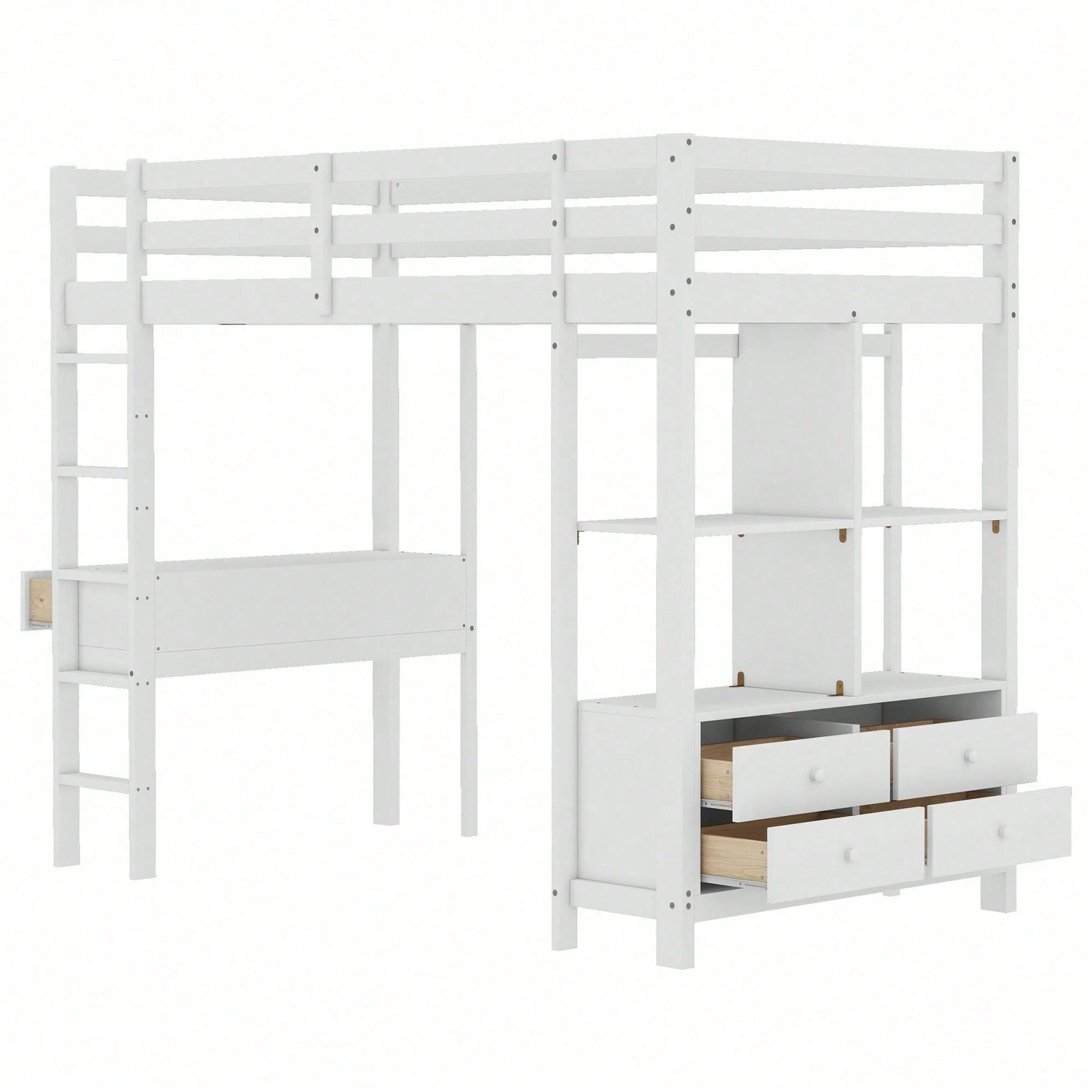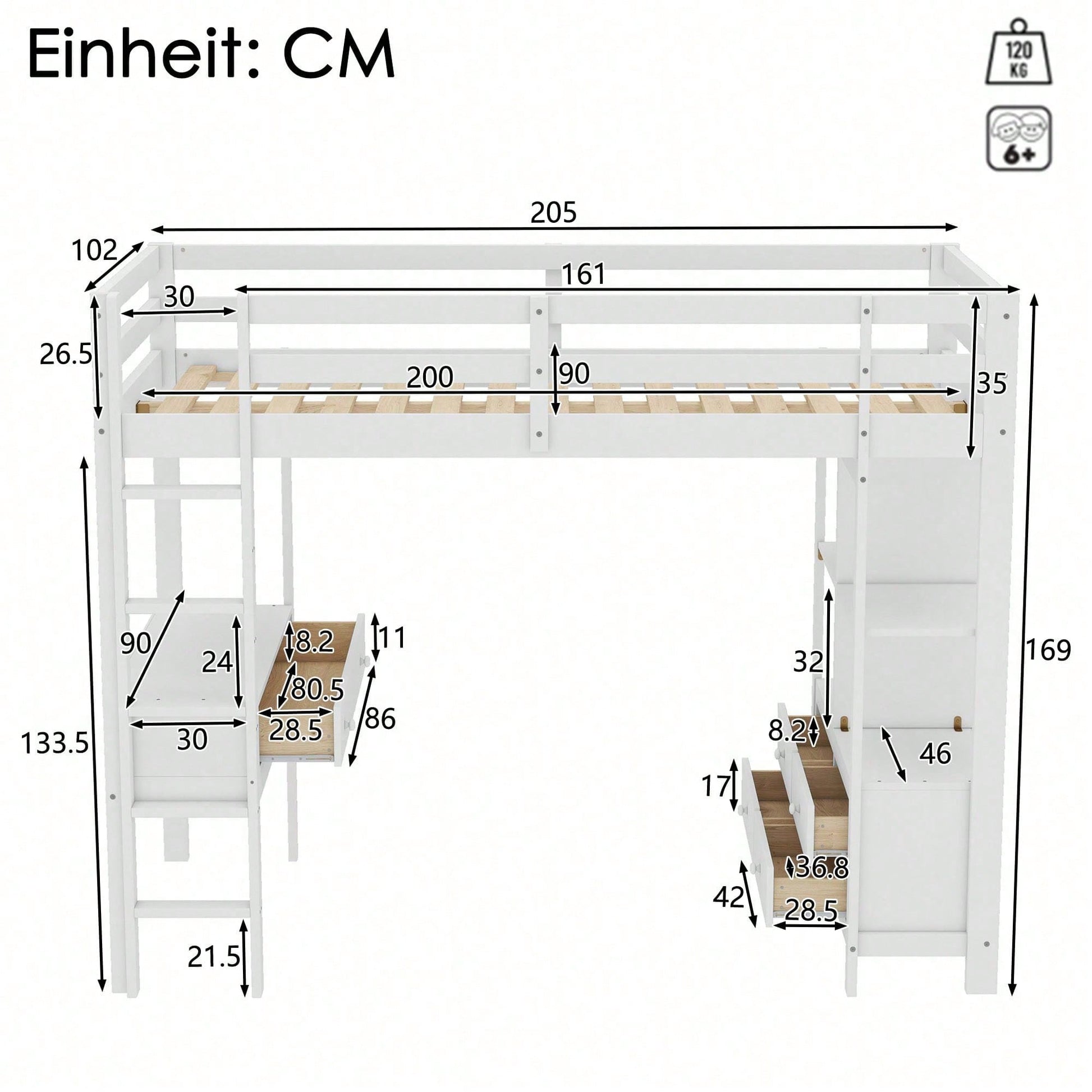 Información del producto Código del artículo: WX000702AAK-2 Tipo de producto: Artículo combinado Nombre del producto: =(WX000702AAK-1) Cama alta infantil, 90 x 200 cm, con cajones y escritorio, sin colchón, color blanco Color principal: Blanco Material principal: Pino Tamaño de la cama: 90 cm x 200 cm Dimensiones del producto Largo ensamblado (cm): 205.00 Ancho ensamblado (cm): 102.00 Alto ensamblado (cm): 169.00 Peso del producto (kg): 74.00 Tamaño del paquete Subartículo 1: N636P225103K Cantidad del paquete: 1 97.03 x 45.47 x 20.07 cm 28.35 kg Subartículo 2: N636P225102K Cantidad por paquete: 1 96,01 * 37,59 * 22,1 cm 24,25 kg Subartículo 3: N636P225101K Cantidad por paquete: 1 197,99 * 30,48 * 16 cm 24,8 kg Características del producto Diseño único: Diseño tipo loft con escritorio, estantería y 5 cajones grandes, que proporciona un espacio cómodo para estudiar o trabajar. Segura y fiable: La cama superior está rodeada de barandillas robustas para mayor . Montaje flexible: Los cajones se pueden instalar en cualquier dirección, lo que le permite elegir con flexibilidad según sus preferencias o necesidades. Estructura de cama de madera robusta: Esta cama alta está hecha de madera de pino de alta calidad para un soporte resistente y una gran durabilidad. La cama se envía en tres paquetes desde Alemania. A veces los paquetes llegan en momentos diferentes, pero para garantizar que se cumplan sus expectativas, tenga paciencia o comuníquese con nuestro amable servicio de atención al cliente.