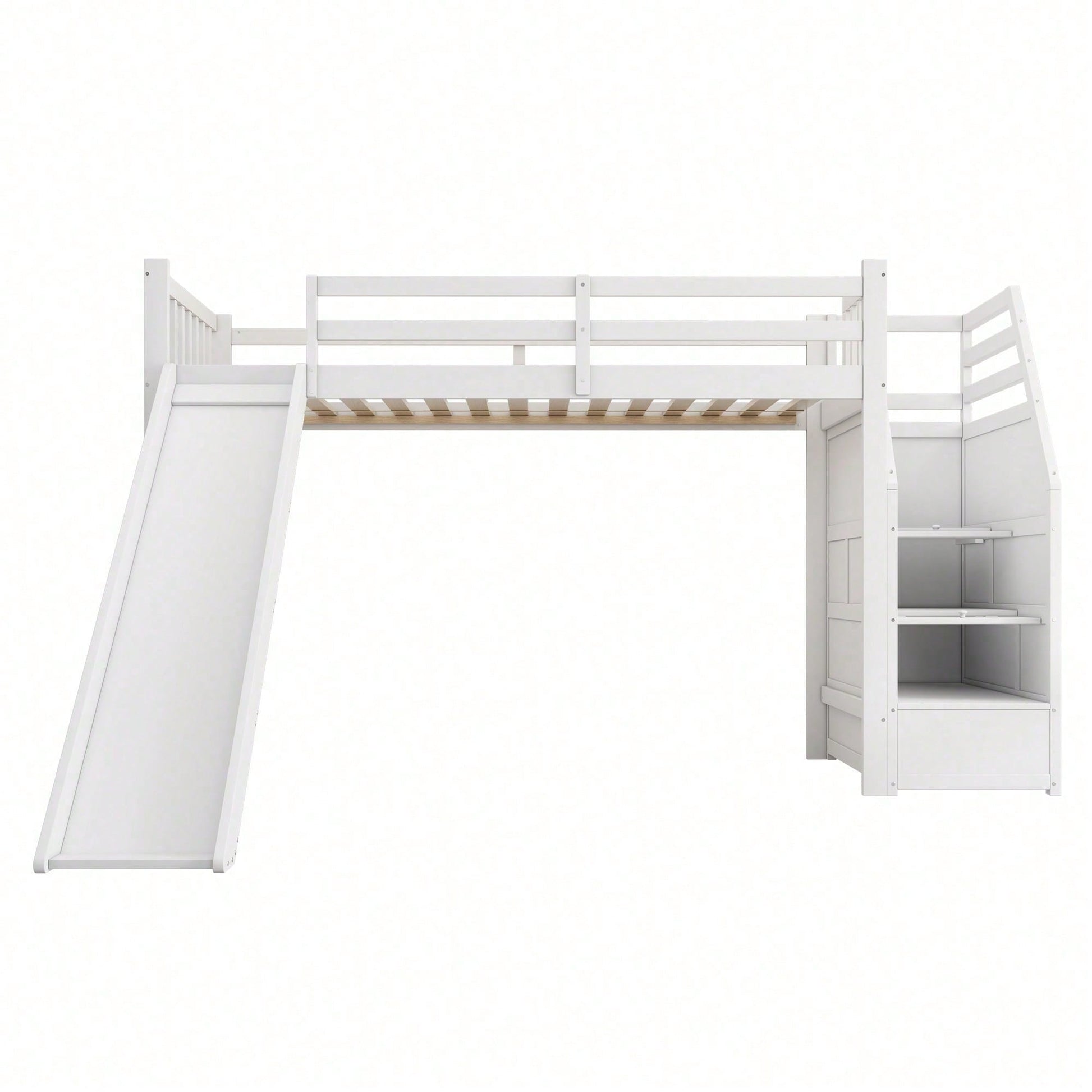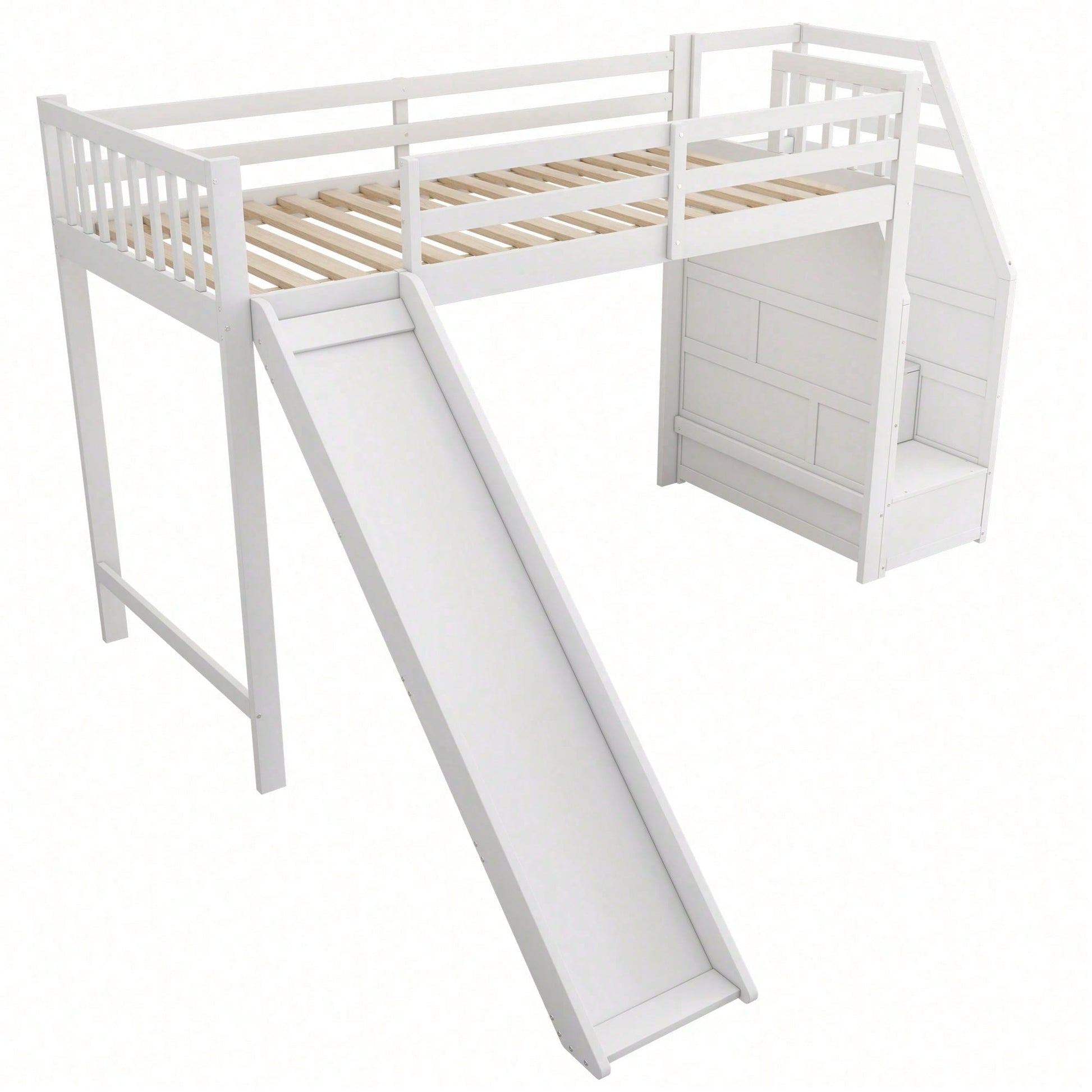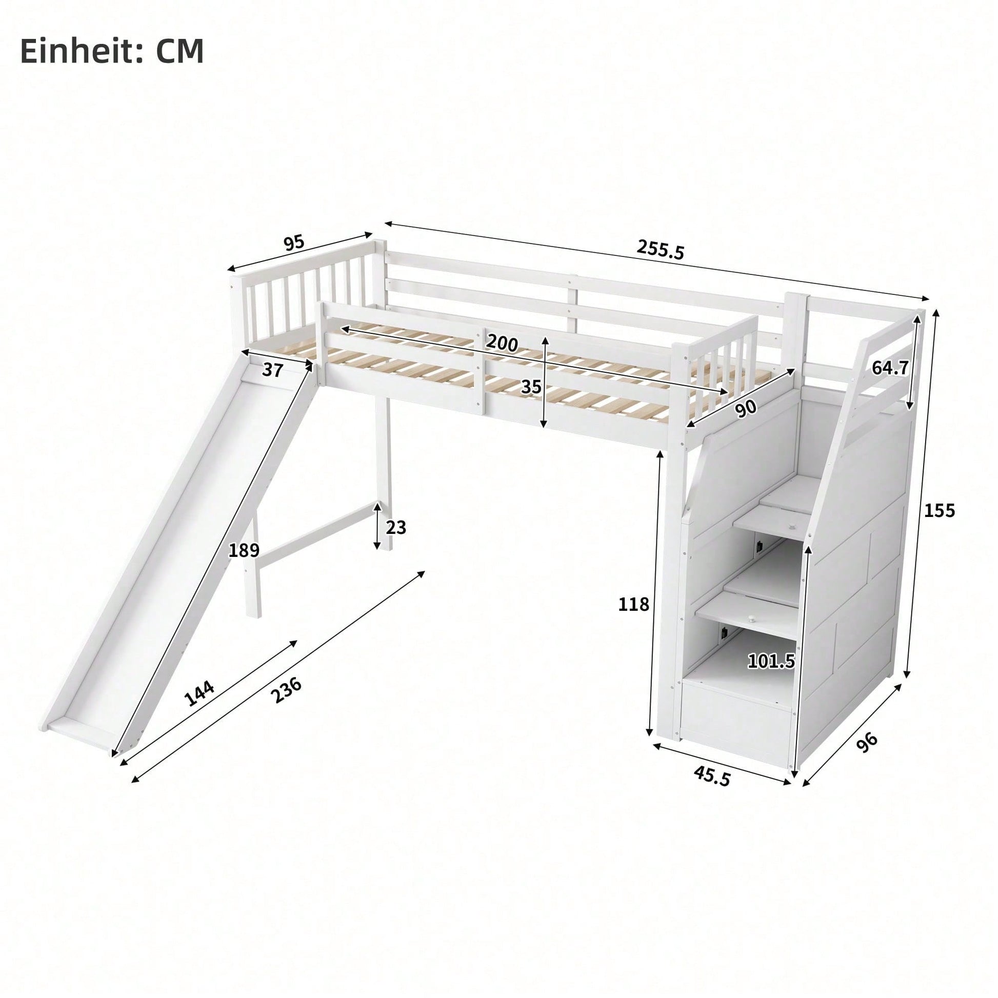Especificaciones Información del producto Código del artículo: WX000312AAK-1 Tipo de producto: Artículo combinado Nombre del producto: (=WX000312AAK) Cama alta infantil de 90 x 200 cm, con tobogán y escalera, con certificación EN747, sin colchón, color blanco Color principal: Blanco Material principal: Pino Tamaño de la cama: 90 x 200 cm Dimensiones del producto Largo (cm): 255,50 Ancho (cm): 236,00 Alto (cm): 155,00 Peso (kg): 70,00 Tamaño del paquete Subartículo 1: N636P254977K Cantidad del paquete: 1 123,95 x 50,8 x 14,99 cm, 28,35 kg Subartículo 2: N636P254976K Cantidad por paquete: 1 197,87 x 22,35 x 18,8 cm 22,85 kg Subartículo 3: N636P254975K Cantidad por paquete: 1 175,77 x 39,88 x 11,94 cm 22,25 kg Características del producto Construcción robusta: Fabricada con pino macizo y MDF de alta calidad, esta cama tiene una estructura fiable y una gran capacidad de carga para un uso prolongado, lo que garantiza resistencia y durabilidad. Diseño apto para lofts: Esta cama alta cuenta con la certificación EN747 y es apta para niños a partir de seis años. Su diseño en forma de loft no solo ofrece espacio para que los niños duerman en la parte superior, sino que también ofrece amplio espacio debajo para guardar cosas, jugar o colocar muebles. Esto optimiza el espacio. Equipada con tobogán: Esta cama alta cuenta con un tobogán que facilita el acceso a la cama, satisfaciendo las ganas de jugar y explorar de los niños y aumentando la diversión. Escalones de almacenamiento: Los escalones de la cama están diseñados para almacenar objetos, lo que facilita el acceso a los niños, y también permite guardar libros, juguetes, etc., haciendo que el dormitorio esté más ordenado y ordenado. La cama se envía en tres paquetes desde Alemania. En ocasiones, los paquetes llegan en diferentes momentos, pero para garantizar que cumplamos con sus expectativas, le rogamos que tenga paciencia o contacte con nuestro amable servicio de atención al cliente.