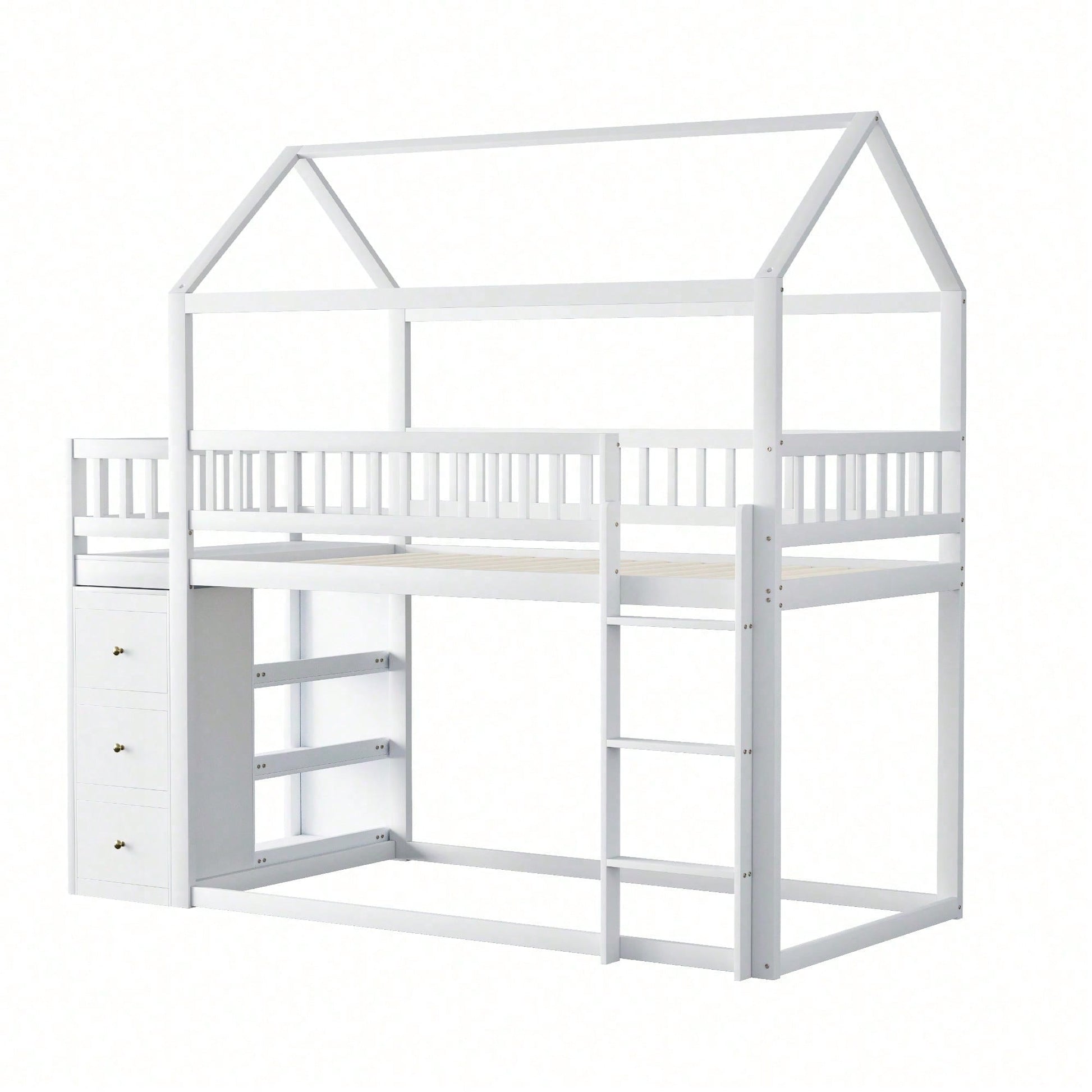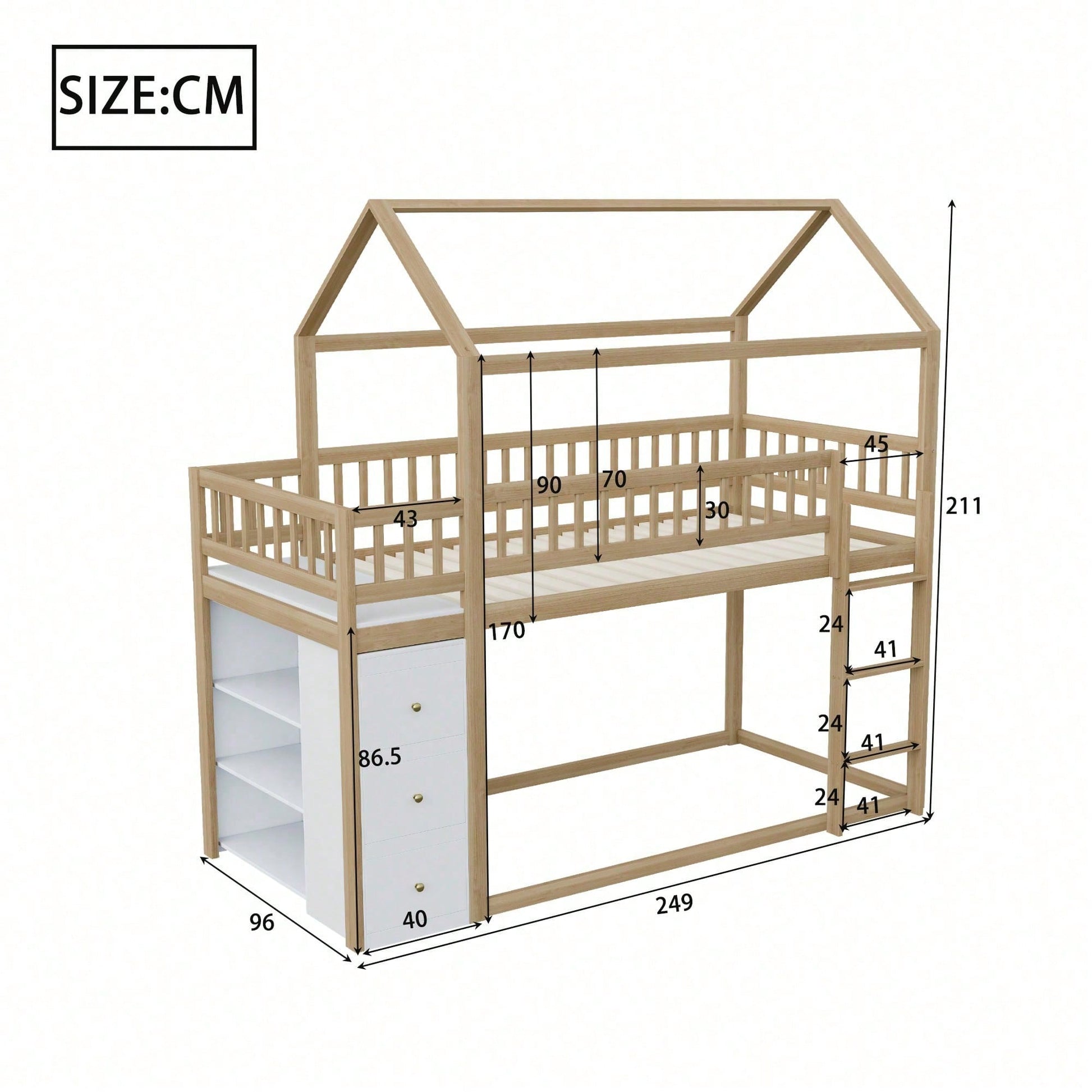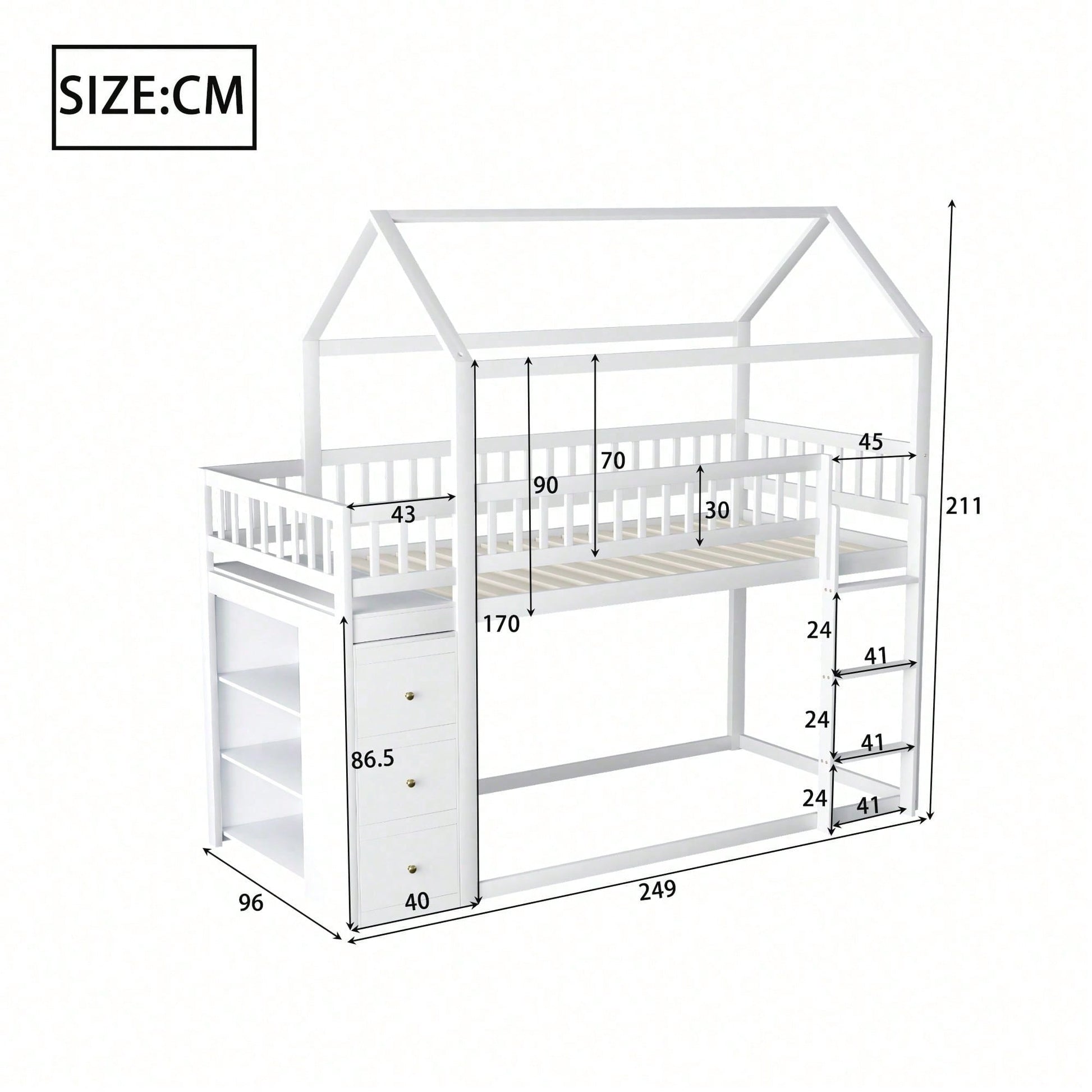 Información del producto Código del artículo: LDB00280AAK Tipo de producto: Artículo combinado Nombre del producto: Litera infantil de 90 x 200 cm, forma de casa, diseño de valla de , con baúl y estantes, cama alta baja con escalera, estructura de madera maciza, color blanco Lugar de origen: China Color principal: Blanco Materiales principales: Madera Rellenos: Madera Usos: Dormitorio Tamaño de la cama: 90 x 200 cm Tipo de cama: Estructura de cama Tono de madera: Blanco Material de la estructura de cama: Madera Dimensiones del producto Largo ensamblado (cm): 249,00 Ancho ensamblado (cm): 96,00 Altura ensamblada (cm): 211,00 Peso del producto (kg): 69,60 Tamaño del paquete Subartículo 1: N623P222578K Cantidad del paquete: 1 79,76 * 47,75 * 20,96 cm 19,1 kg Subartículo 2: N623P222577K Cantidad por paquete: 1 106,43 * 48,26 * 19,81 cm 28,3 kg Subartículo 3: N623P222576K Cantidad por paquete: 1 197,49 * 31,12 * 20,32 cm 28,2 kg Características del producto Diseño de casa: El exterior de esta litera presenta un adorable diseño de casa que inspirará la imaginación de tu hijo y añadirá un toque lúdico a su habitación. Con armarios y estantes: Con los cajones y estantes debajo de la cama de esta litera infantil, tú y tu hijo dispondrán de amplio espacio de almacenamiento para organizar y guardar juguetes, libros y otros artículos. Diseño con valla de y escalera: Esta cama de madera maciza cuenta con una valla de en la litera superior, lo que proporciona un espacio para dormir a tu hijo y te da tranquilidad. La parte frontal de la cama cuenta con una escalera de para que tu hijo pueda acceder a la litera superior de forma segura y sencilla. Camas altas bajas: Esta cama infantil sin somier te da la libertad de configurar la litera inferior para estudiar, relajarse o como espacio adicional para dormir. Segura y estable: Esta litera está hecha de madera maciza de alta calidad y cuenta con un somier en la litera superior, lo que garantiza su durabilidad y soporta una carga máxima de 120 kg. Ofrece a niños y adolescentes un entorno de descanso y sin preocupaciones, lo que la convierte en una opción ideal para habitaciones infantiles.