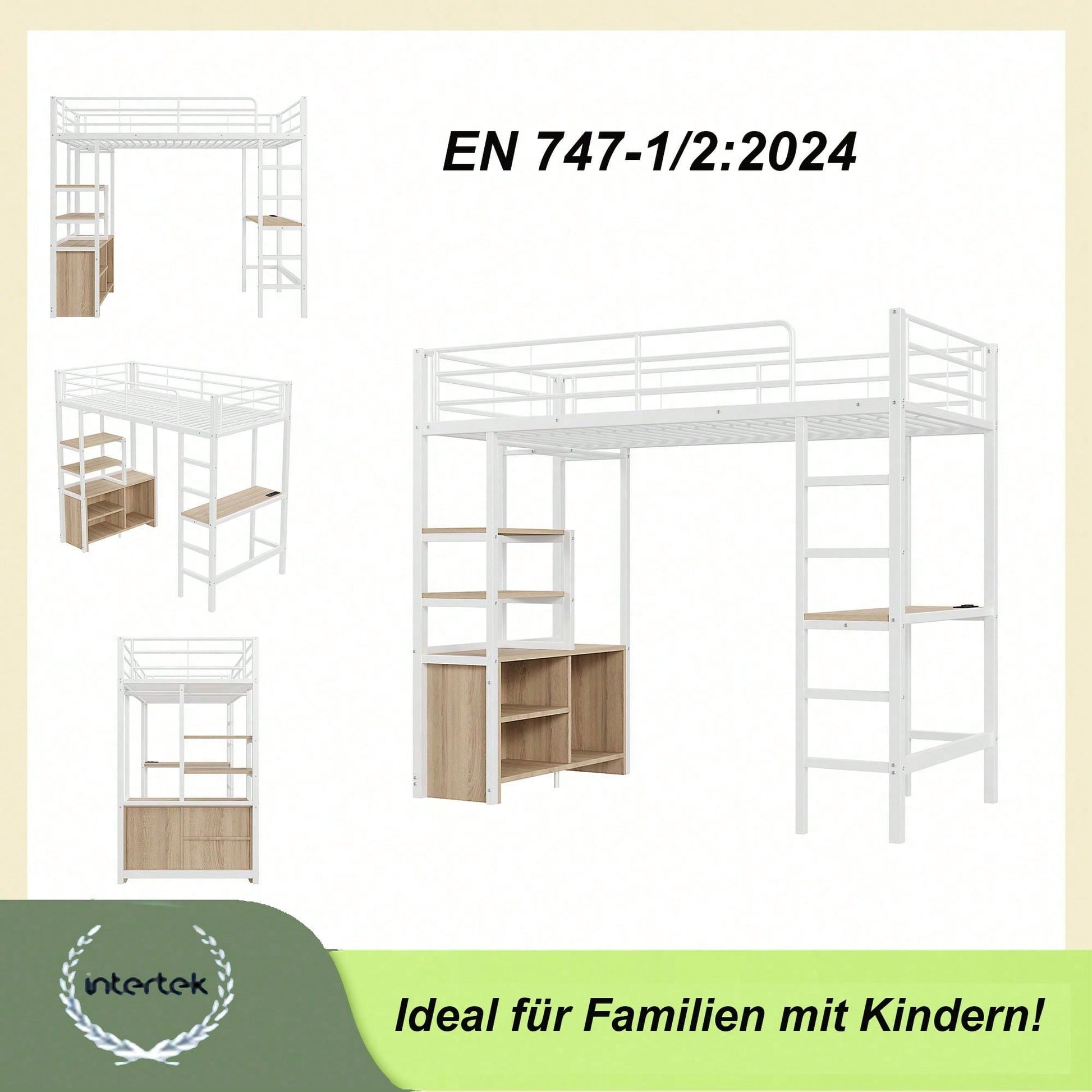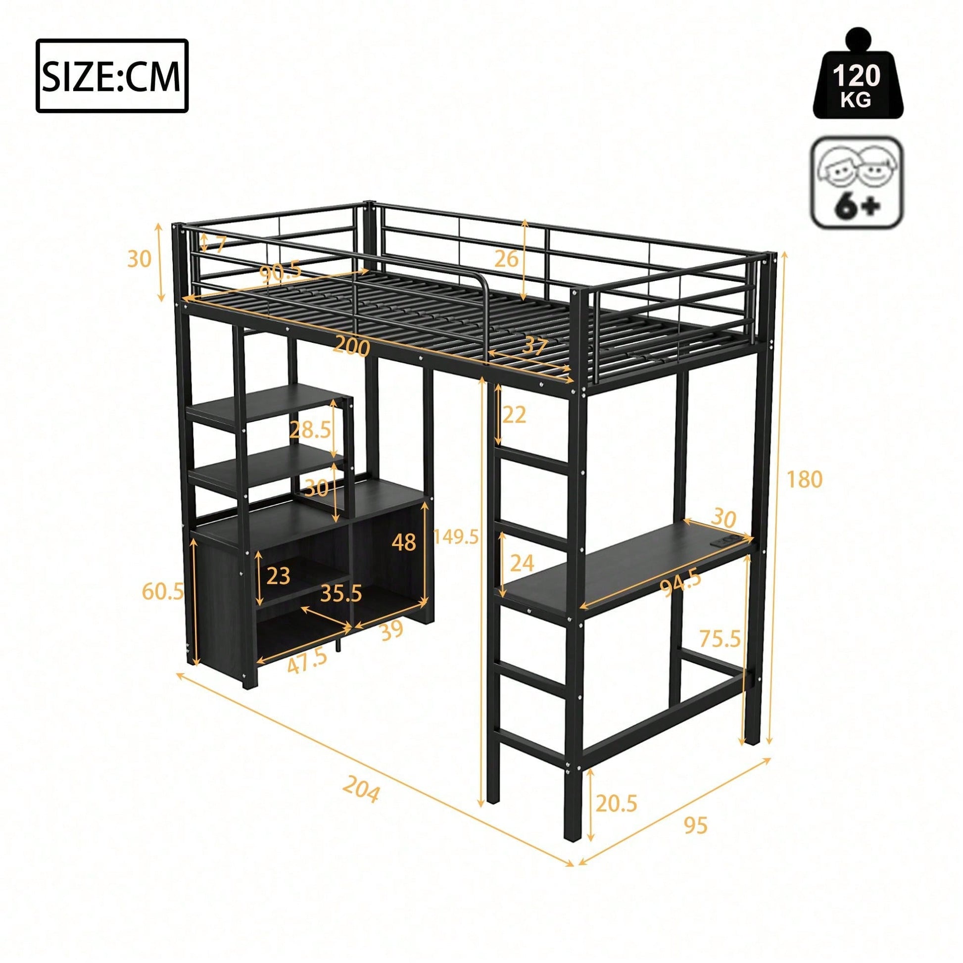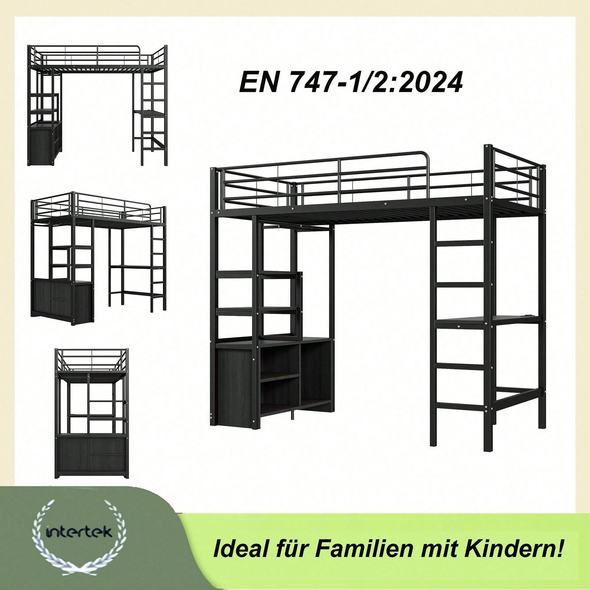 Especificaciones Información del producto Código de artículo: WX000129AAB Tipo de producto: Artículo combinado Nombre del producto: Cama alta, 90 x 200 cm, sin colchón, con escritorio, con toma de corriente y puerto USB, varios estantes, armario abierto, barandilla, escalera, estructura de hierro, color negro Color principal: Negro Material principal: Metal Tamaño de la cama: 90 cm x 200 cm Dimensiones del producto Largo ensamblado (cm): 204.00 Ancho ensamblado (cm): 95.00 Alto ensamblado (cm): 180.00 Peso del producto (kg): 57.50 Tamaño del paquete Subartículo 1: N636P187570B Cantidad del paquete: 1 104.5 x 48.01 x 22 cm 28.7 kg Subartículo 2: N636P187568B Cantidad por paquete: 1 198,48 x 38,48 x 11 cm 28,2 kg Características del producto Materiales de alta calidad: Esta cama alta está fabricada con una robusta estructura de hierro y MDF, por lo que no tendrá que preocuparse de que se derrumbe. Los gruesos tubos de acero la hacen más estable, y el MDF es resistente y duradero para un uso prolongado. Funcionalidad: Nuestras camas altas están equipadas con escritorio, toma de corriente y puerto USB para trabajar o estudiar. : Esta cama alta cuenta con la certificación EN747 y es apta para niños a partir de seis años. Una robusta barandilla alrededor de la litera superior evita caídas accidentales y garantiza un sueño reparador. Gran capacidad de almacenamiento: Esta cama alta está equipada con estantes y armarios abiertos para facilitar el almacenamiento y la organización, optimizando al máximo el espacio. La cama se envía en dos paquetes desde Alemania. A veces los paquetes llegan en momentos diferentes, pero para garantizar que se cumplan sus expectativas, tenga paciencia o comuníquese con nuestro amable servicio de atención al cliente.