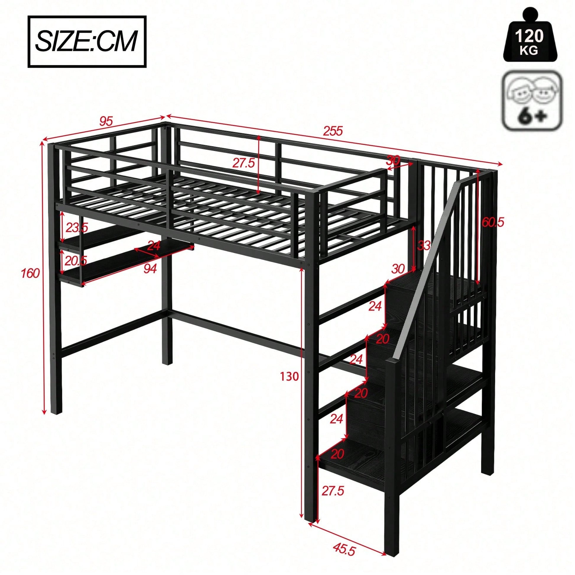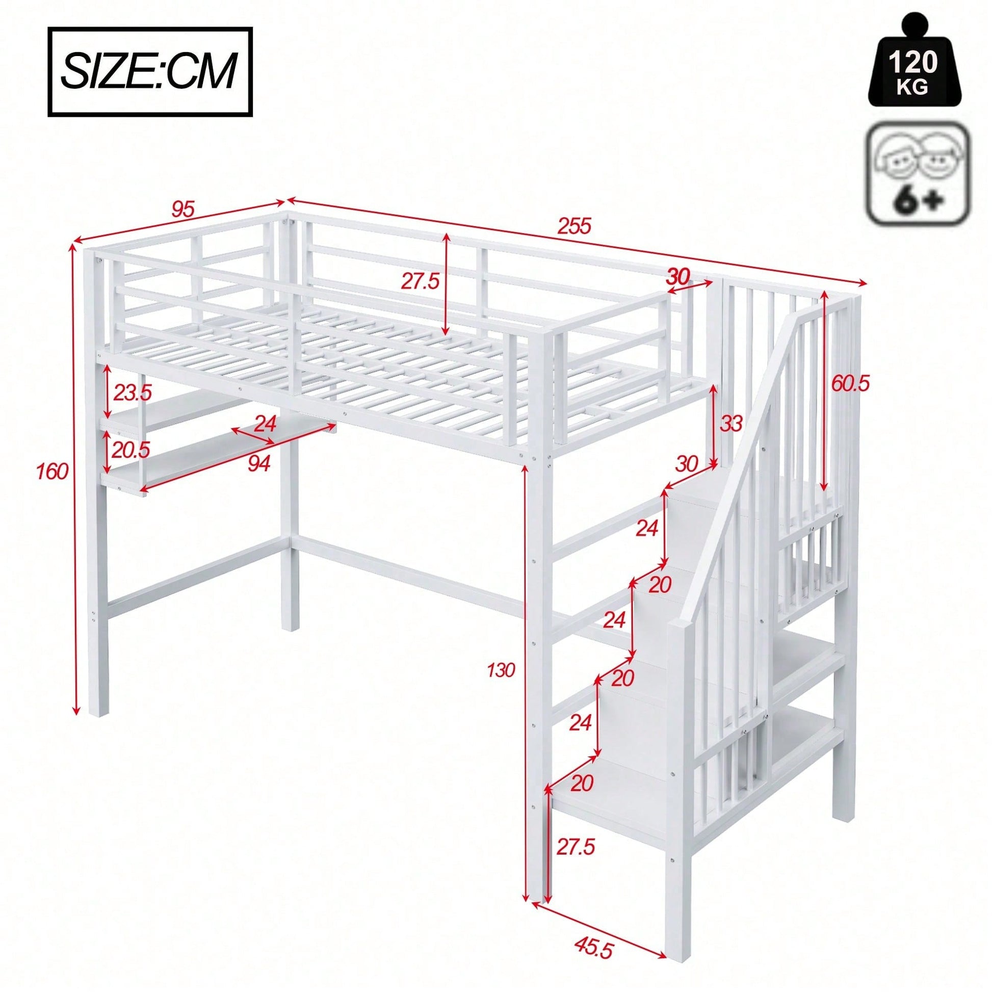 Especificaciones Información del producto Código del artículo: WX000596AAK Tipo de producto: Artículo combinado Nombre del producto: Cama alta, 90 x 200 cm, estantes, escalera de almacenamiento, espacio debajo de la cama para cubrir, barandilla, sin colchón, blanco Color principal: Blanco Material principal: Metal Tamaño de la cama: 90 cm x 200 cm Dimensiones del producto Largo ensamblado (cm): 255.00 Ancho ensamblado (cm): 95.00 Alto ensamblado (cm): 160.00 Peso del producto (kg): 61.00 Tamaño del paquete Subartículo 1: N636P243753K Cantidad del paquete: 1 105.71 * 57.71 * 10.8 cm 19.26 kg Subartículo 2: N636P243752K Cantidad por paquete: 1 118,16 x 55,55 x 20,8 cm 27,3 kg Subartículo 3: N636P243750K Cantidad por paquete: 1 197 x 36,02 x 8,56 cm 19,46 kg Características del producto Estructura de hierro resistente, resistente y económica: La estructura de hierro de alta calidad y el material MDF crean una base de mueble con excelente capacidad de carga, estable, duradera y económica. Diseño de estantes multifuncionales, almacenamiento bien organizado: Equipado con múltiples estantes prácticos, es fácil clasificar y guardar juguetes y libros, manteniendo el mundo de tu hijo bien organizado. Almacenamiento creativo en escalera, una mejora mágica del espacio: El diseño de escalera con función de almacenamiento inteligentemente integrada maximiza cada centímetro de espacio, siendo práctico y atractivo. Un mundo creativo bajo la cama inspira una imaginación ilimitada: El espacio bajo la cama es abierto y libre, permitiendo que los niños jueguen con creatividad, creando su propio mundo exclusivo y fomentando una creatividad sin límites. Barandillas adaptadas a los niños, que protegen cada momento: Las barandillas íntimas están diseñadas específicamente para niños, protegiendo cuidadosamente a los bebés mientras juegan, brindando mayor tranquilidad a los padres.