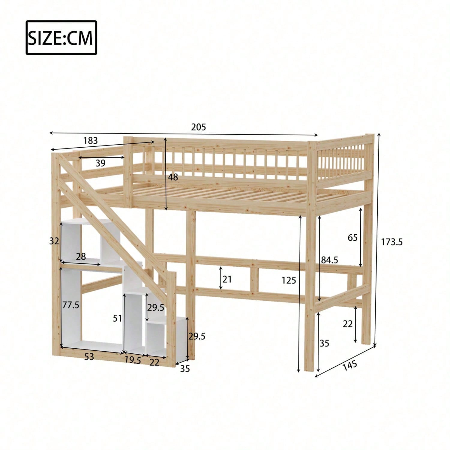 Especificaciones Información del producto Código del artículo: LDB00165AAN Tipo de producto: Artículo combinado Nombre del producto: Cama de madera maciza de 140 x 200 cm, con escalera y armario, barandilla alta, cama infantil, cama juvenil, estructura de madera maciza, color madera Lugar de origen: China Color principal: Natural Materiales principales: Madera Tamaño de la cama: 140 x 200 cm Dimensiones del producto Largo ensamblado (cm): 205,00 Ancho ensamblado (cm): 183,00 Altura ensamblada (cm): 173,50 Peso del producto (kg): 56,50 Tamaño del paquete Subartículo 1: N623P202816N Cantidad del paquete: 1 123,83 x 42,55 x 13,34 cm, 20 kg Subartículo 2: N623P202815N Paquete. Cantidad por paquete: 1 149 * 37,49 * 16,99 cm 22 kg Subartículo 3: N623P202814N Cantidad por paquete: 1 198,12 * 26,04 * 15,88 cm 22,55 kg Características del producto Construcción duradera: Fabricada con madera maciza de alta calidad para garantizar una larga vida útil. El compartimento alto proporciona un entorno de descanso y cómodo para niños y adolescentes. Escalera de almacenamiento: La innovadora escalera con armarios integrados es perfecta para guardar juguetes, libros y ropa. Cada escalón está diseñado como un armario de almacenamiento, ofreciendo amplio espacio para juguetes, libros, ropa y otros artículos esenciales, manteniéndolos organizados y fácilmente accesibles. Diseño compacto: El almacenamiento integrado maximiza el espacio, lo que la hace ideal para habitaciones pequeñas o áreas comunes. Se puede colocar un sofá/escritorio debajo de la cama para maximizar las necesidades de los niños, ya sea como un rincón de juegos para ellos o como un elegante refugio para los adolescentes. Fácil de organizar: Su amplio espacio de almacenamiento ayuda a mantener la habitación más organizada y de fácil acceso. Ideal para niños y adolescentes, es una opción elegante y práctica para cualquier dormitorio. Acabado elegante: Su impecable superficie en color madera añade un toque de elegancia a la cama y complementa la decoración de cualquier dormitorio.