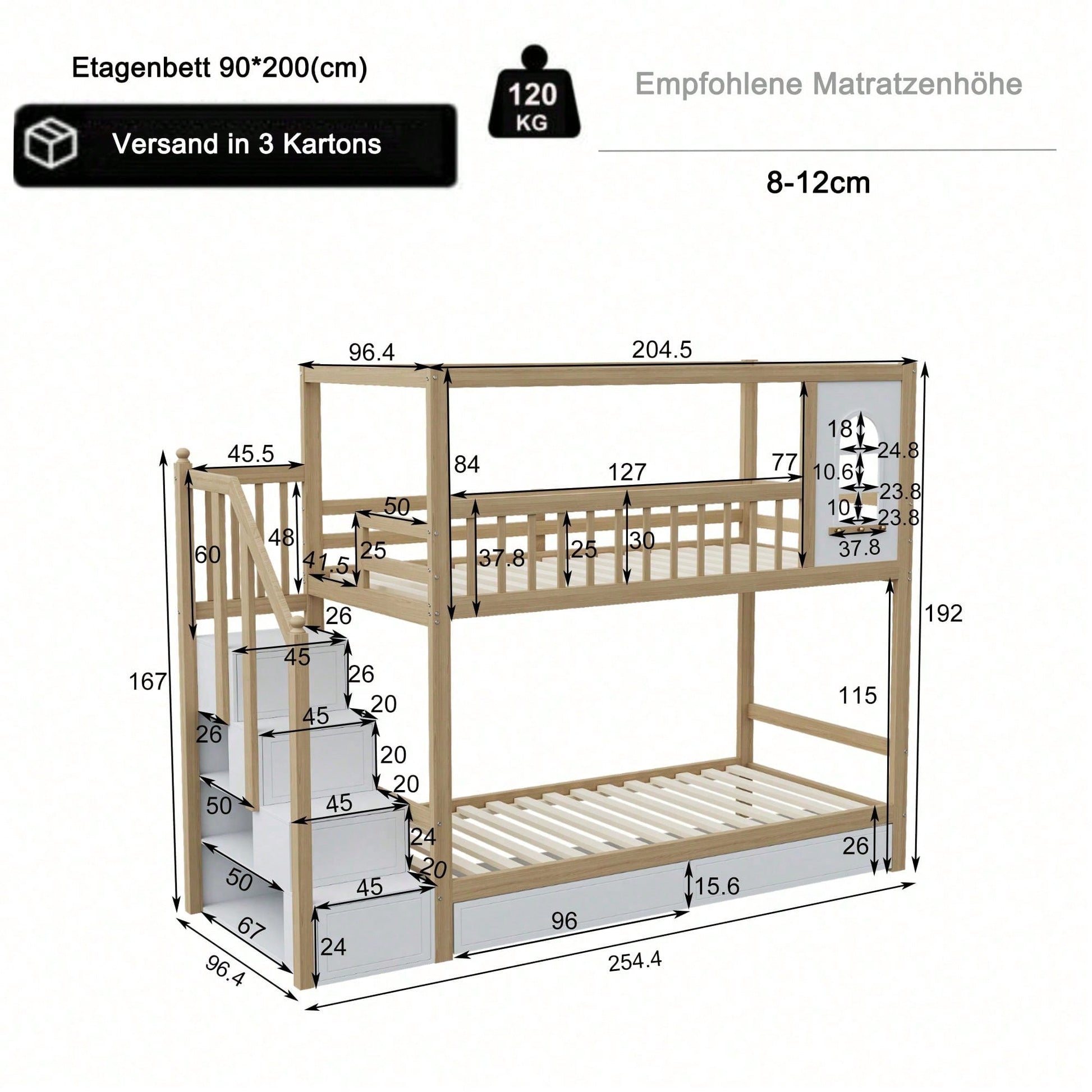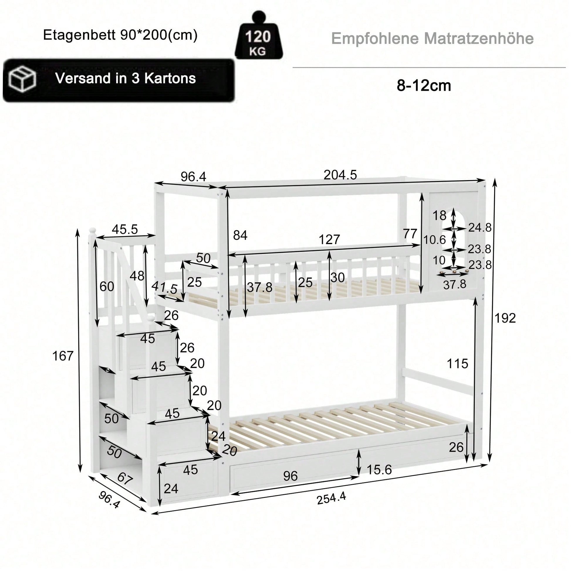 Información del producto Código del artículo: LDB00242AAK Tipo de producto: Artículo combinado Nombre del producto: Litera de 90 x 200 cm, cama doble de madera maciza, forma de casa con ventanas, diseño de valla de , cajones y escalera de , cama para niño y niña, cama para adolescentes, color blanco Origen: China Color principal: Blanco Material principal: Madera Tamaño de la cama: 90 x 200 cm Personalización: Sí * Este producto ofrece servicio de personalización. Para más información, contacte con el vendedor. Dimensiones del producto Longitud ensamblada (cm): 254.40 Ancho ensamblado (cm): 96.40 Altura ensamblada (cm): 192.00 Peso del producto (kg): 82.00 Tamaño del paquete Subartículo 1: N623P195404K Cantidad del paquete: 1 198 * 27 * 19.5 cm 29 kg Subartículo 2: N623P195405K Cantidad del paquete: 1 100.5 * 36.5 * 24 cm 29.5 kg Subartículo 3: N623P195408K Cantidad del paquete: 1 106 * 51.5 * 17 cm 29.5 kg Características del producto Litera de estilo único: esta litera de madera maciza tiene un estilo único y rústico. Elemento de ventana apto para niños que crea un toque divertido. También cuenta con ganchos debajo de la ventana para colgar utensilios y artículos decorativos. Escalera de con cajón de almacenamiento: esta litera cuenta con una escalera de lateral que facilita la entrada y salida de su hijo. Además, cada escalón cuenta con un cajón oculto para organizar juguetes, libros y ropa. Amplio espacio de almacenamiento y organización: esta cama doble cuenta con dos cajones debajo de la cama, y cada escalón de la escalera de lateral cuenta con un cajón, lo que proporciona un amplio espacio de almacenamiento para que su hijo organice cómodamente juguetes, libros y otros artículos. Diseño de valla de : esta cuna doble está equipada con barandillas de para brindarle a su hijo un lugar cómodo y relajante para dormir. Resistente y duradera: esta litera está hecha de madera maciza de alta calidad para una construcción estable y duradera. Las literas superior e inferior están equipadas con somieres que sostienen firmemente toda la cama, con una capacidad de carga de hasta 120 kg. La cama se adapta al crecimiento de tu hijo, lo que garantiza una larga vida útil y un uso prolongado. Sus dimensiones totales son 254,4 x 96,4 x 192 cm.