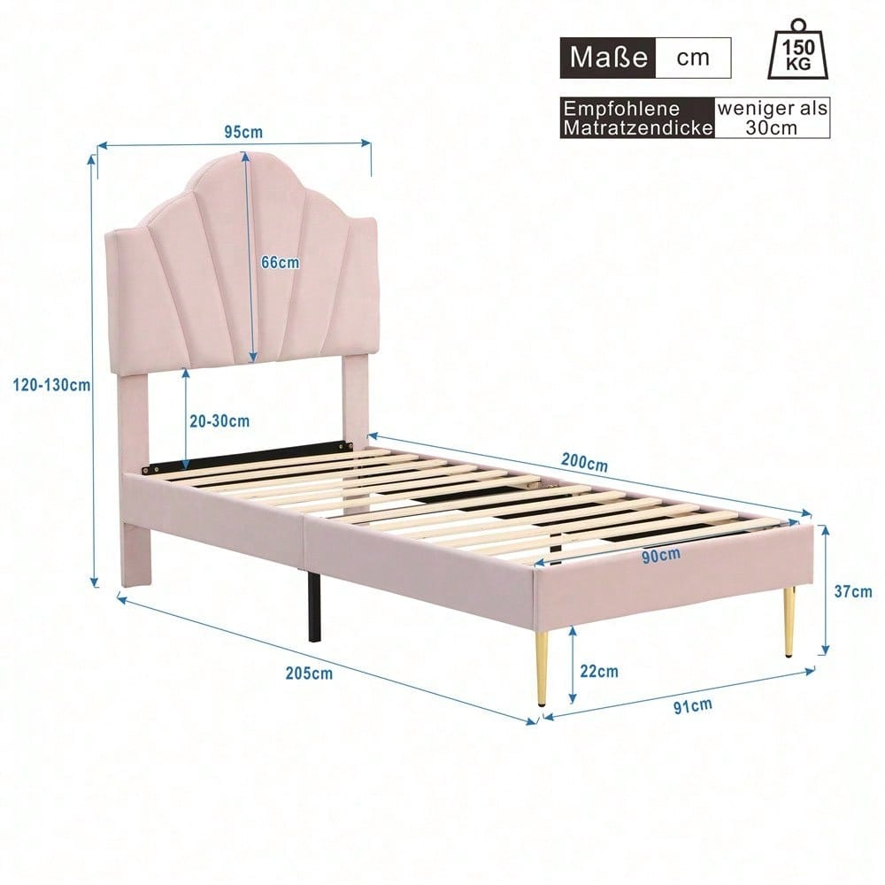 Design elegante: questo letto presenta un design elegante, con la testiera caratterizzata da un elegante contorno a conchiglia abbinato a gambe in ferro dorato, che rendono il design complessivo ancora più unico ed elegante. Questo design non è solo bello, ma anche ricco di arte, aggiungendo un'atmosfera sofisticata alla vostra camera da letto. Il suo aspetto unico e i dettagli raffinati lo rendono il punto focale della camera da letto. Tessuto in velluto: la superficie del letto è realizzata in morbido velluto, confortevole al tatto e offre un'esperienza di sonno ottimale. Allo stesso tempo, il velluto aggiunge una sensazione di lusso alla superficie del letto. Testiera regolabile: l'interno della testiera è imbottito con schiuma ad alta densità per offrire un supporto confortevole. Inoltre, l'altezza della testiera può essere regolata in due posizioni per soddisfare le esigenze di persone diverse ed è adatta a diverse altezze di materasso, offrendo una varietà di opzioni per una posizione di sonno più confortevole. Stabile e durevole: la parte inferiore del letto è dotata di una rete a doghe in robusto legno massello e metallo con robuste staffe metalliche a croce per garantire stabilità e durata del letto. Lo spazio di 22 cm sotto il letto offre ulteriore spazio contenitivo e mantiene la camera da letto più organizzata. Facile da montare: Questo letto imbottito presenta un design semplice da montare e viene fornito con istruzioni di montaggio dettagliate, così anche chi non ha esperienza di montaggio può montarlo facilmente, risparmiando tempo ed energia. Descrizione Dettagli del prodotto Nota: Dimensioni: Tutte le dimensioni sono approssimative. Dimensioni complessive: 95 x 205 x 120/130 (L x P x A) Materasso applicabile (materasso non incluso): 90 x 200 cm Peso del prodotto: 40,5 kg Numero di reti a doghe: 12 Materiale: Velluto Capacità di carico: 150 kg Spessore del materasso: 20-30 cm Montaggio richiesto: 25 minuti Contenuto della confezione: Struttura del letto, viti e utensili necessari, istruzioni di montaggio Materasso incluso: No Numero di confezioni: 2 Montaggio richiesto: Sì