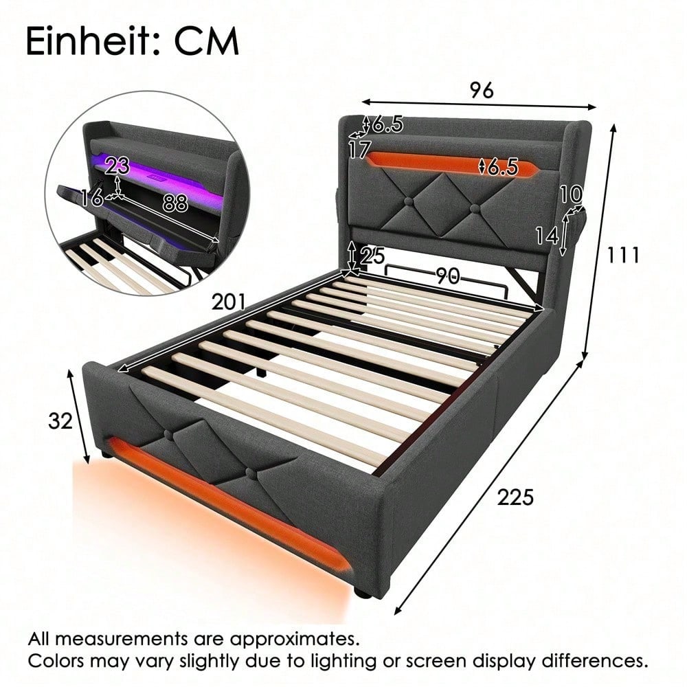 Specifiche Informazioni sul prodotto Codice articolo: ABMA534243G Tipo di prodotto: Articolo combinato Nome prodotto: Letto singolo imbottito 90 x 200 cm, testiera contenitore con porta USB e Type-C, funzione LED surround a 360° su testa e piedi, letti con contenitore idraulico, grigio, lino (con materasso) Colore principale: Grigio Materiale principale: Lino Dimensioni letto: 90 cm x 200 cm Dimensioni prodotto Lunghezza da montato (cm): 225,00 Larghezza da montato (cm): 96,00 Altezza da montato (cm): 111,00 Peso prodotto (kg): 42,60 Dimensioni confezione Articolo secondario 1: N616P265343G Quantità confezione: 1 140,97 * 47,63 * 12,07 cm 28,5 kg Articolo secondario Articolo 2: N616P265342G Quantità per confezione: 1 106,68 * 45,09 * 16,76 cm 19,1 kg Articolo secondario 3: WF280397AAA Quantità per confezione: 1 95 * 32 * 32 cm 21,42 kg Caratteristiche del prodotto Il materasso è dotato di 406 molle ed è composto da due strati di schiuma che non sono solo morbidi, ma anche sostenitivi e confortevoli. Utilizziamo tessuti atossici testati secondo lo standard Oeko-Tex 100, sicuri e anallergici! [ILLUMINAZIONE LED INNOVATIVA] L'innovativa barra luminosa a LED a 360 gradi supporta timer e diverse modalità di luce dinamica. È possibile controllare la barra luminosa tramite un pulsante/app/telecomando per creare uno spettacolo di luci suggestivo con musica e decine di migliaia di colori, creando un'atmosfera di sonno straordinaria. [TESTIERA CON CONTENITORE DI RICARICA IN PRIMO PIANO] La testiera con bottoni non solo garantisce un sonno confortevole e un design accattivante, ma una delle sue caratteristiche più utili è la presa di corrente integrata nella testiera, che consente di caricare telefono e tablet prima di coricarsi. Tre porte USB e una porta di ricarica Type-C si trovano nella testiera, una delle quali è una porta di ricarica rapida. [SPAZIO PORTAOGGETTI MULTI-LIVELLO] Ripiani comodino per oggetti di uso quotidiano, cellulari o tablet, con vano portaoggetti aperto nella testiera; due tasche laterali sul lato del letto per oggetti a portata di mano; e vano portaoggetti idraulico sotto il letto, con coulisse per un facile accesso. [COSTRUZIONE SOLIDA] Il telaio principale è realizzato in ferro per garantire la stabilità del letto e una capacità di carico di 150 kg. I punti di contatto del telaio sono dotati di inserti silenziosi in EVA per ridurre il rumore e il letto è dotato di una striscia di fermo sulla testiera per evitare che il materasso scivoli facilmente, offrendo ai clienti un'esperienza di sonno confortevole. [Nota] Questo prodotto è disponibile in quattro misure (90*200/140*200/160*200/180*200) e due colori (beige e grigio) per soddisfare le esigenze di diversi utenti. I componenti sono chiaramente etichettati e possono essere assemblati rapidamente. Per ridurre il rischio di danni, questa struttura del letto viene spedita in tre scatole e potrebbe arrivare in giorni diversi. Se il pacco arriva ma mancano dei componenti, si prega di contattare il servizio clienti.