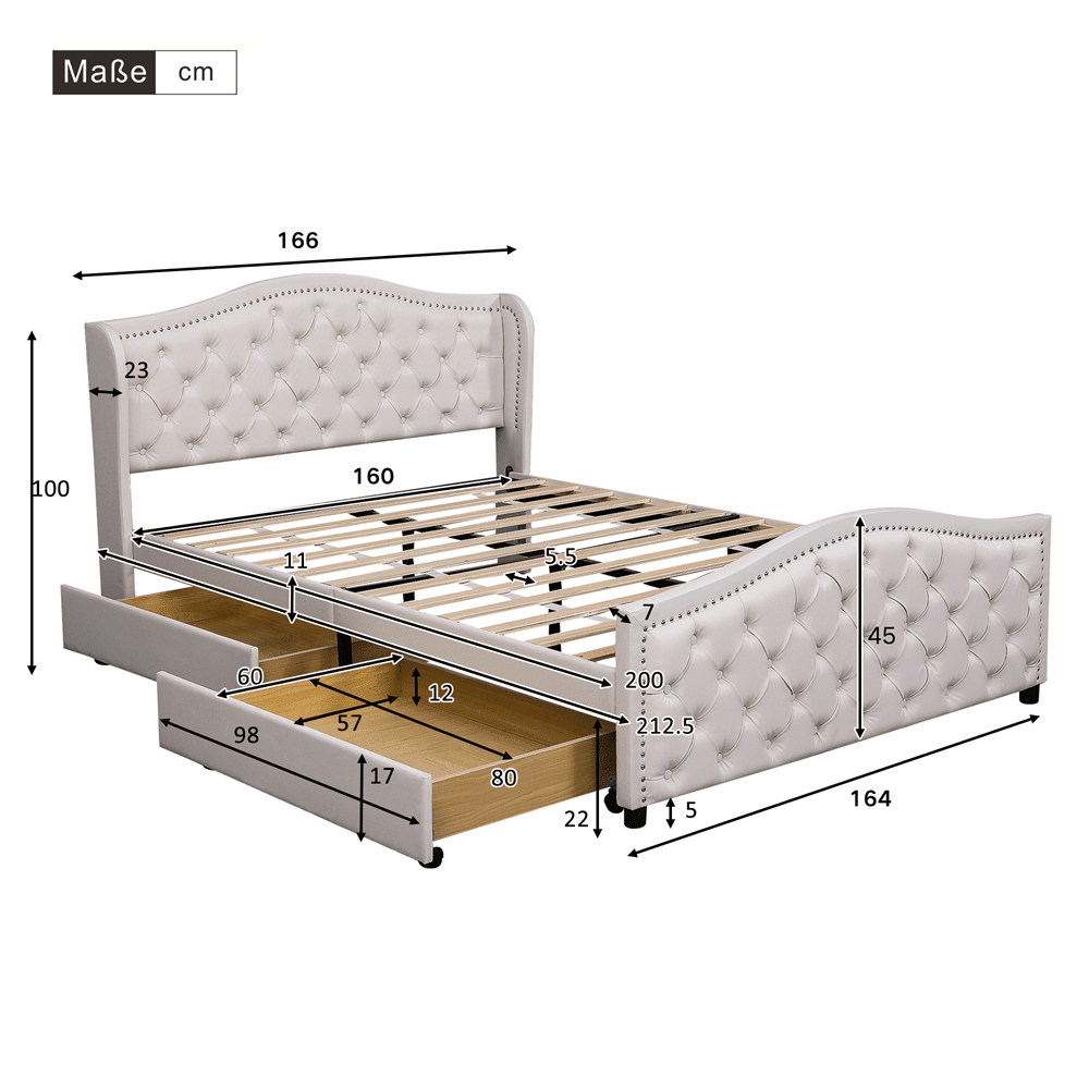 Design elegante: Progettato in stile Chesterfield, il look è elegante e sobrio. La testiera più alta (100 cm) offre un supporto più stabile e confortevole per testa e schiena. Il letto imbottito è realizzato in velluto, morbido e piacevole al tatto, per un'esperienza di sonno perfetta. Il colore bianco rende il letto morbido più resistente alle macchie, coniugando praticità ed estetica, e l'atmosfera di lusso complessiva non risulta noiosa. Aspetto raffinato: Un letto finemente imbottito dall'aspetto straordinario, con testiera alta con esclusiva trapuntatura a rombi e grandi bottoni, un pannello laterale a forma di orecchio su entrambi i lati della testiera e un anello di rivetti argentati lungo il bordo del pannello laterale. Questo design unico e sofisticato e le finiture di alta qualità permettono al letto imbottito di combinare stili moderni e classici per dare alla vostra camera da letto un look completamente nuovo. Ampio spazio contenitivo: I due cassetti su ruote offrono spazio per riporre cuscini, coperte e altri oggetti. I cassetti possono essere posizionati a sinistra o a destra e sono facilmente estraibili su entrambi i lati tramite le rotelle poste sotto il letto matrimoniale. Configurazione Premium: La struttura del letto è realizzata in legno di alta qualità, con telaio in acciaio ed elementi di collegamento. La base è solida e realizzata in pino massello, con supporti centrali in acciaio. Le doghe più spesse offrono un supporto ottimale per il vostro materasso. Il letto imbottito include: struttura del letto, rete a doghe e istruzioni di montaggio (materasso non incluso). Metodo di installazione: Richiede montaggio. Il prodotto consegnato include istruzioni dettagliate e gli strumenti necessari per l'installazione. Si consiglia l'uso di due persone per l'installazione. Il tempo previsto per il completamento è di 1 ora. Questo prodotto contiene due pacchi, che potrebbero non arrivare contemporaneamente; si prega di essere pazienti. Descrizione Specifiche Tipo: Rete a doghe Una rete a doghe è inclusa. Tipo di materasso: Materasso non incluso Dettagli: Spazio contenitivo: Sotto il letto Larghezza del letto: 160 cm Lunghezza del letto: 200 cm Peso: 55,5 kg Larghezza: 166 cm Lunghezza: 212,5 cm Larghezza testiera: 166 cm Altezza testiera: 100 cm Altezza del comodino: 33 cm Spessore della pediera: 7 cm Parte più larga della testiera: 23 cm Nota: Dimensioni: Tutte le dimensioni sono approssimative. Capacità di carico massima: 300 kg Rivestimento: PU Colore: Bianco Condizioni di consegna: Smontato, in 2 colli