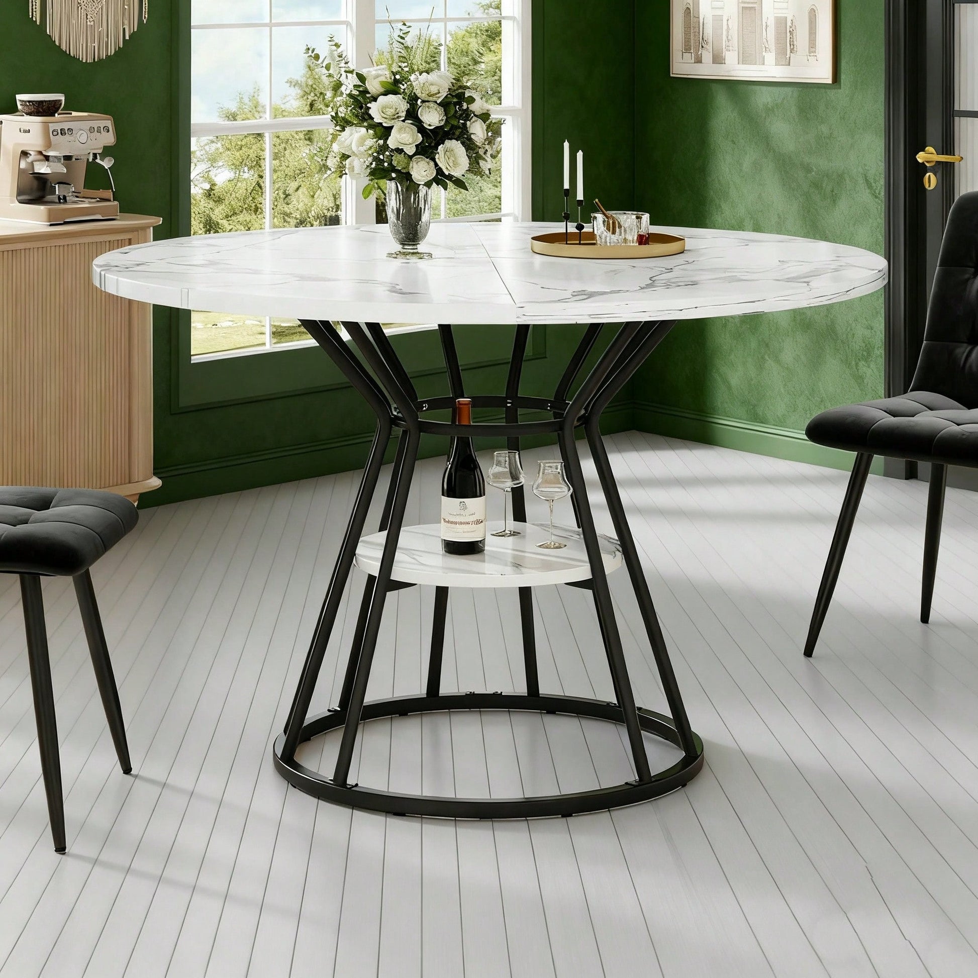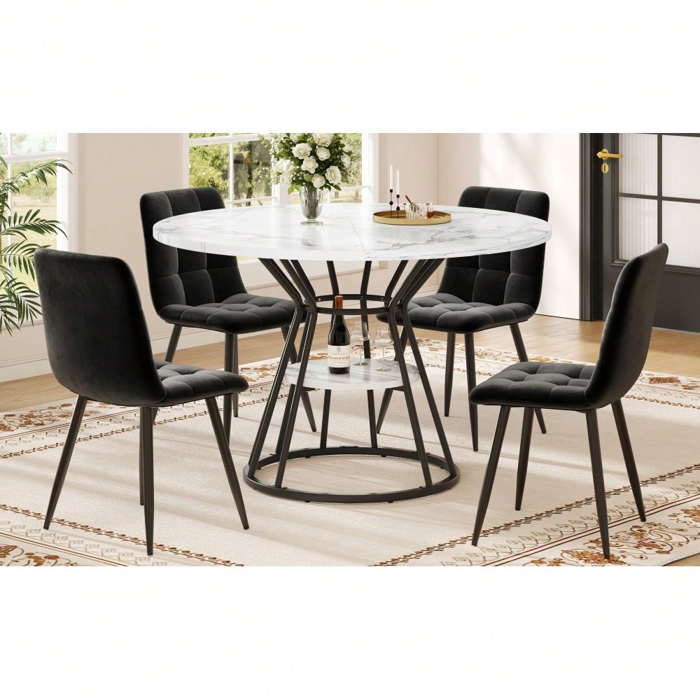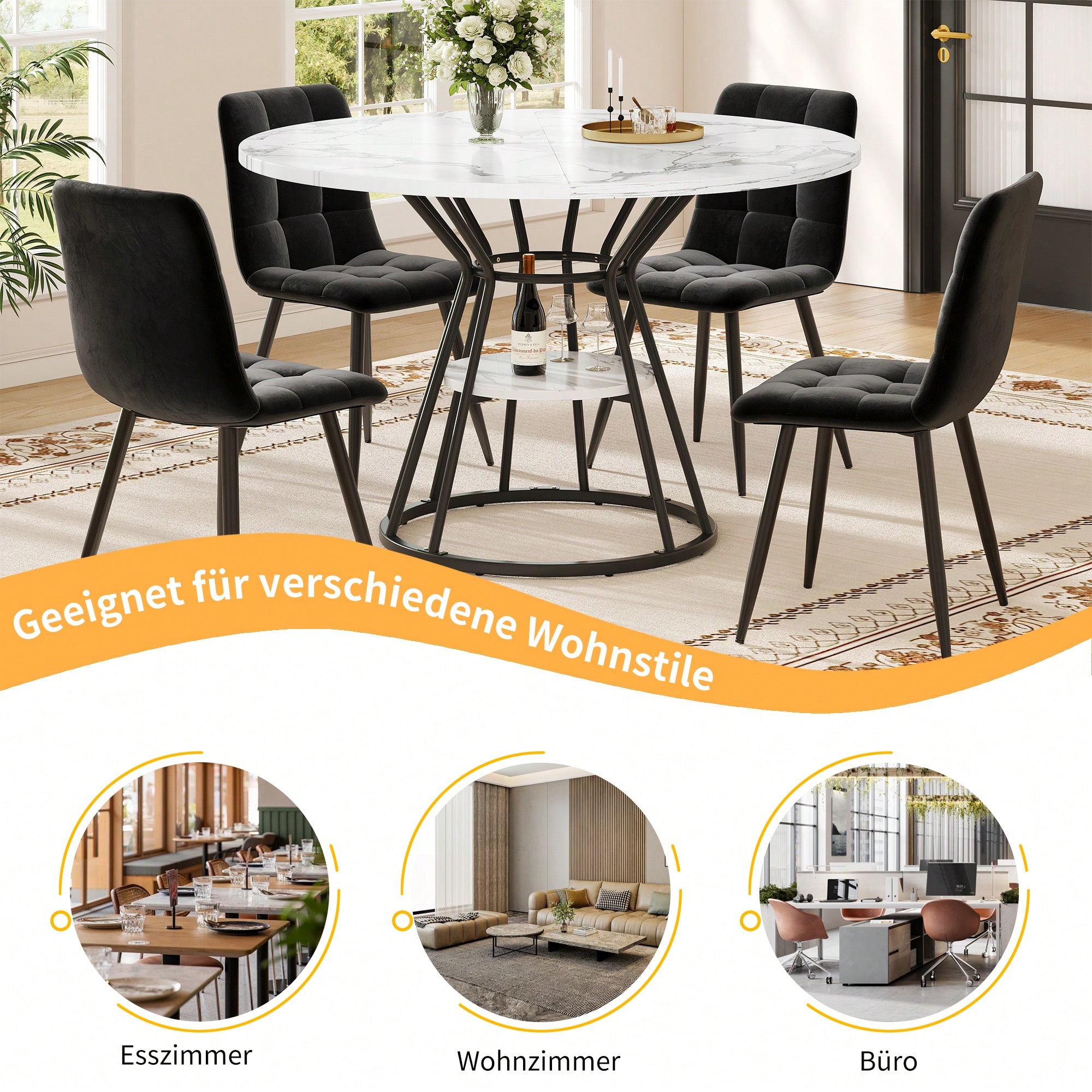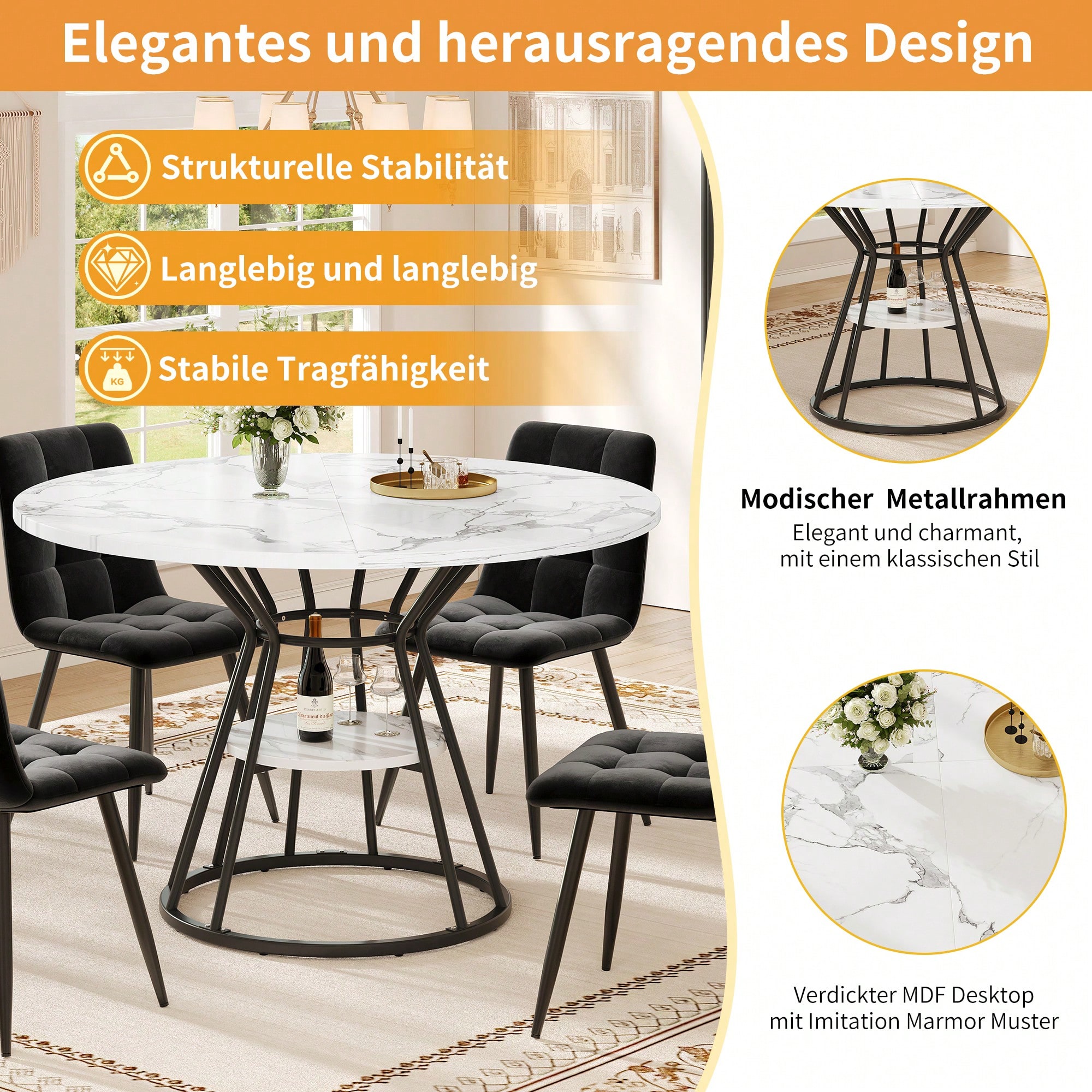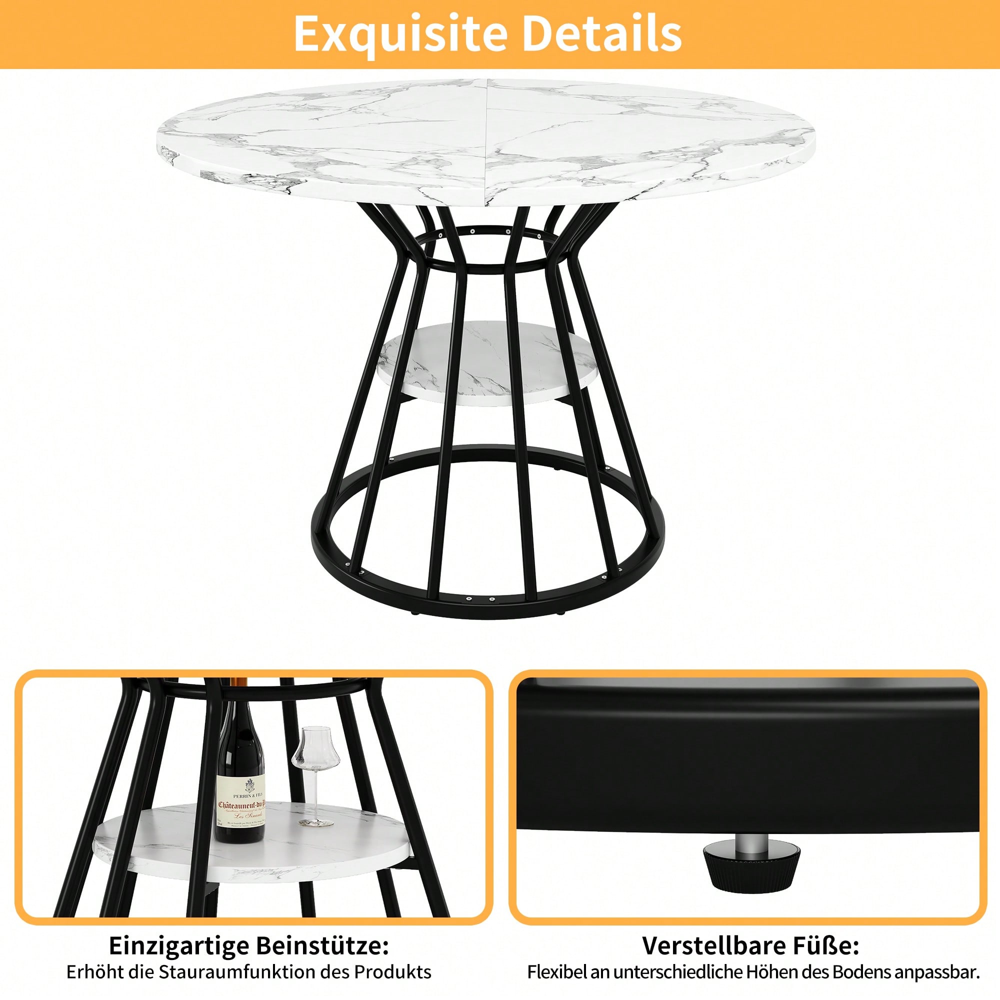 Tischmaße: Tischplatte mit einem Durchmesser von 100 cm, Tischhöhe 76 cm, Tragkraft 40 kg Hochwertige Materialien: Die Tischplatte besteht aus MDF-Platten, die leicht zu reinigen sind, und die Tischbeine aus einem stabilen Metallrahmen, der für Stabilität und Langlebigkeit sorgt. Design: Die Tischplatte mit modernem Marmormuster ist klassisch und stilvoll und eignet sich für verschiedene Umgebungen, wie z. B. Esszimmer, Wohnzimmer, Küche usw. Die großzügige Tischplatte ist ideal für gesellige Momente mit Freunden. Die schlichten und eleganten Metalltischbeine sorgen für Stabilität und Ästhetik und garantieren eine lange Lebensdauer des Tisches. Verstellbare Füße für verschiedene Bodenbeläge: Die Tischbeine sind mit verstellbaren Füßen ausgestattet, die sich an verschiedene Bodenbeläge anpassen lassen und die Stabilität des Tisches gewährleisten. Zusätzlicher Stauraum: In der Mitte der Tischbeine befindet sich eine Ablagefläche, auf der Sie häufig verwendete Küchenutensilien, Gläser usw. bequem verstauen und griffbereit aufbewahren können. Das Design entspricht dem der Tischplatte, ist ästhetisch ansprechend und fügt sich harmonisch in Ihren Einrichtungsstil ein. Produktdetails Produktgröße 100x100x76cm(L x B x H) Produktgewicht 15kg/1 Tischl Material MDF, Metal Tragendes Gewicht 40kg/Tischl Montage erforderlich 10 Minuten Lieferumfang Ein Tisch, Teile zur Montage Anzahl der Pakete 1 Herkunftsland China Elegantes Design und hochwertige Materialien Dieser Esstisch hat ein elegantes und einzigartiges Aussehen und besteht aus hochwertigen Materialien, die perfekt zu Ihrem Wohnstil passen. Die Tischplatte aus MDF mit Marmoroptik und verstärkter Struktur sowie das stabile Metallgestell sehen nicht nur gut aus, sondern garantieren auch die Stabilität und Langlebigkeit des Tisches. In der Mitte der Tischbeine befindet sich eine feste Ablagefläche, die zusätzlichen Stauraum bietet und die Aufbewahrung und Entnahme von Geschirr und Gläsern im Allt Passend für verschiedene Einrichtungsstile Dieser Esstisch passt zu verschiedenen Einrichtungsstilen und fügt sich perfekt in Ihr Esszimmer, Wohnzimmer oder Büro ein, um den Anforderungen unterschiedlicher Räume gerecht zu werden. Sein klassischer Stil und sein elegantes Aussehen machen ihn zu einem Highlight in jeder Wohnumgebung und bieten gleichzeitig eine stabile Benutzererfahrung