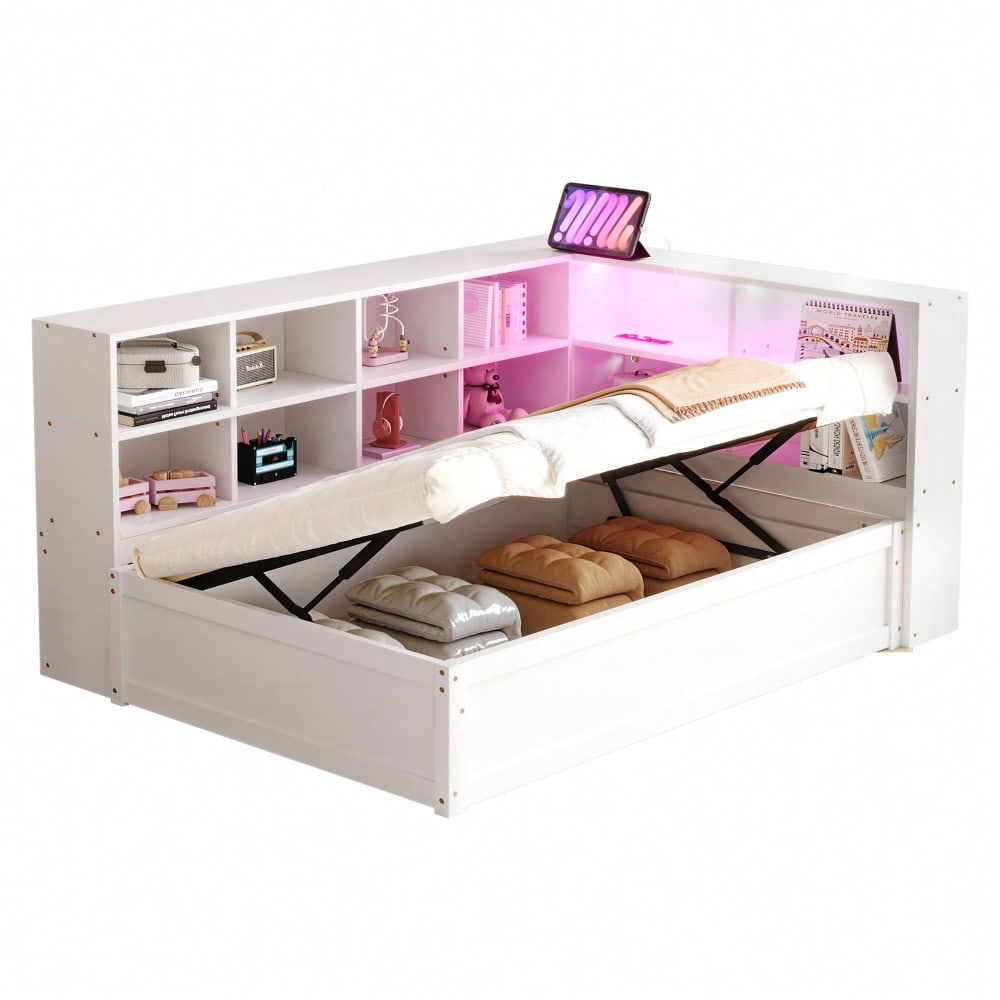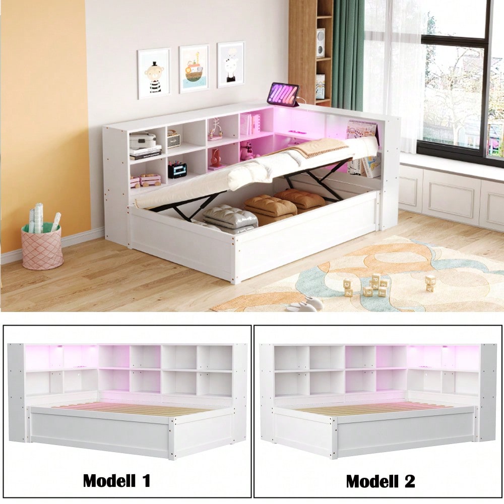 Schlafsofa 90*200, mit Mehrfachsteckdose und mehreren Staufächern, mit Lichtleiste, hydraulisches Bett, Massivholzbett, Einzelbett, multifunktionales Holzbett, Weiß.
