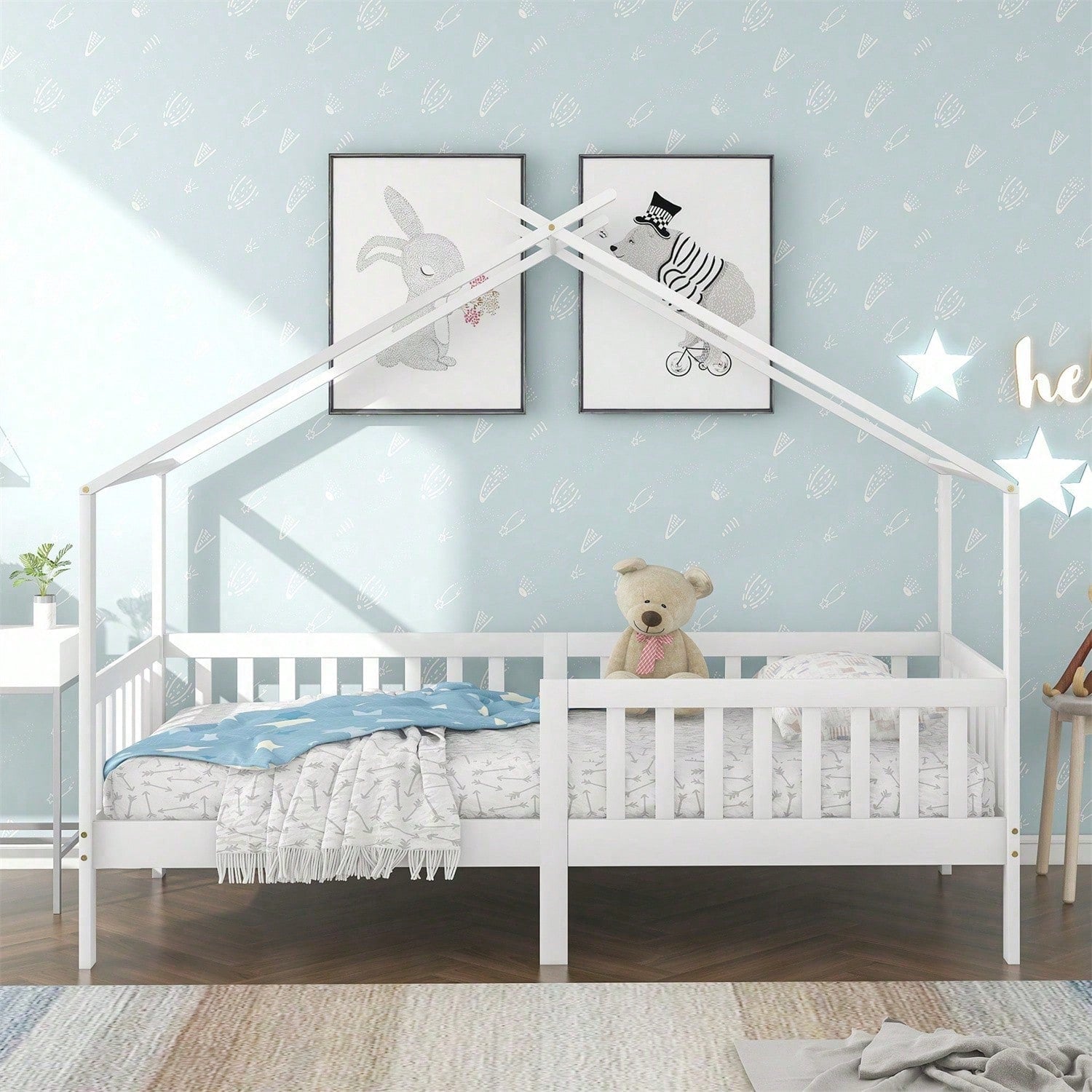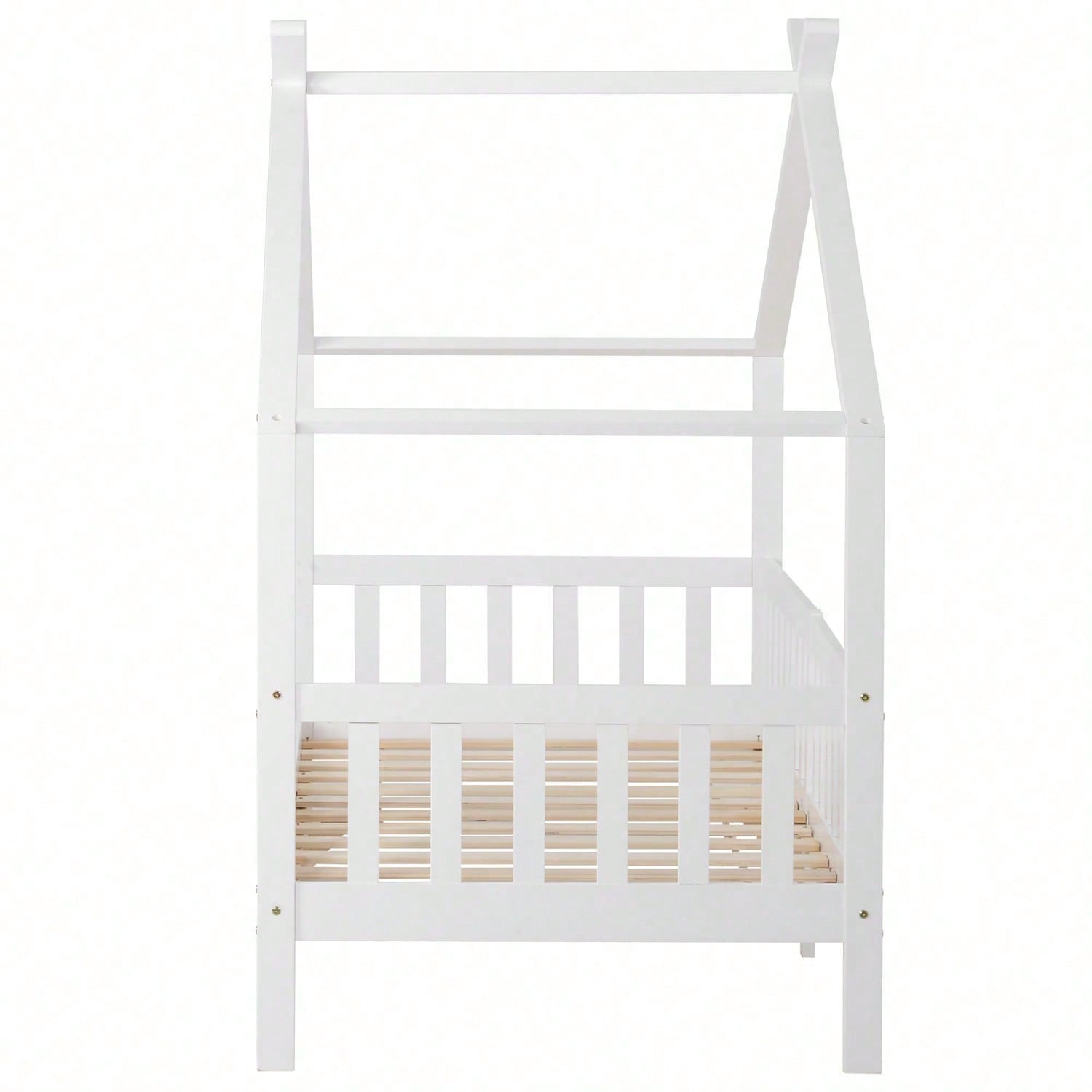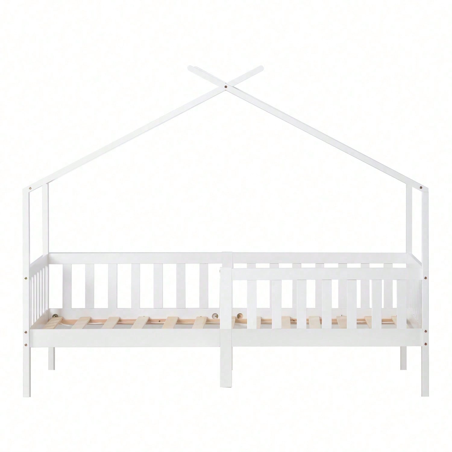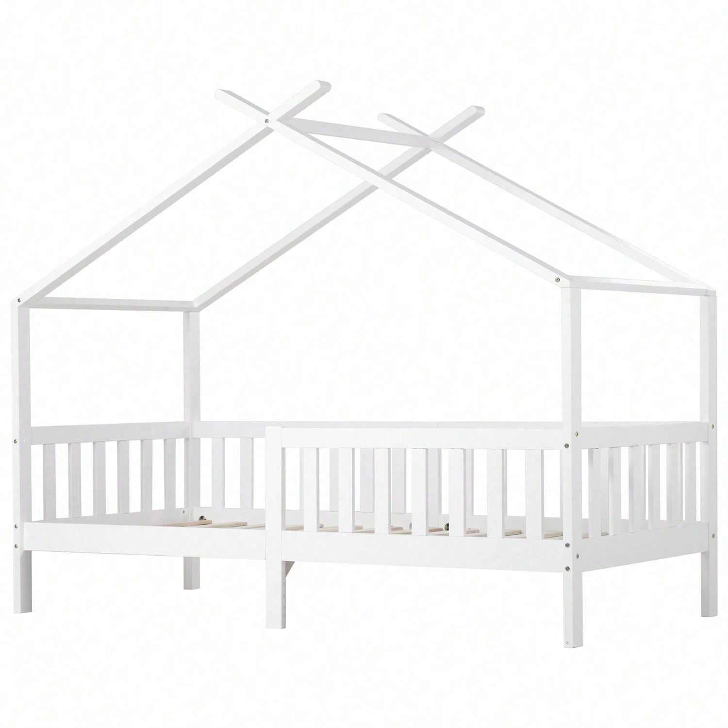 Schönes Hausbett, Kinderbett Massivholz mit Zaun und Lattenrost, Kinder- und Jugendzimmer mit Absturzsicherung, weiß (200x90 cm)