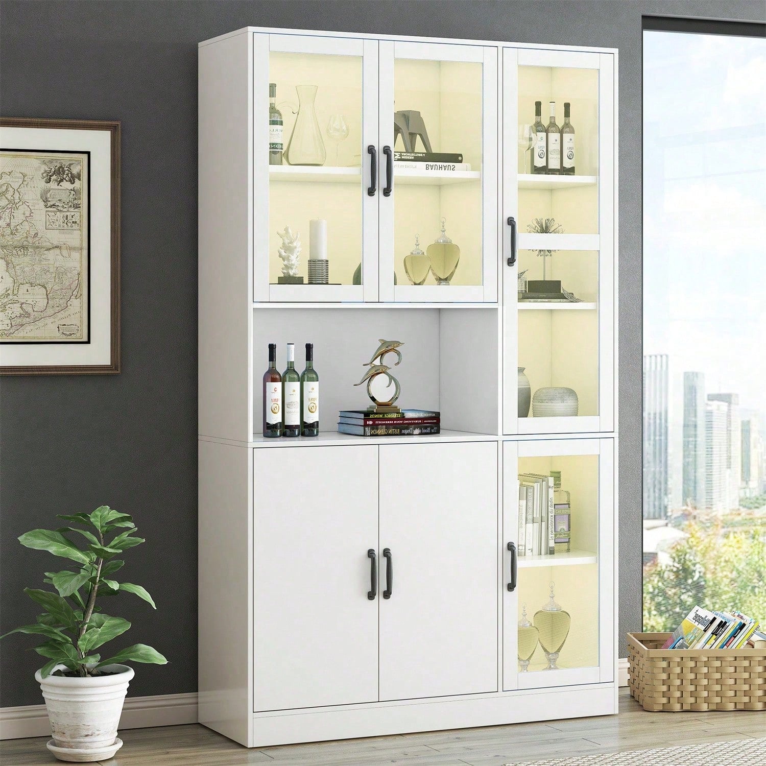Weißer Vitrinenschrank, Bücherregale mit Türen, Standregale für Bücher, große Küchenanrichte, Vorratsschrank, Luxus-Bücherregal mit LED-Licht, Vitrinenschrank mit Regalen für Wohnzimmer, Schlafzimmer