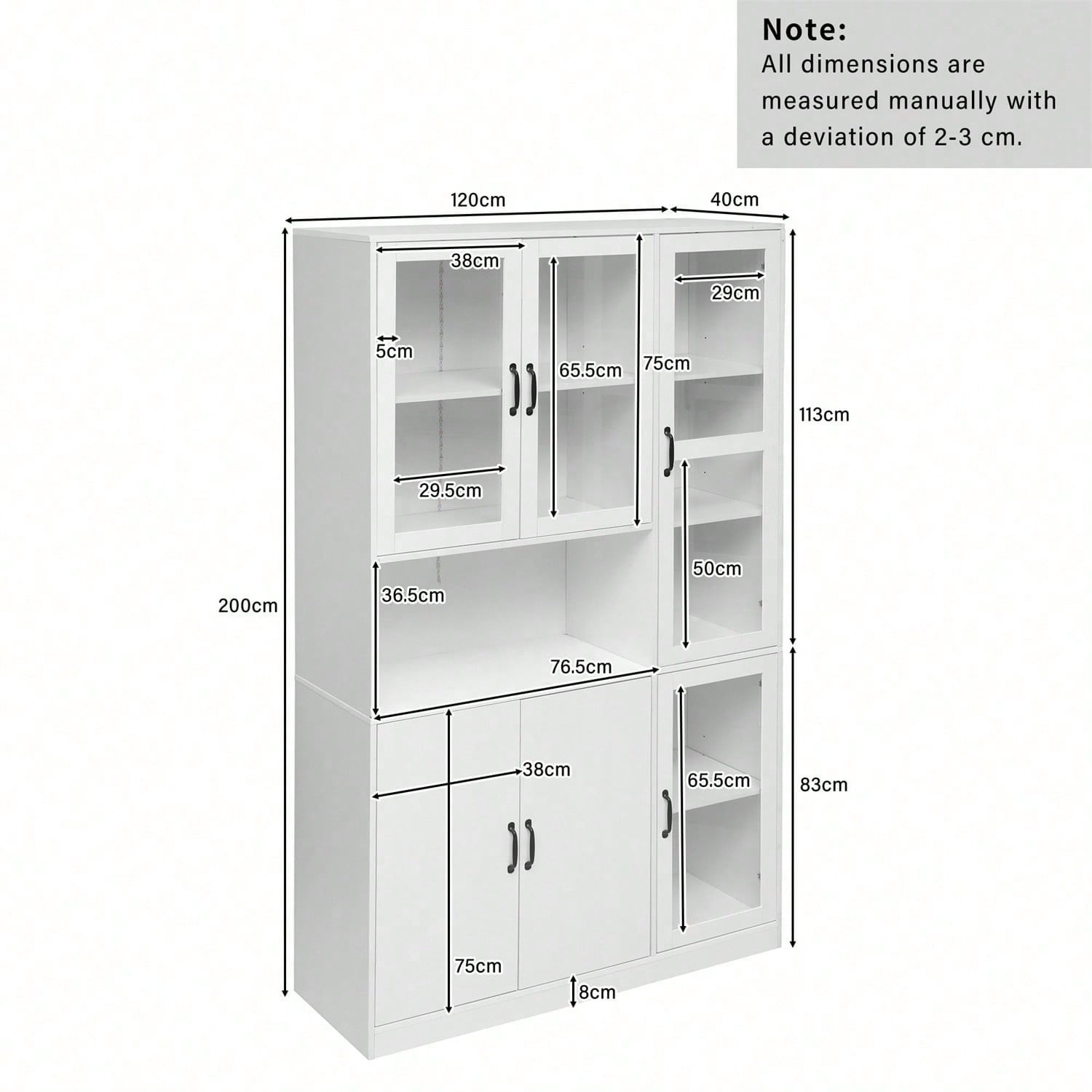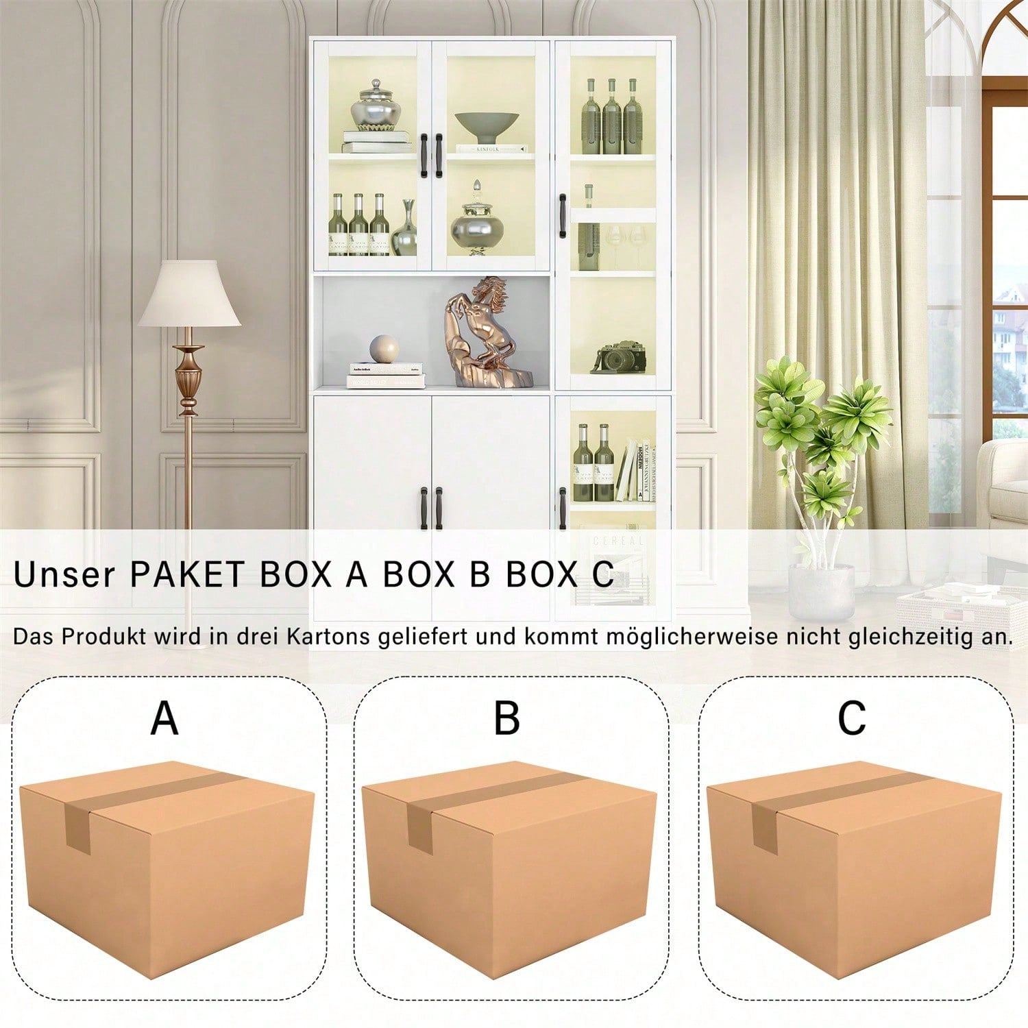 Overall dimensions 120W x 40D x 200H CM Material MDF + Acryl Tragfähigkeit Das Laminat kann 10 kg und die Unterseite 50 kg tragen. Mit LED-Licht JA; 16-Farben-LED-Lichter; USB-Schnittstelle, kein Stecker Anzahl der Pakete Dieses Produkt wird in 3 Paketen geliefert, die von verschiedenen Kurieren verschickt werden und möglicherweise nicht gleichzeitig ankommen. Bitte warten Sie geduldig etwa 7–10 Werktage und beginnen Sie mit der Montage, nachdem Sie den Erhalt von 3 Paketen bestätigt haben. Wenn Sie etwas dagegen haben, kaufen Sie bitte mit Vorsicht. Feature 4 Acryltüren, 2 Holztüren; ein offener Bereich; 4 verstellbare Einlegeböden.