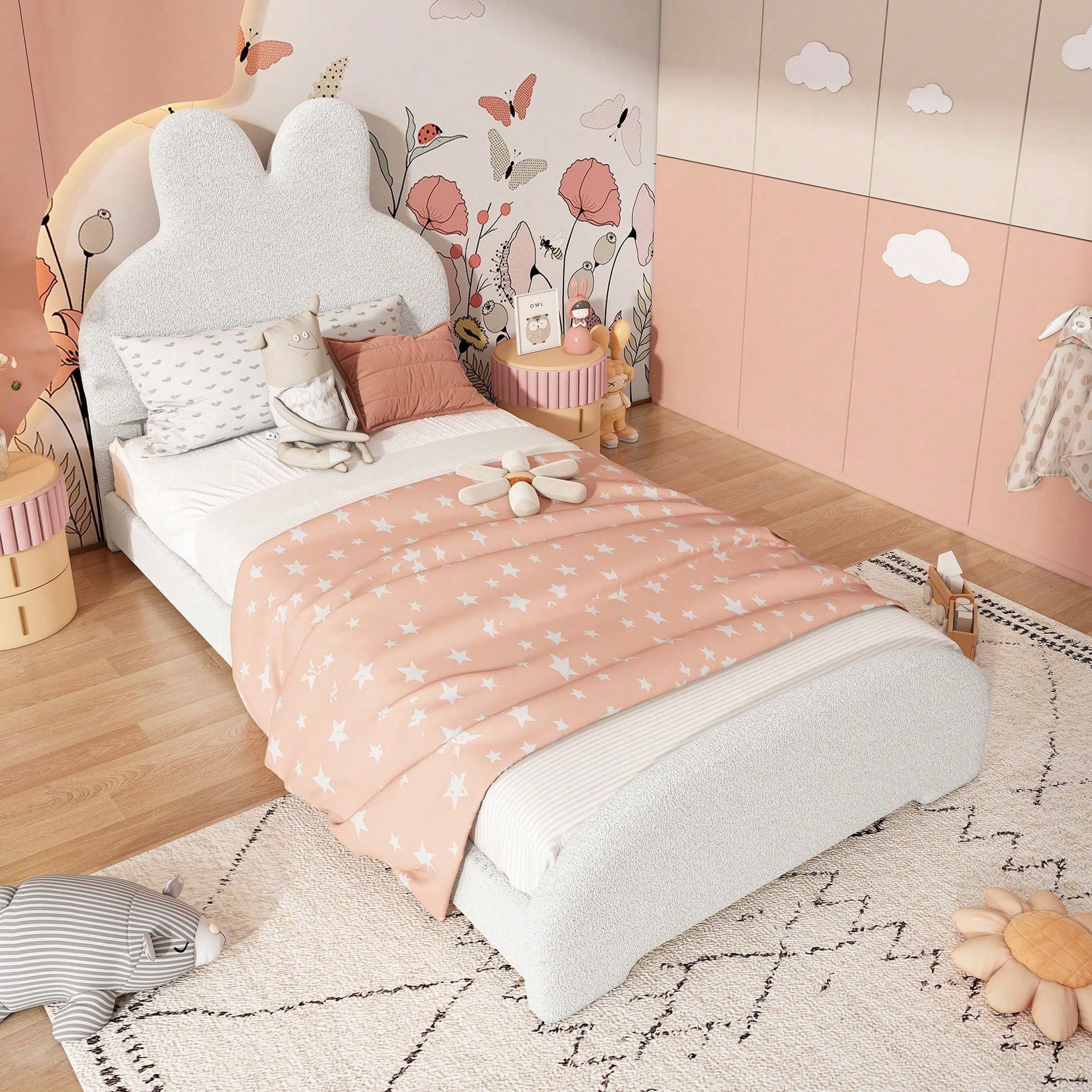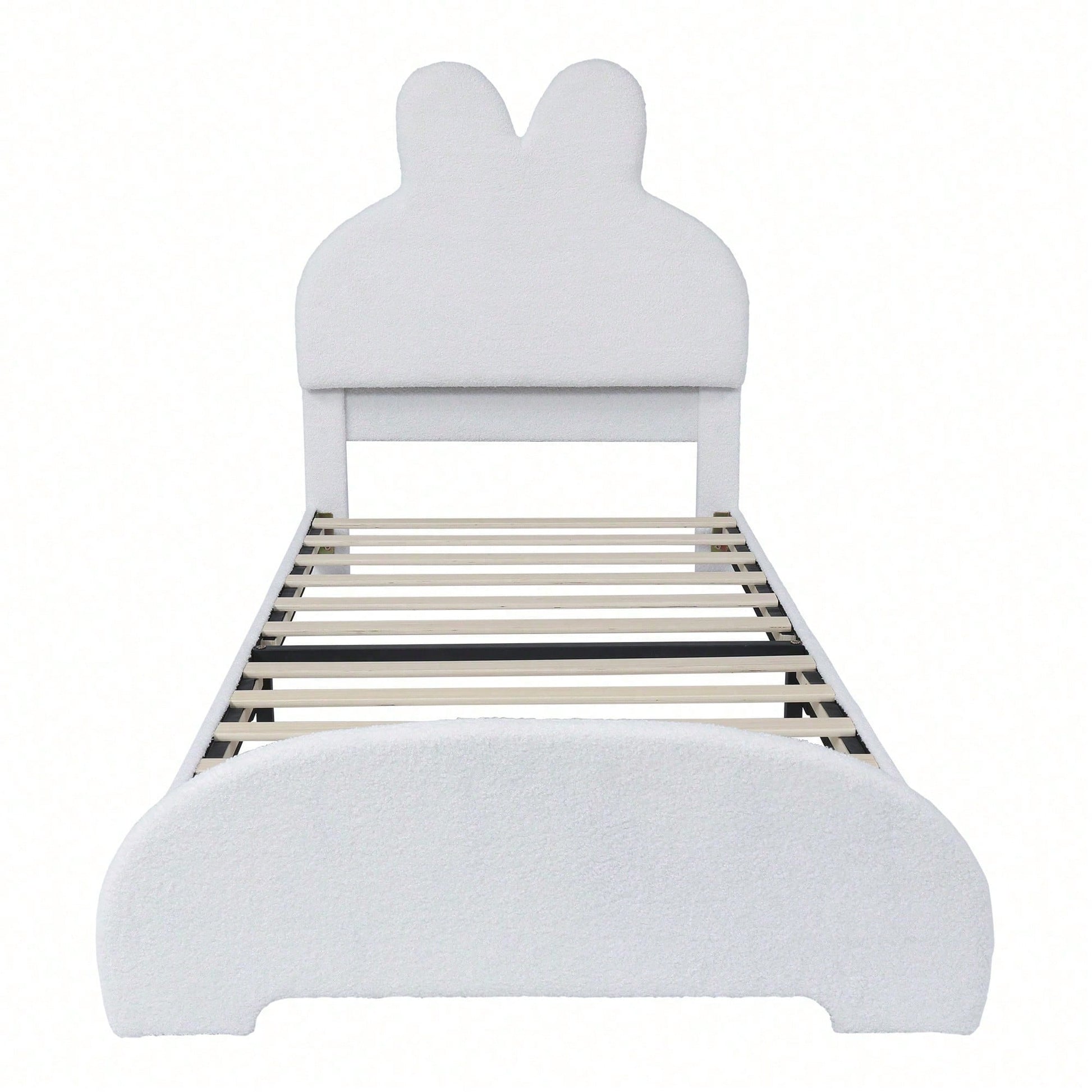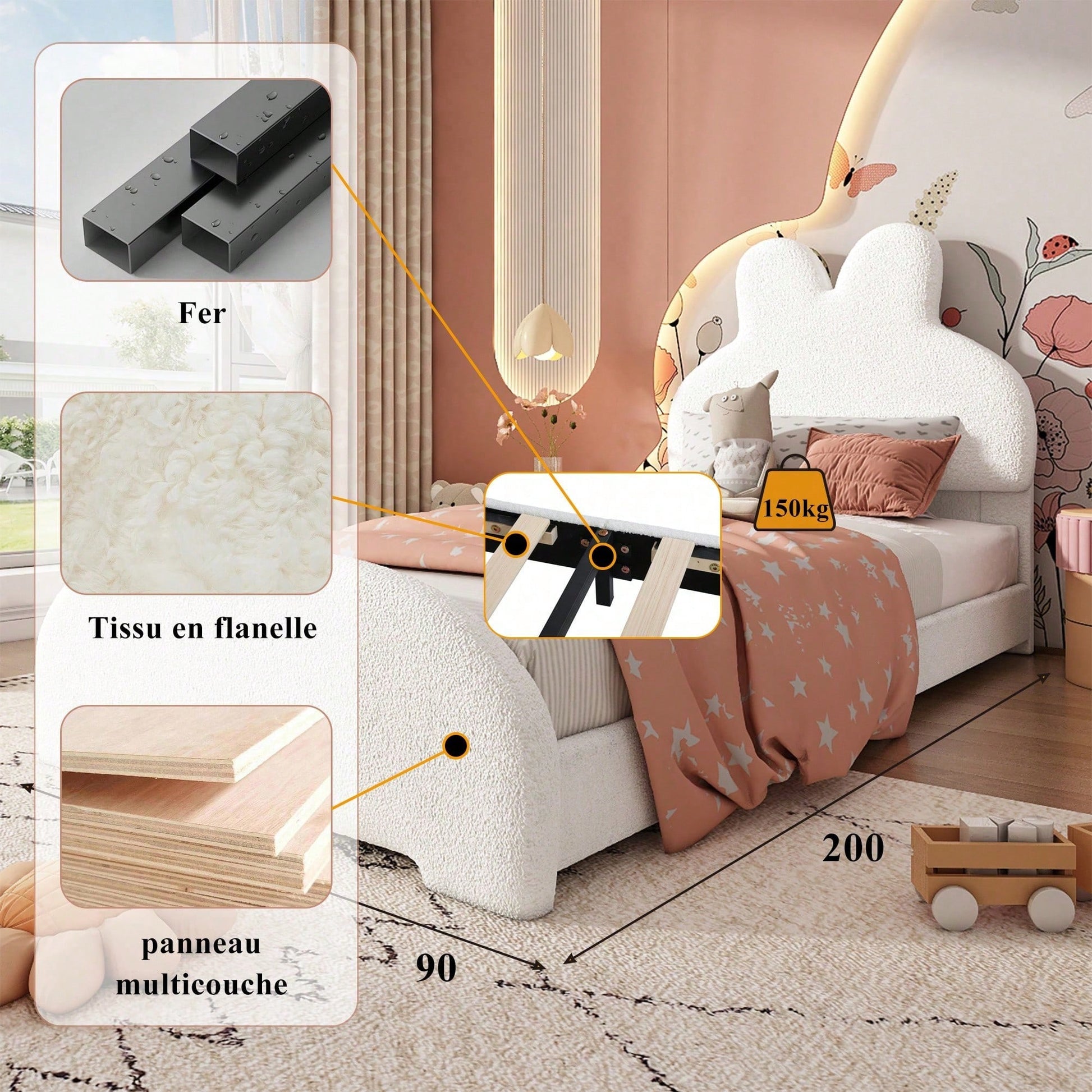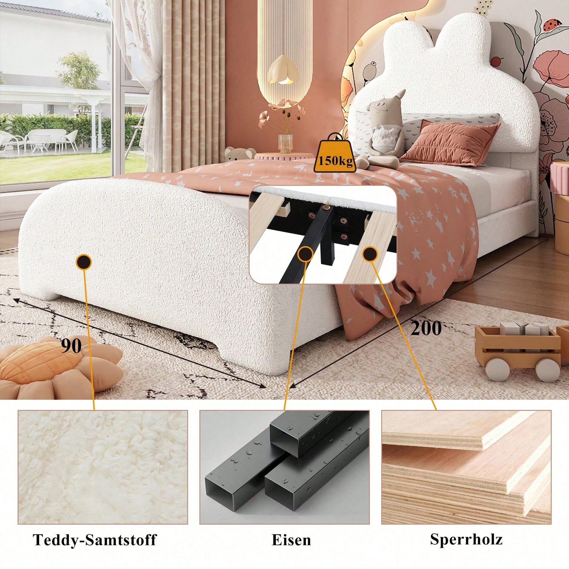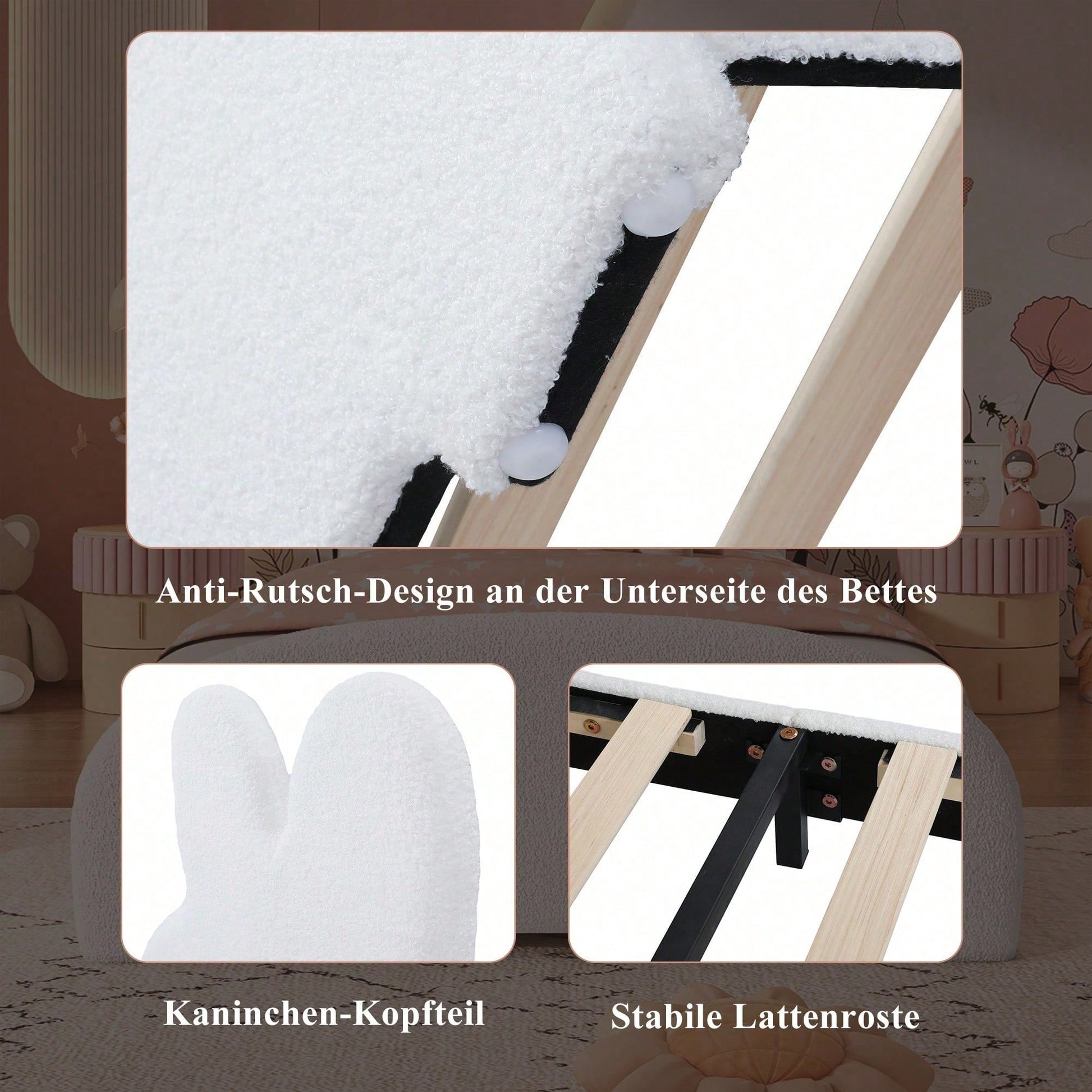 Weißes Einzelbett mit Hasenohren-Kopfteil – Niedliches Cartoon-Design, Flauschiges Vliesimitat, 90x200 cm – Stilvoll & Gemütlich