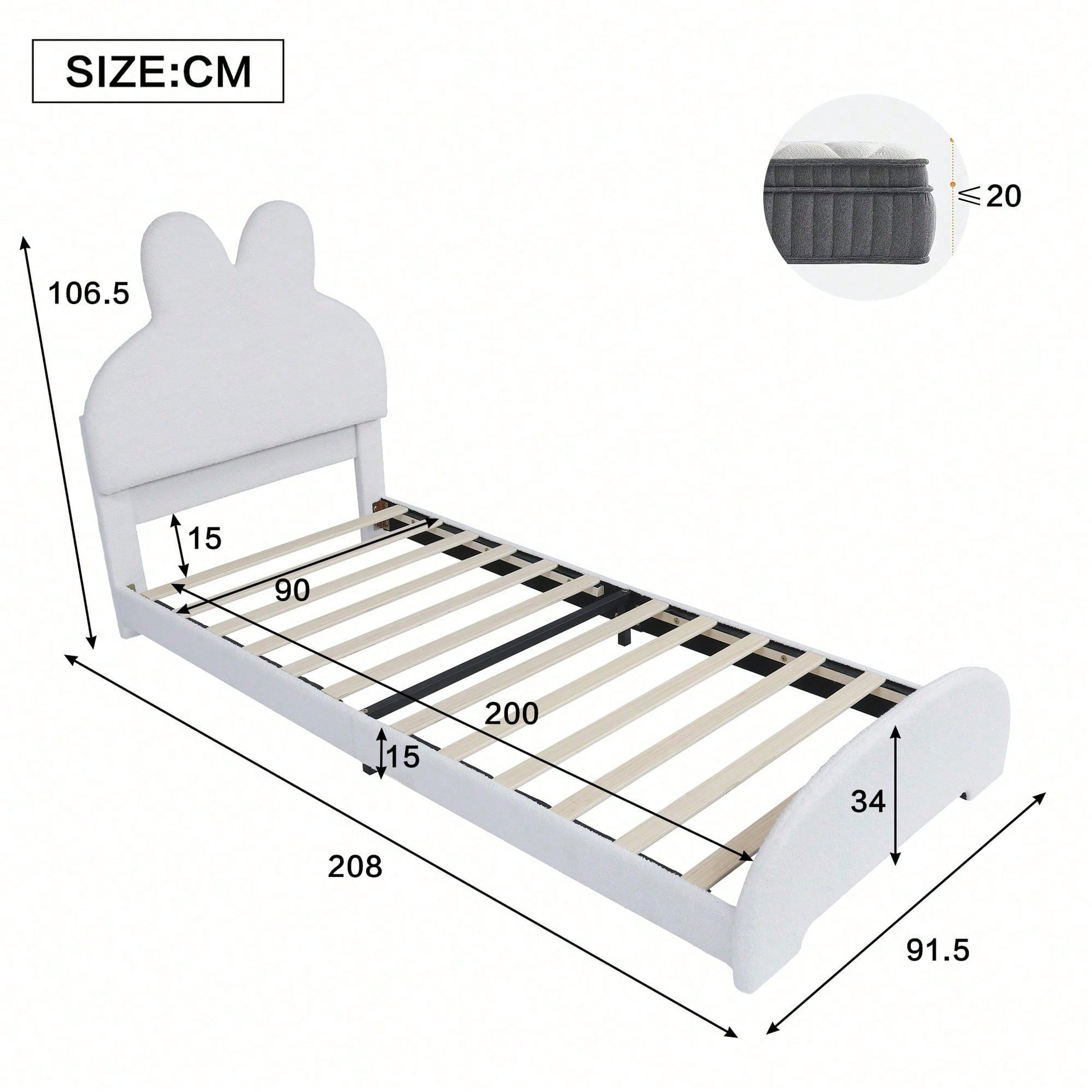 Specification Product Information Item Code: N622P298107W Product Type: Single Box Product Product Name: Einzelbett Polsterbett, Bettkopf in Hasenohrenform, einfach, stilvoll und bequem, Cartoon niedlich Stil, Vliesimitat, Weiß, 90x200cm Place of Origin: China Main Color: White Main Material: Velvet Bed Size: 90cm*200cm Product Dimensions Assembled Length (cm): 208.00 Assembled Width (cm): 91.50 Assembled Height (cm): 106.50 Product Weight (kg): 21.00 Package Size Length (cm): 104.50 Width (cm): 73.08 Height (cm): 12.50 Weight (kg): 23.70 Product Features
