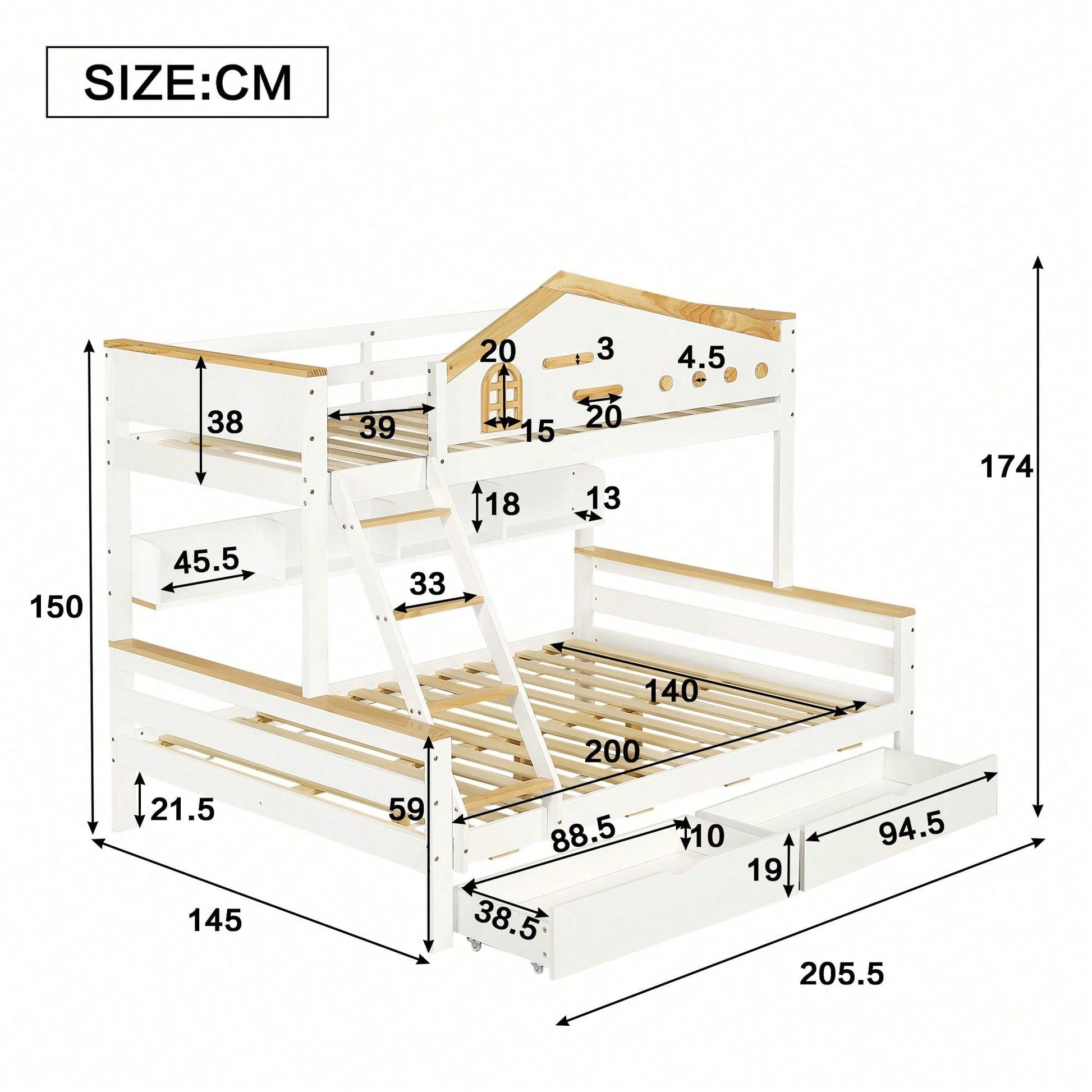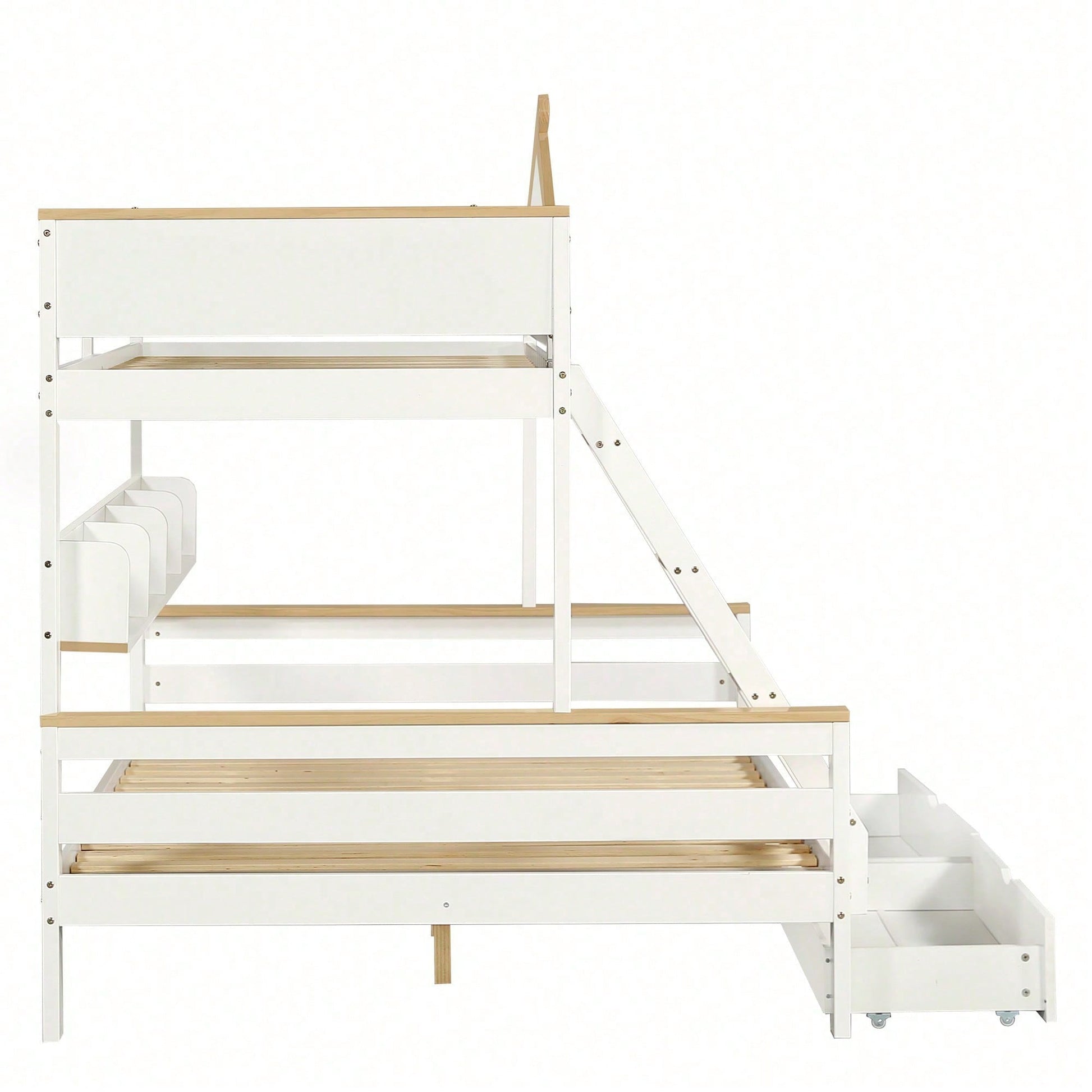 Weißes Etagenbett mit Natur-Akzenten – Sicherheitsgitter, 4-Stufen-Schrägleiter & Schubladen (Kiefer/MDF, 90x200+140x200 cm) – Kinderbett mit Fenster & offenem Regal
