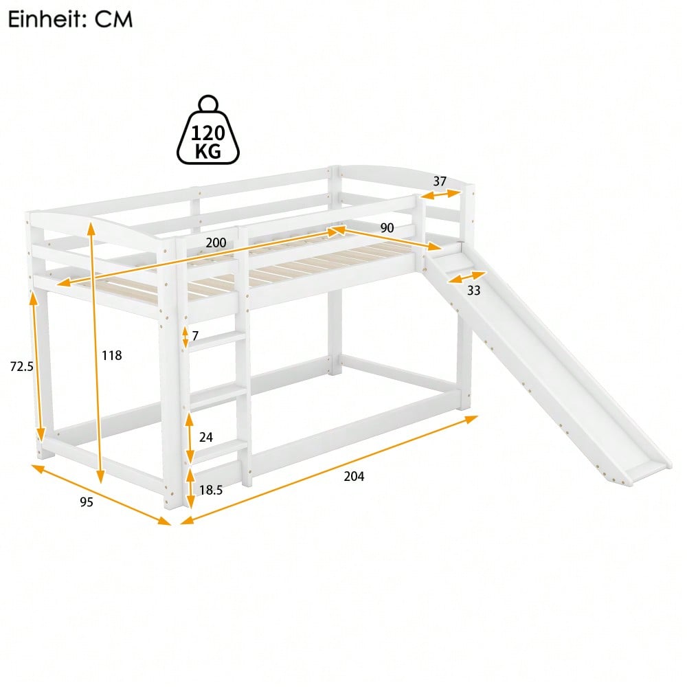 [Raumsparend]- Dieses Etagenbett ist für Wohnungen mit niedrigen Decken geeignet. Durch die Nutzung des vertikalen Raums spart dieses Etagenbett eine Menge Platz und ermöglicht es Ihnen, andere Möbel im Schlafzimmer Ihres Kindes zu platzieren. [Etagenbett mit Rutsche] - Dieses Kinderetagenbett ist mit einer Leiter und einer Rutsche ausgestattet, über die Ihr Kind vom oberen Etagenbett auf- und absteigen kann. Mit einer niedrigen Rutsche, auf der Ihr Kind spielen kann, bringt dieses Holzetagenbett Spaß in den Alltag Ihres Kindes. Die Rutsche und die Stufenleiter sind umbaubar und können auf der linken oder rechten Seite angebracht werden. [Massiver Holzbettrahmen] - Das Etagenbett ist aus einem massiven Kiefernbettrahmen gefertigt. Das obere Stockwerk hat 15 Latten und ist sehr stützend für Kinder und Jugendliche und kann bis zu 120 kg tragen. Die neutrale Farbe ist sowohl für Jungen als auch für Mädchen geeignet und kann über einen langen Zeitraum sicher genutzt werden. [Für die Sicherheit Ihres Kindes] - Die Treppe mit Geländern um das obere Bett herum verleiht dem Bett Stabilität und gewährleistet die Sicherheit Ihres Kindes. Darüber hinaus sorgen die massiven Kiefernholzbeine für zusätzliche Stärke und Haltbarkeit. [Einfach zu installieren]- Das Etagenbett hat detaillierte Anweisungen und nummerierte Teile, um die Installationszeit und -schwierigkeiten zu reduzieren. Etagenbett für Kinder und Jugendliche, Kinderbett mit Rutsche, Massivholzrahmen, einfache Montage Dieses Etagenbett hat einen minimalistischen Stil und ist einfach zu montieren. Es ist erwähnenswert, dass dieses Doppelbett mit einer Rutsche kommt, Ihr Kind wird das Design lieben und fügt Spaß zu ihrem täglichen Leben. Der Rahmen des Bettes ist aus Kiefernholz gefertigt, was eine jahrelange Nutzung und Stabilität des Bettes ermöglicht und Ihrem Kind viel Sicherheit bietet. Das obere Bett ist von einem Geländer umgeben, so dass Ihr Kind unbesorgt darauf schlafen kann. Außerdem kann die Position der Treppe und der Rutsche ausgetauscht werden und beide können auf der rechten oder linken Seite angebracht werden. In neutralen Farben für Jungen und Mädchen, lassen Sie sich dieses wunderbare Bett nicht entgehen! Beschreibung + Maße Material: Kiefernholz + MDF Farbe: Grau / Weiß Nummern der Pakete: 2 Montage erforderlich: Ja Herkunft: China Produktab Messung: 204 x 95 x 118 cm Paketab Messung: Bitte beachten Sie die Spezifikation Bettab Messung: 90 x 200 cm Höhe: 118cm Anzahl der Lamellen:15 Produktgewicht: 34.8kg Bettgewichtsfähigkeit: 120kg