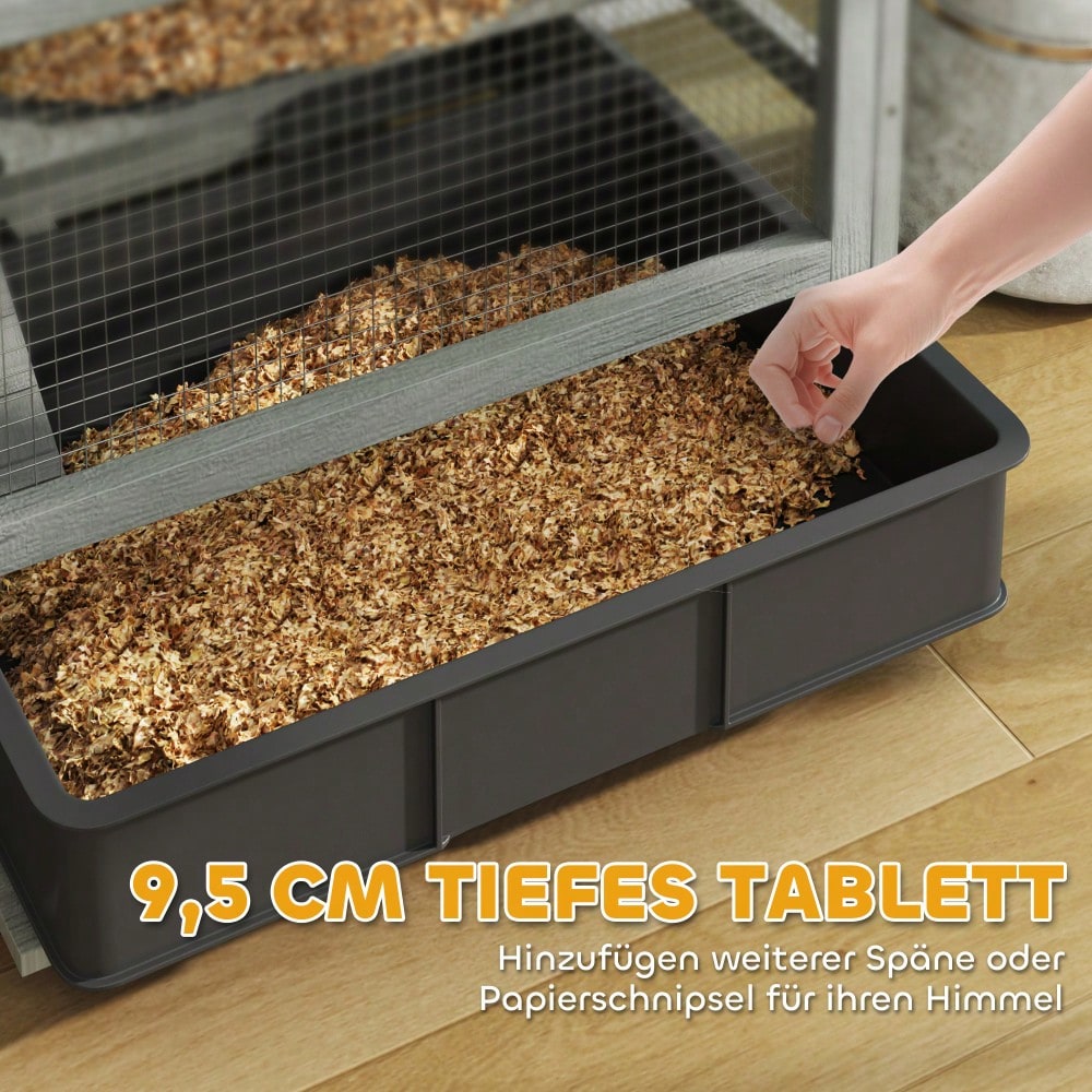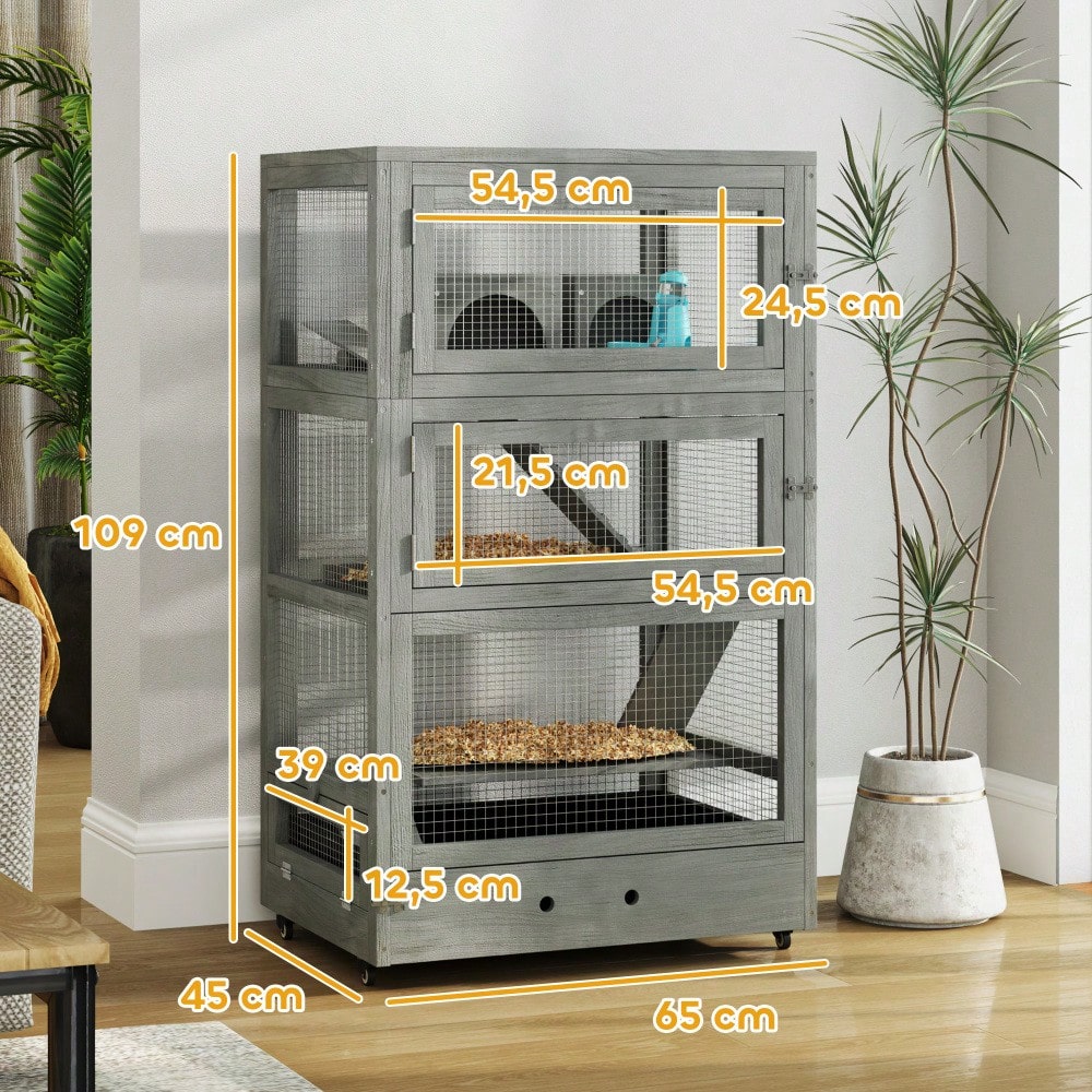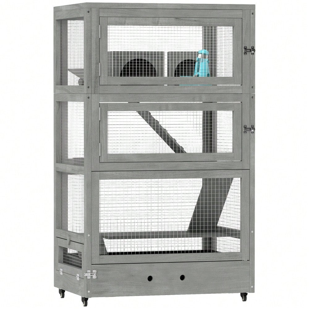 Zwerghamsterkäfig aus Holz mit 4 Etagen, 65x45x109 cm Nagerheim inkl. Hütten, Wippe, Futternäpfen & Rampen, mit Rollen & Schloss - grau von PawHut